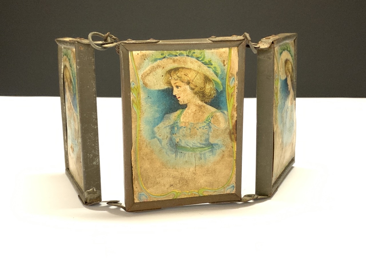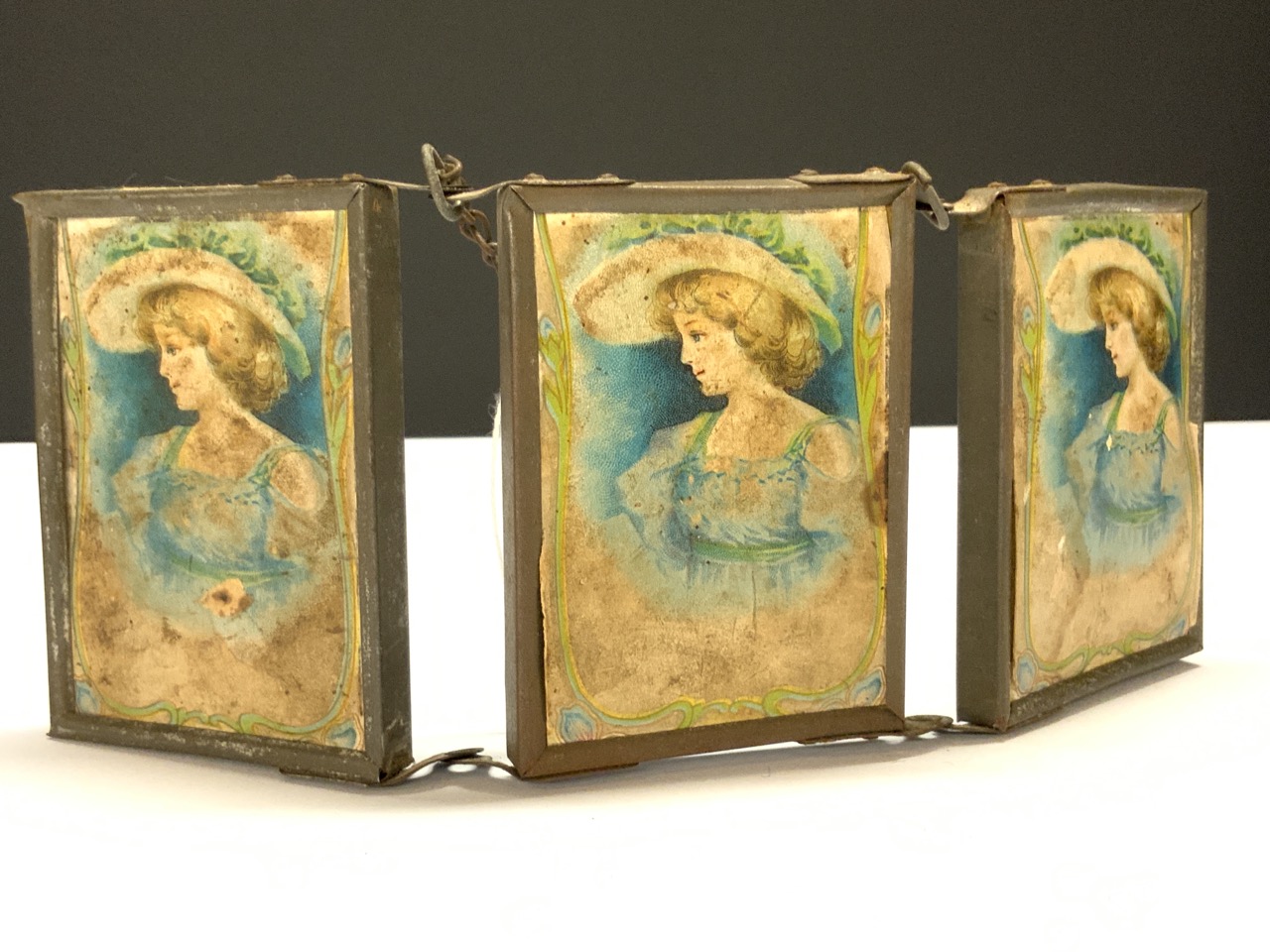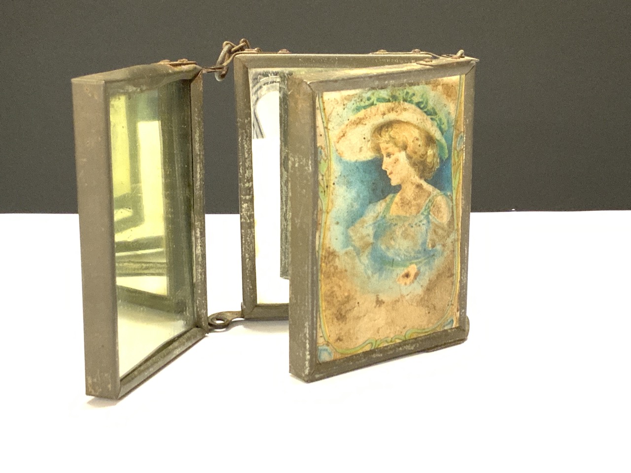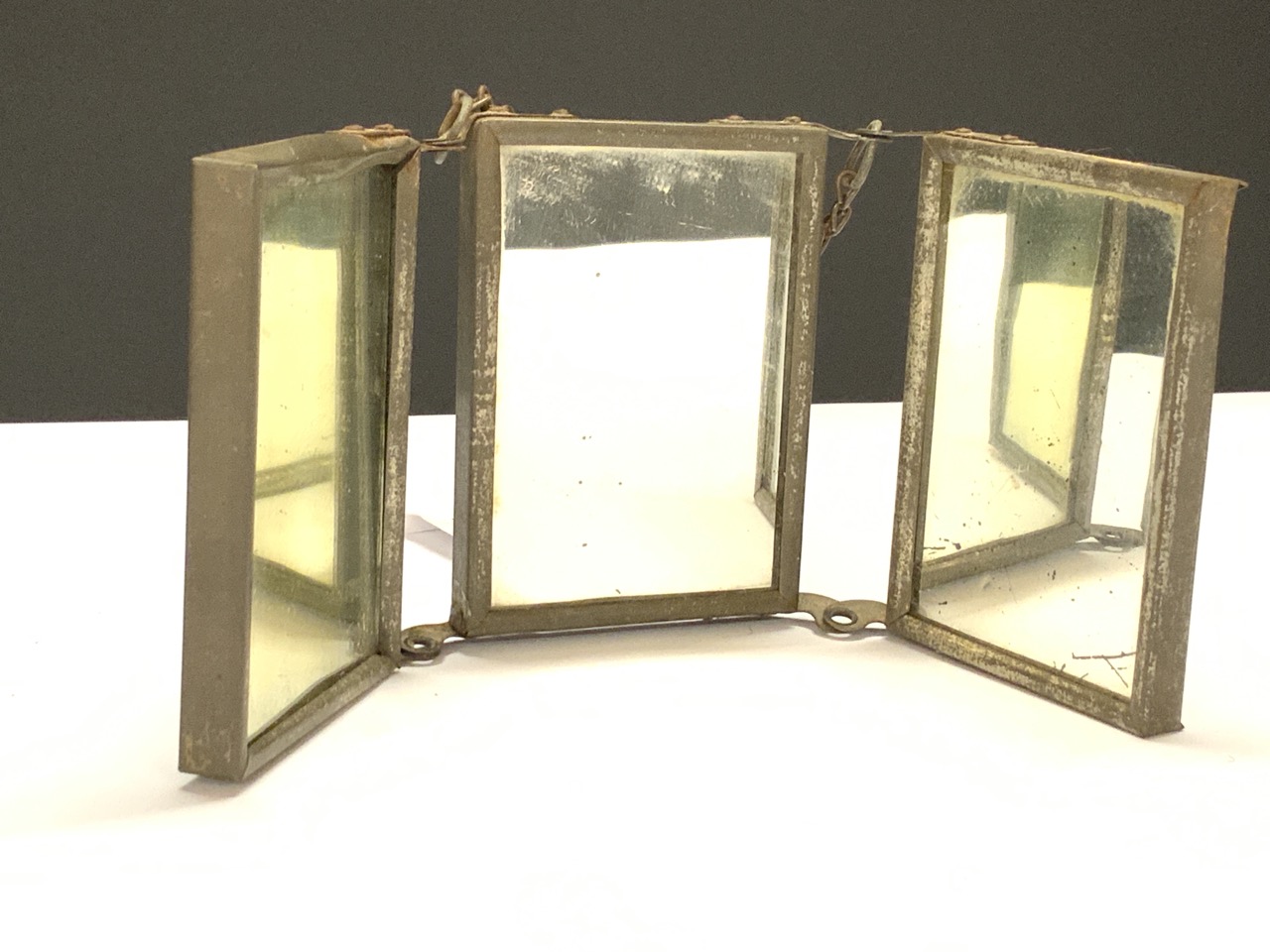 A miniature tri-fold shaving or vanity mirror.