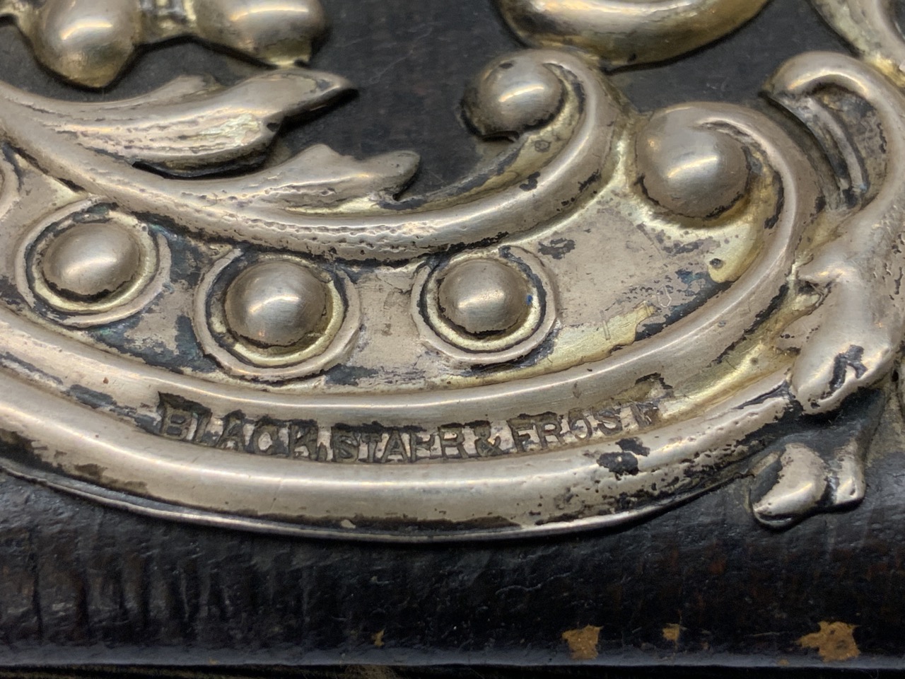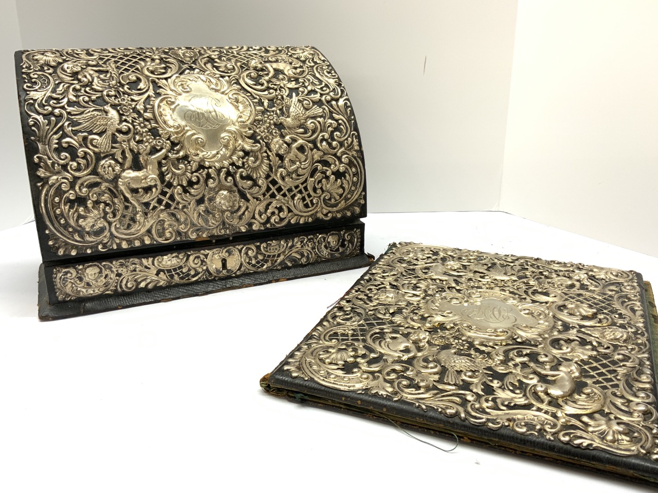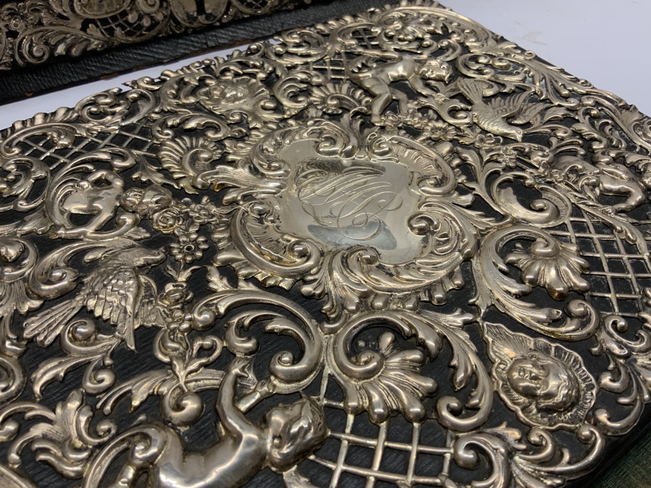 An exceptional highly ornate Black Starr & Frost sterling silver and wood constructed stationary letter box and book cover. Very fine set with letter dated 1959 from Black Starr & Gorham. Please see photograph preview.