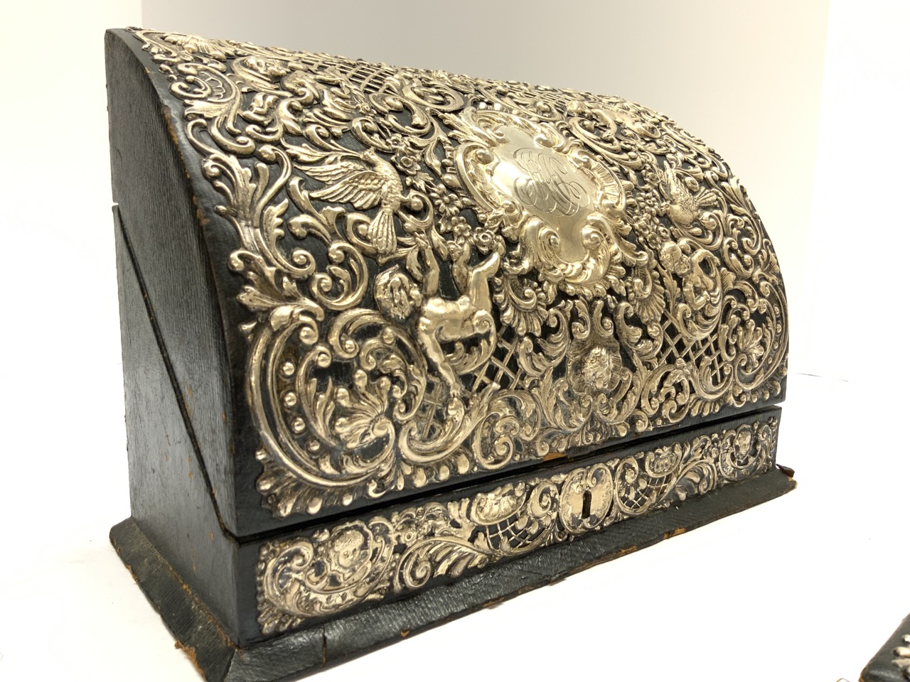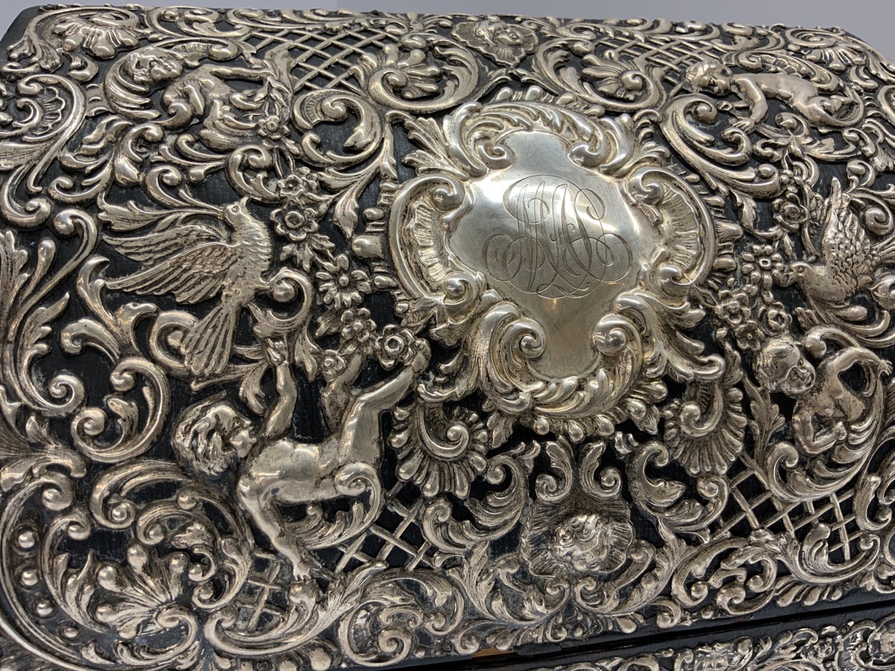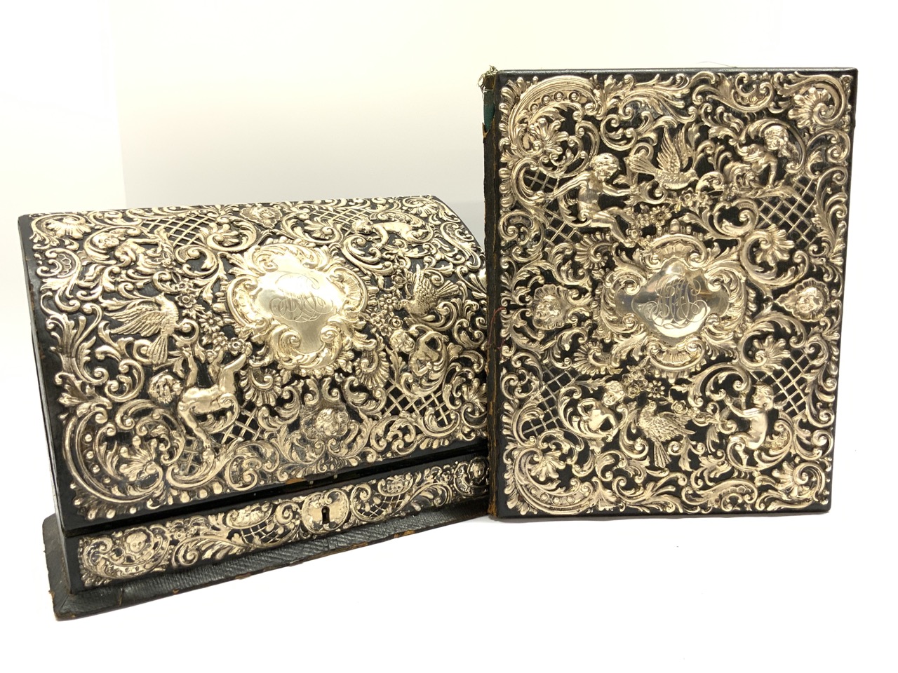 An exceptional highly ornate Black Starr & Frost sterling silver and wood constructed stationary letter box and book cover. Very fine set with letter dated 1959 from Black Starr & Gorham. Please see photograph preview.
