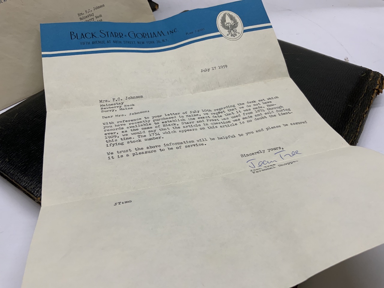 A letter from Black Star And Gorham dated 1959 regarding the desk set which you have recently purchased in Maine we regret that we do not have records available to establish the exact date that it was made however as of the name Black Starr and Frost was used from 1874 to 1929 we would say the article in question was made and sold during this time