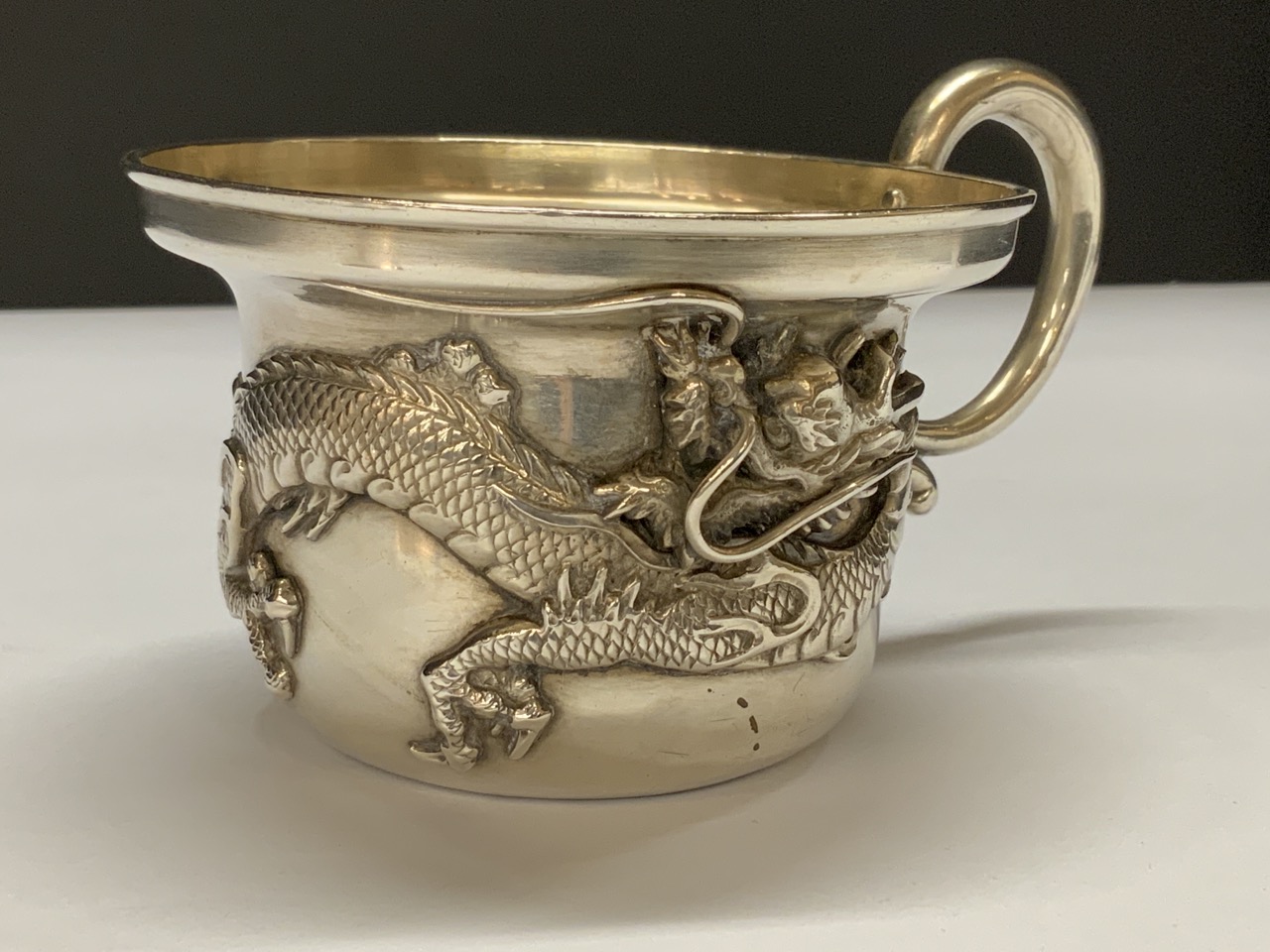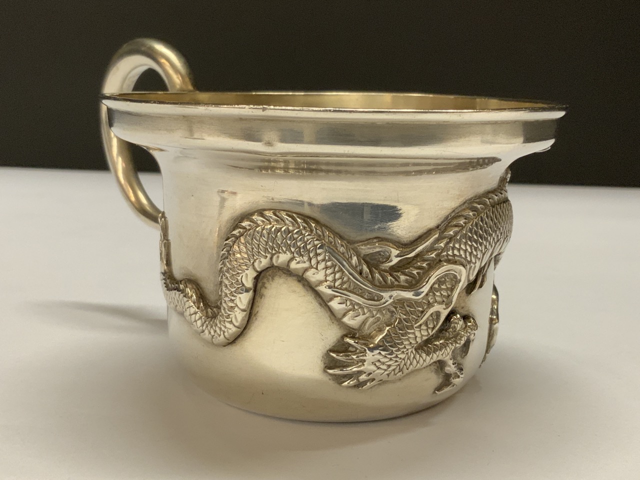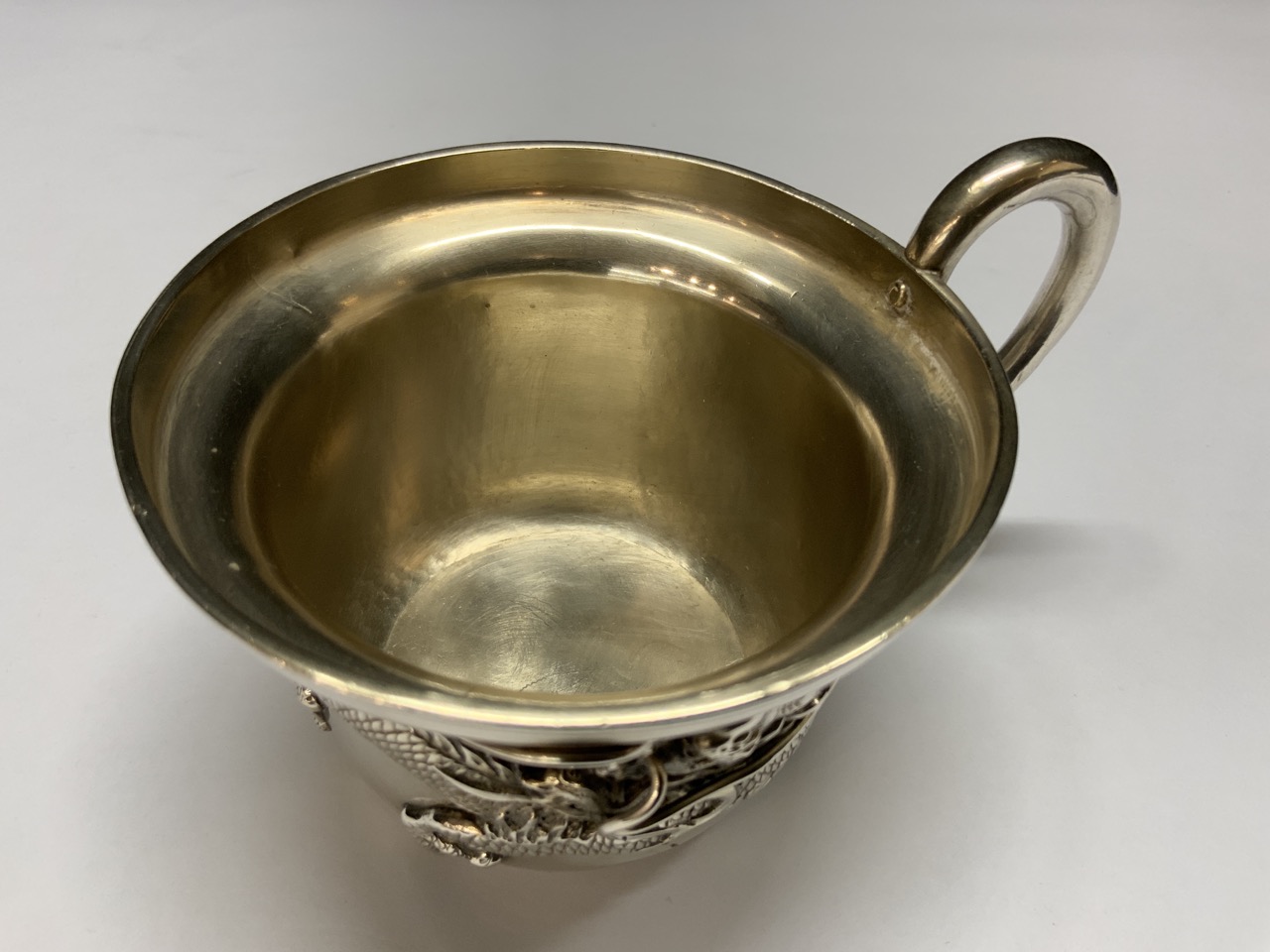 A Chinese silver handled cup with high relief dragon. Signed at base. Early 20th century.
