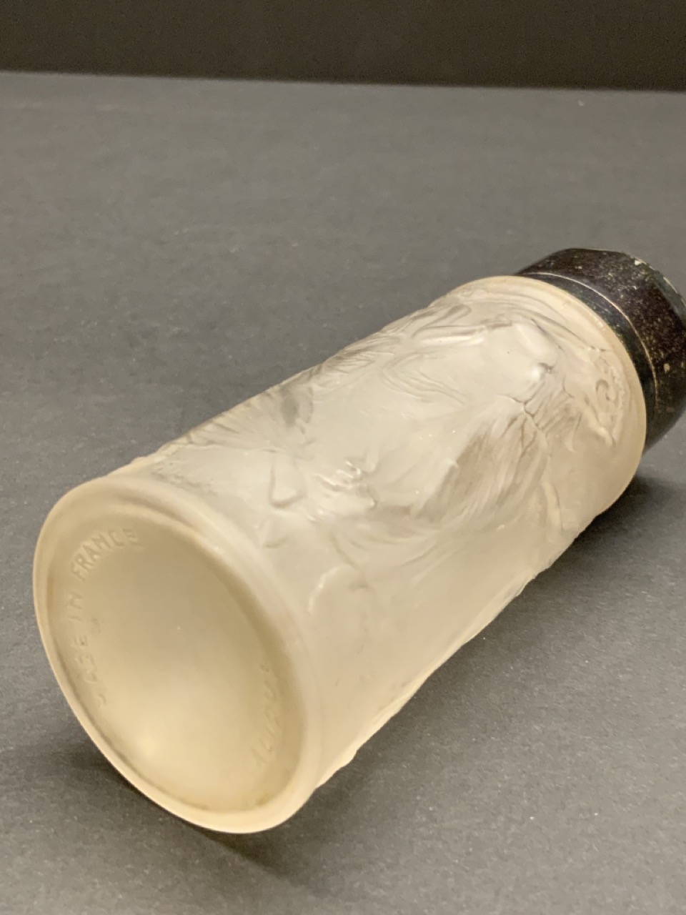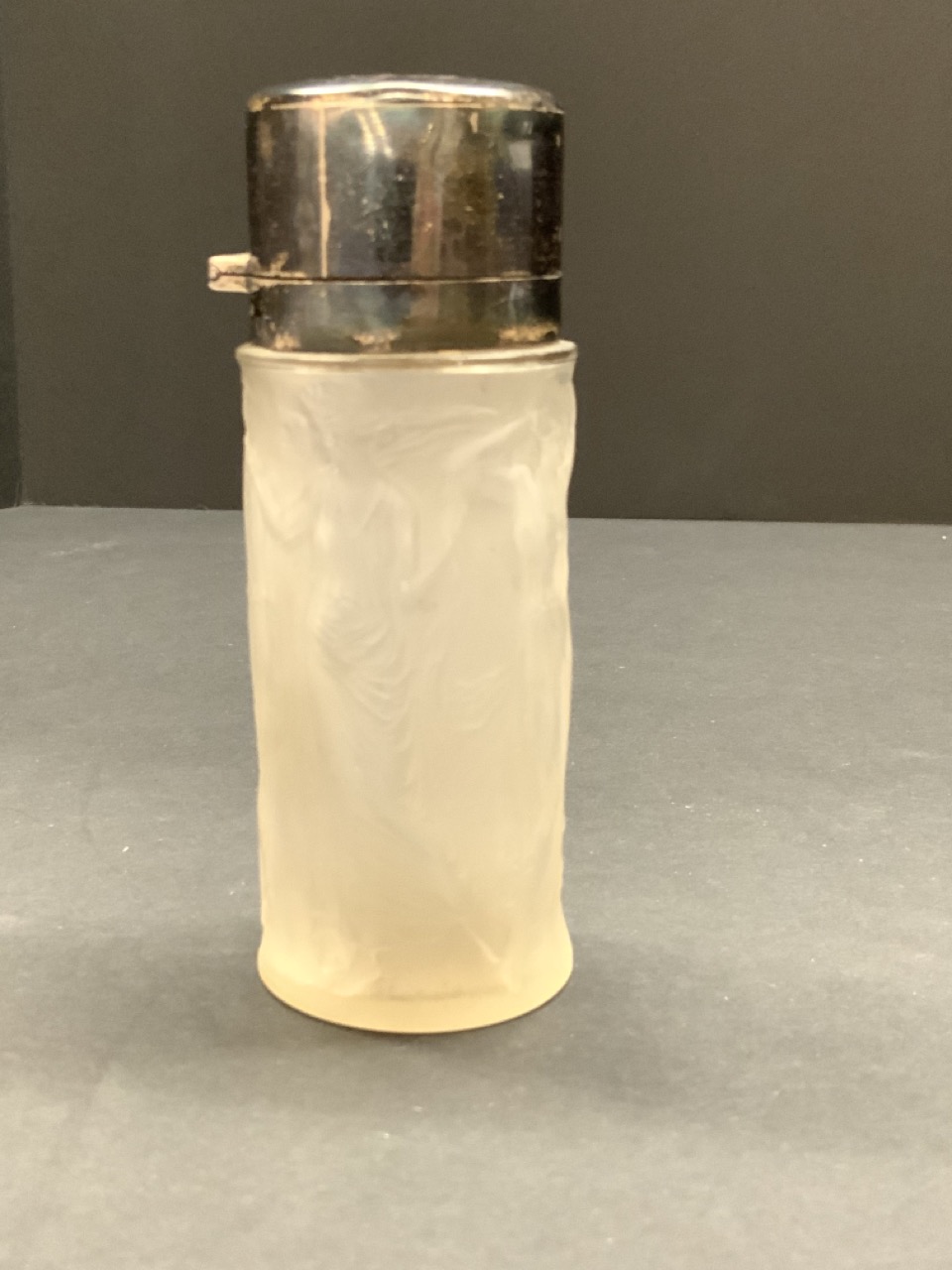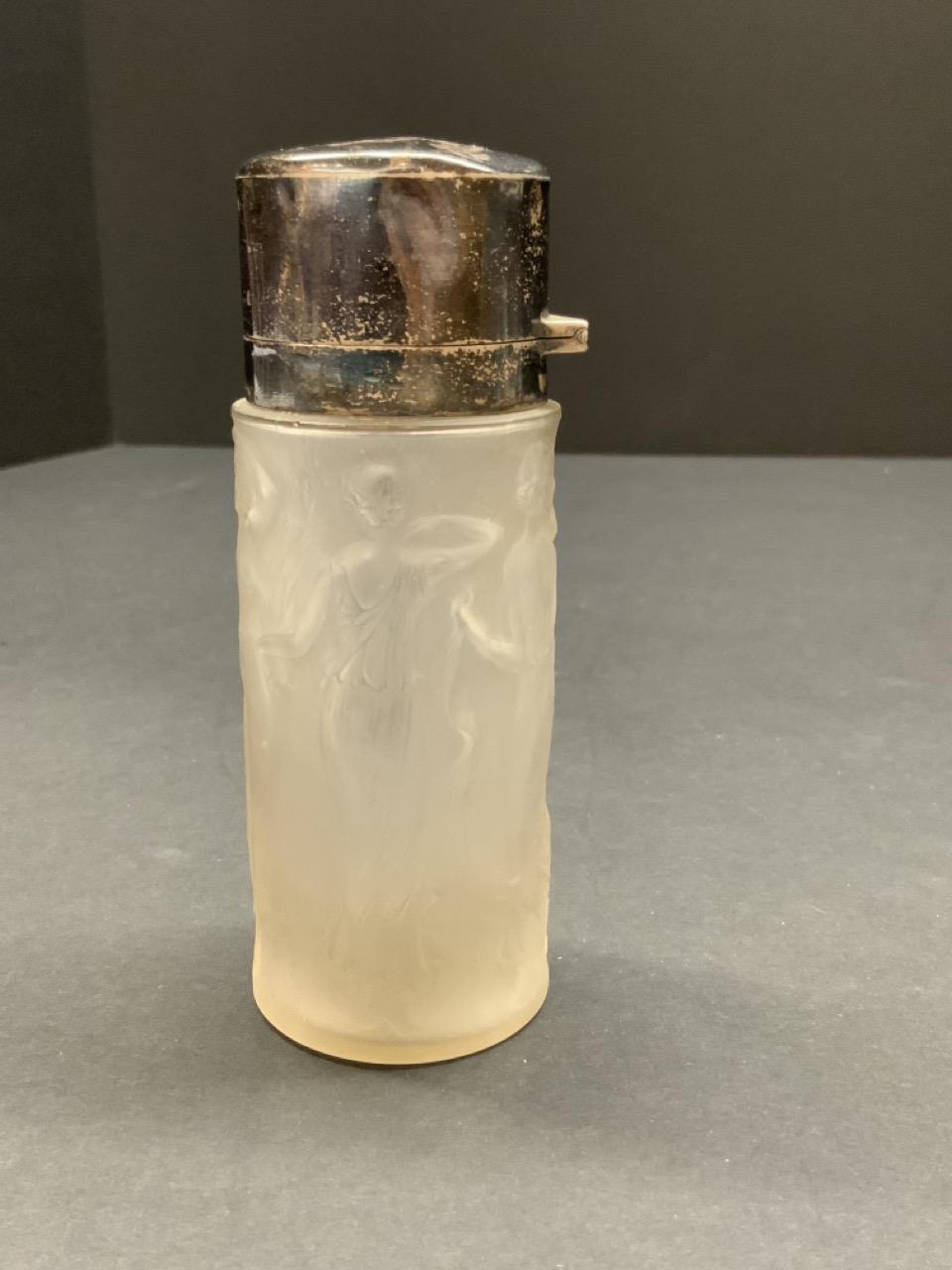 R. Lalique dancing femme perfume bottle with English sterling silver top.