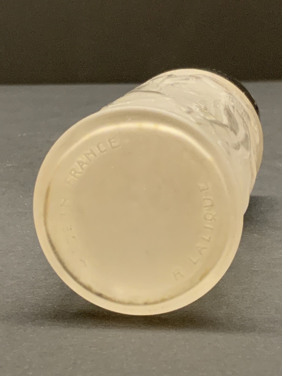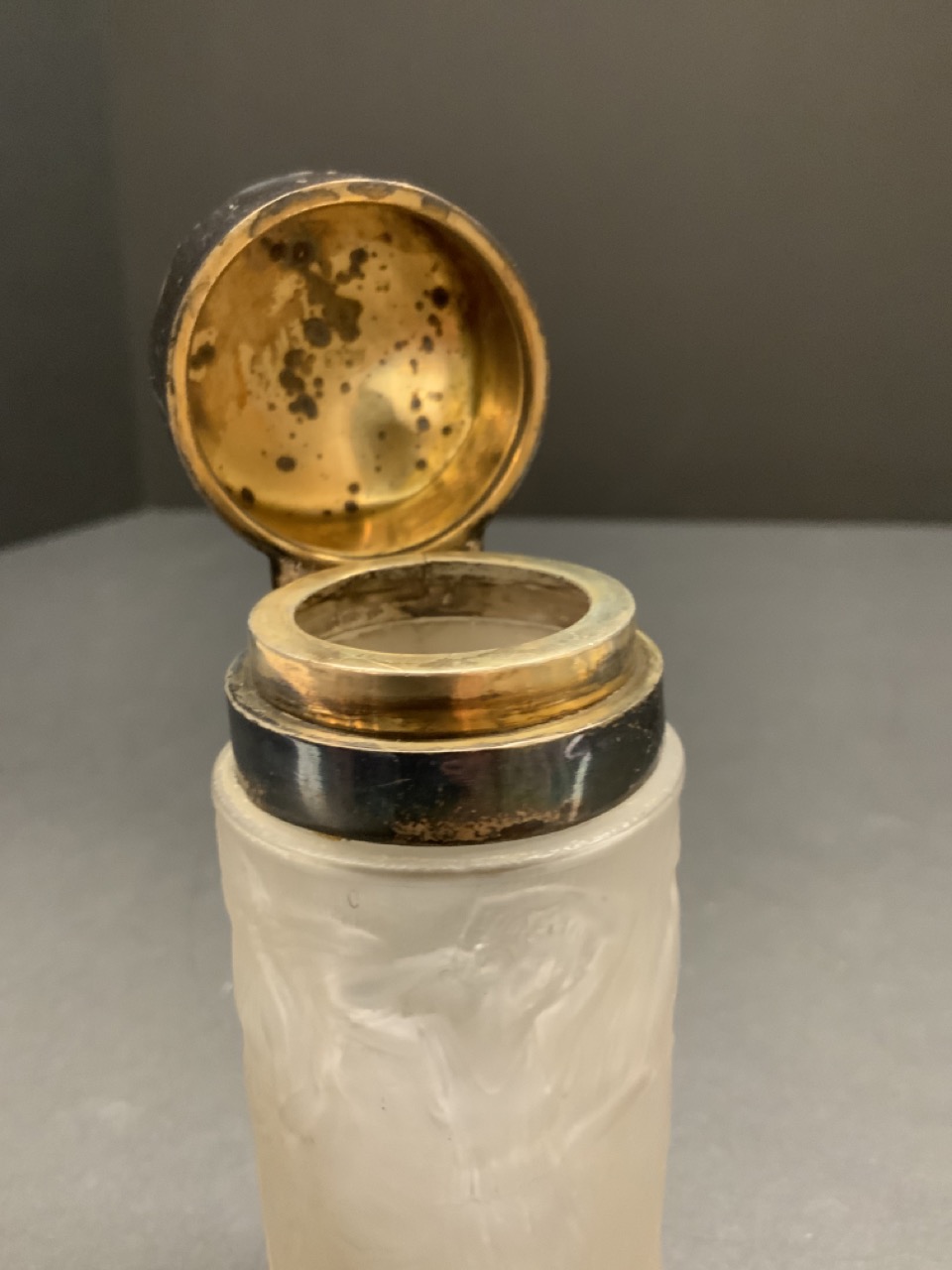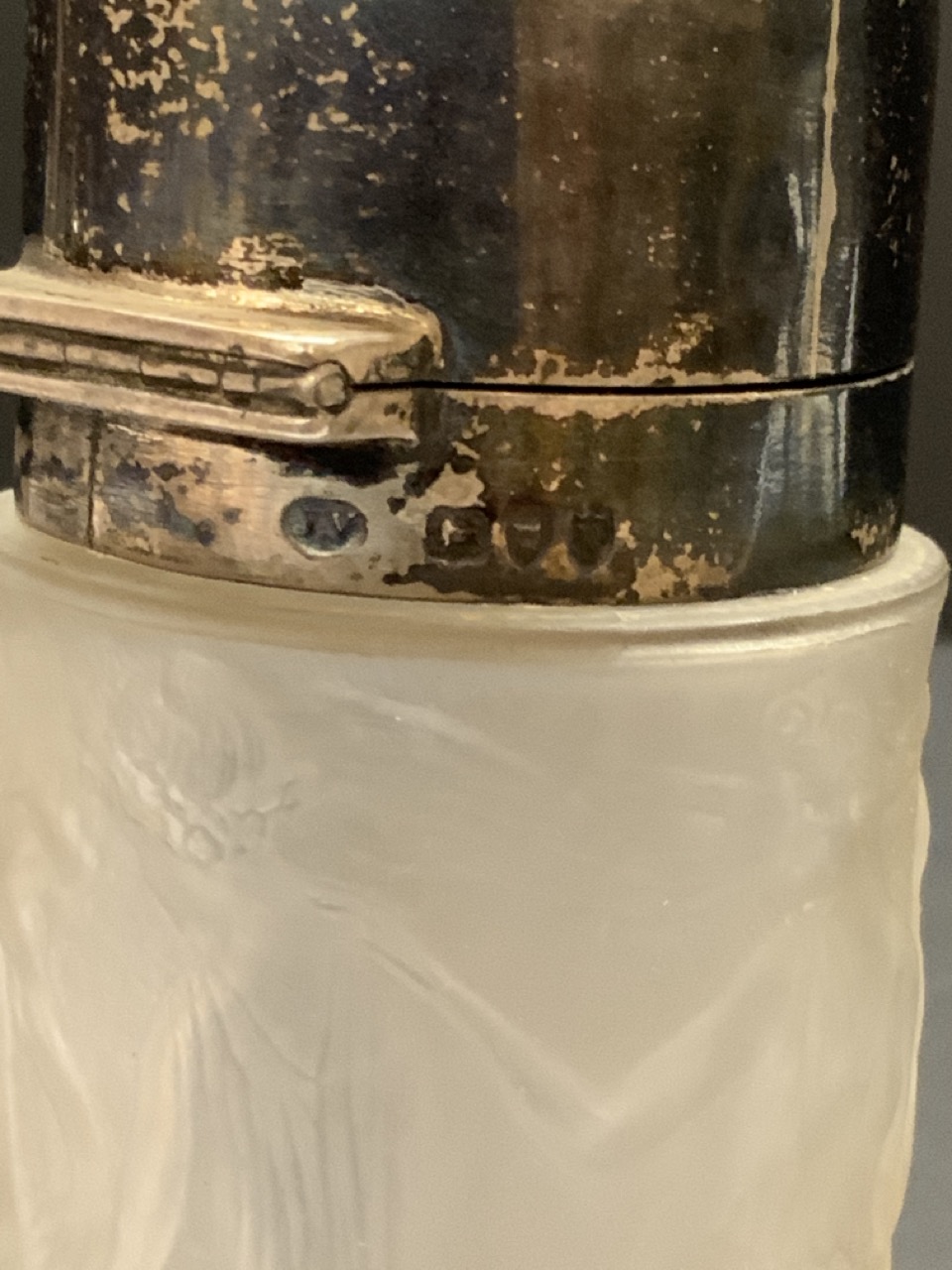 R. Lalique dancing femme perfume bottle with English sterling silver top.