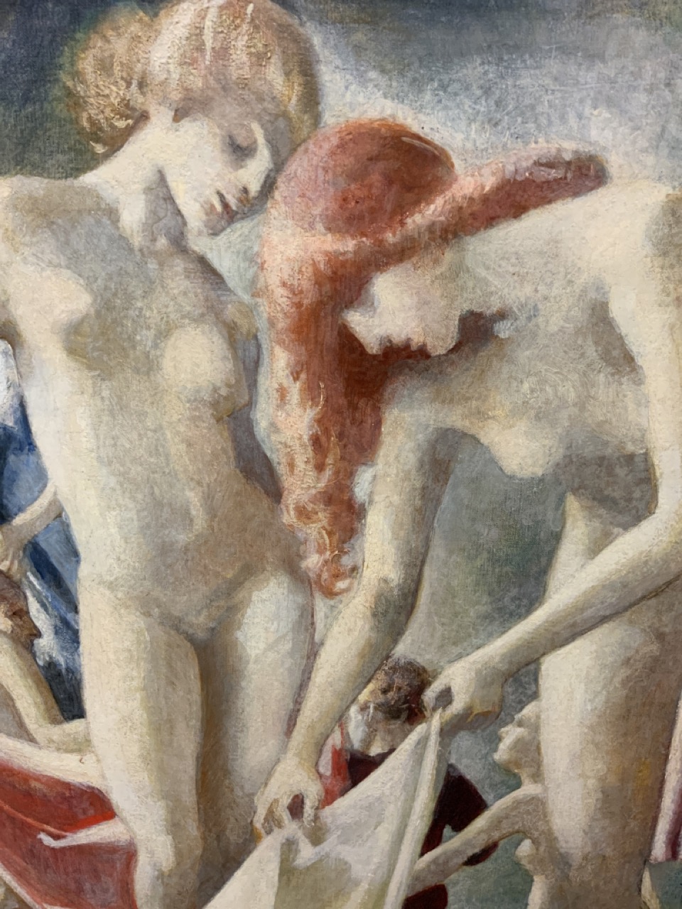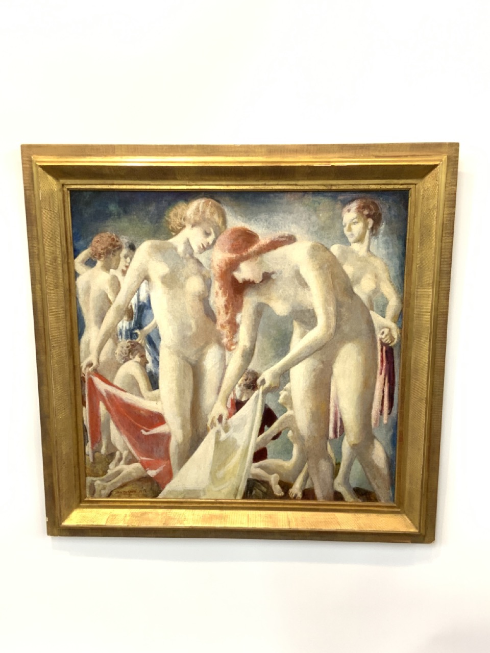 "With their pale bodies and classical hairstyles, these nude bathers suggest ancient sculpture. Folds that in a distant age would have belonged to their garments are transferred to their towels.