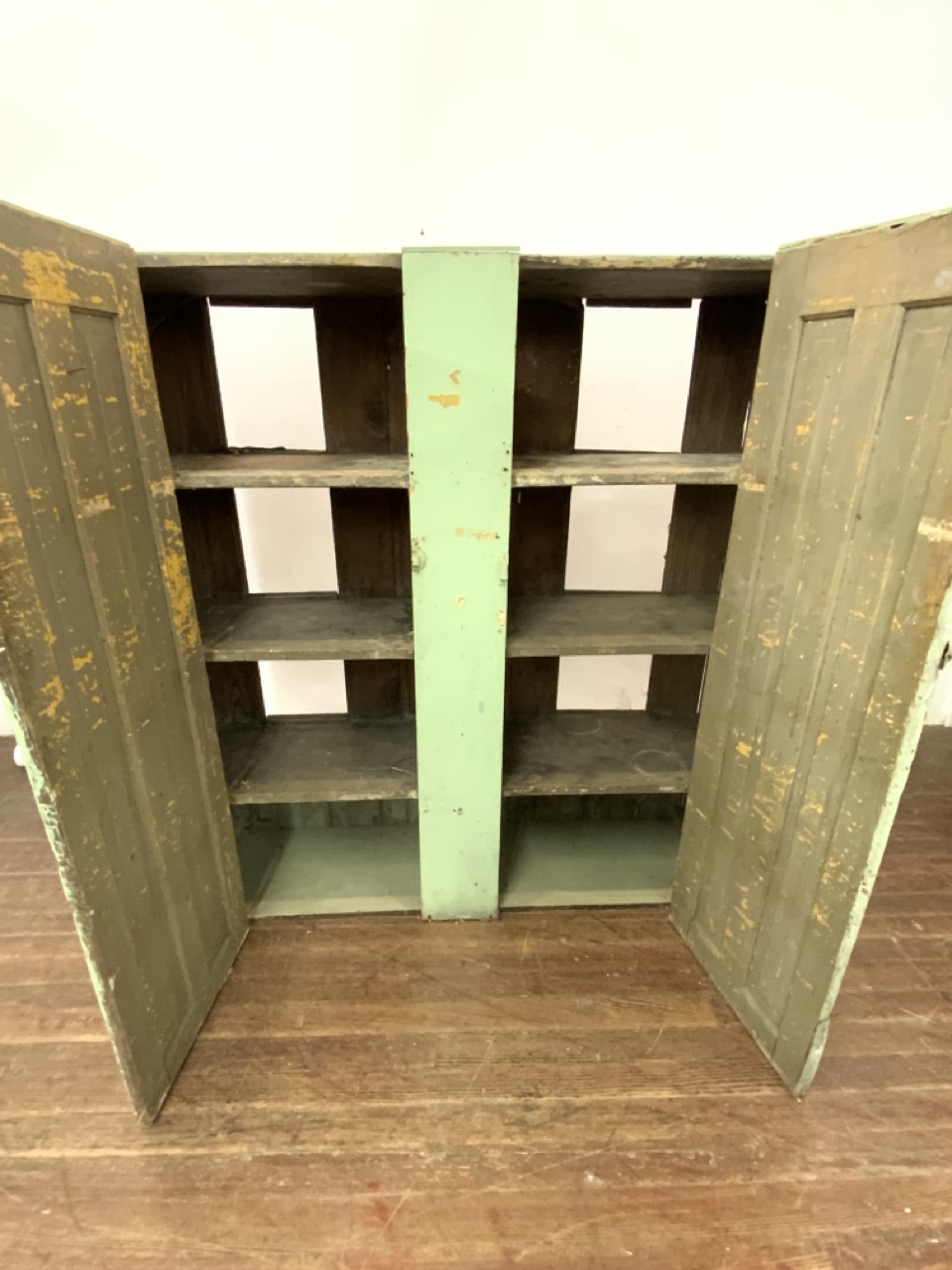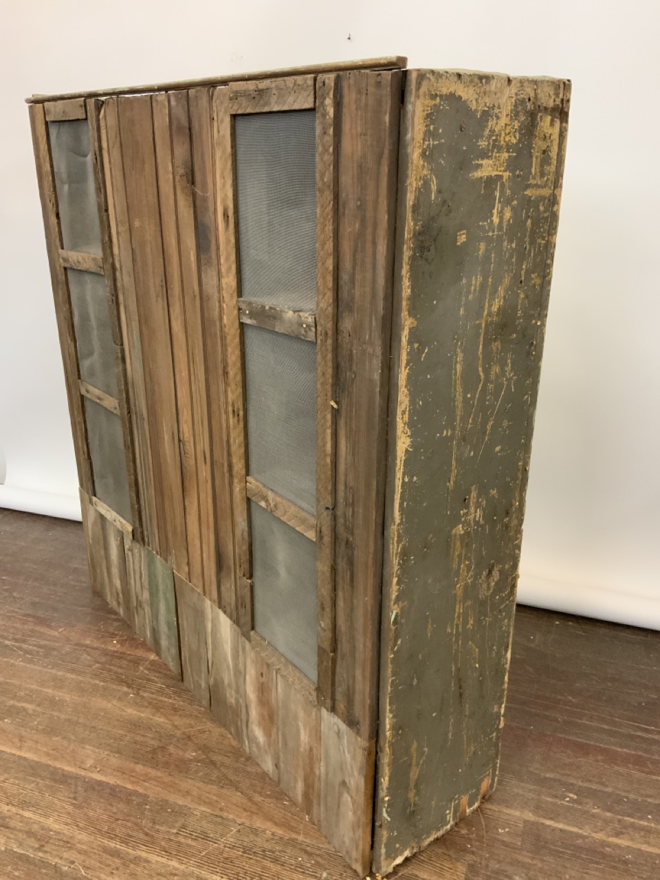 A pine pie safe painted green with two doors in front and screened openings in back.