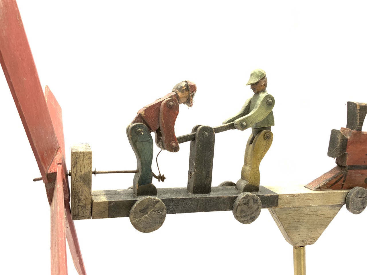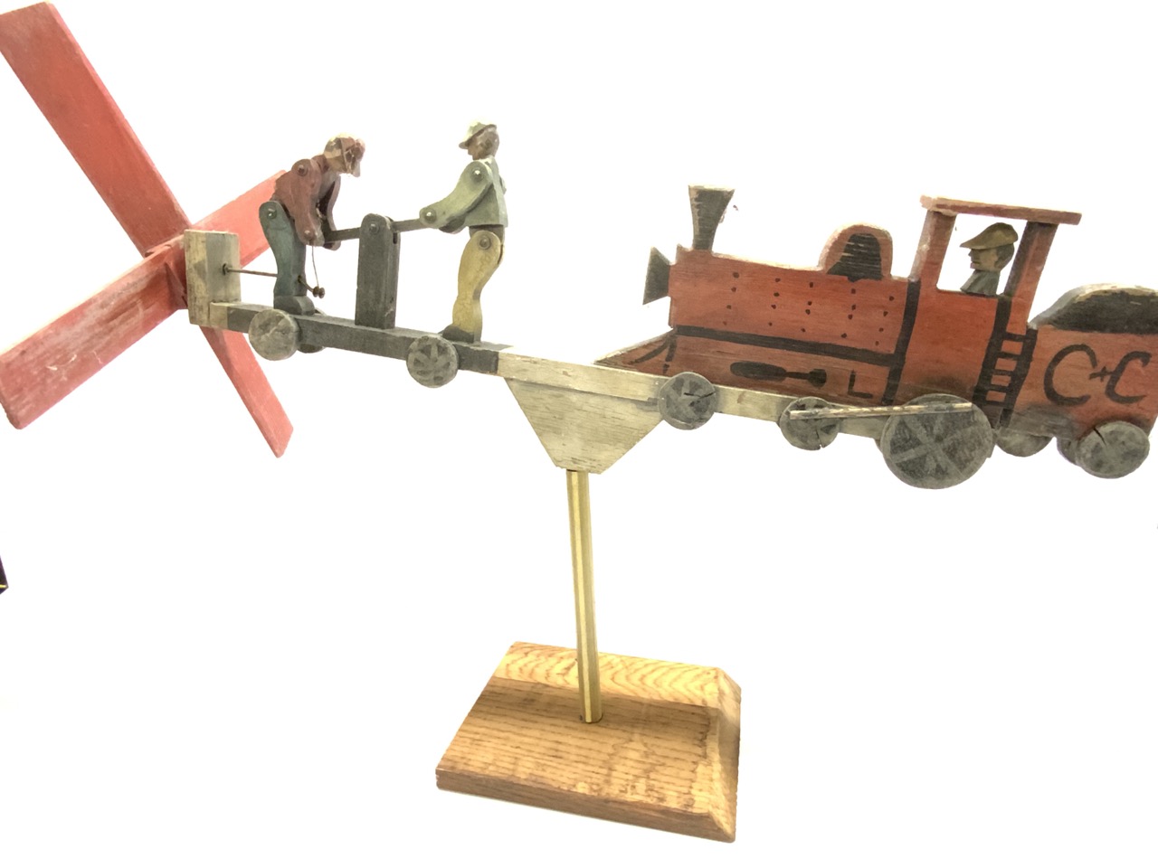An Americana Folk Art Railroad Themed Whirligig. Some weathering from age. Overall very good.