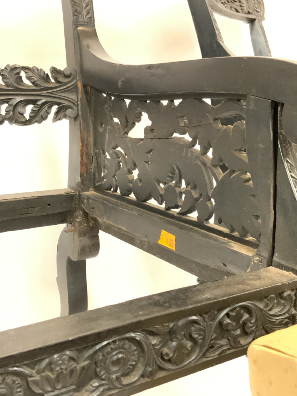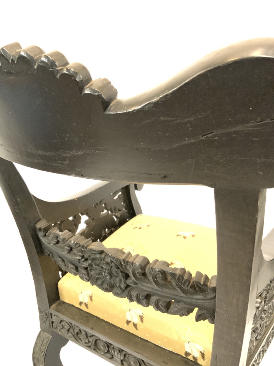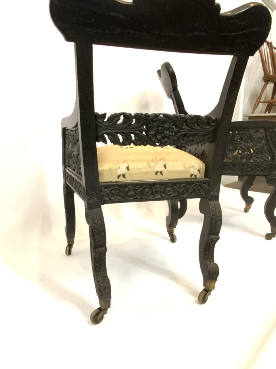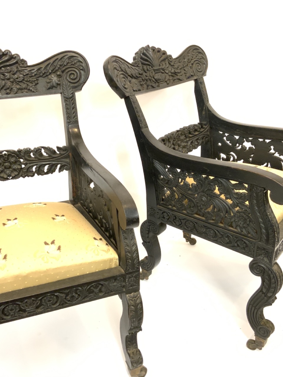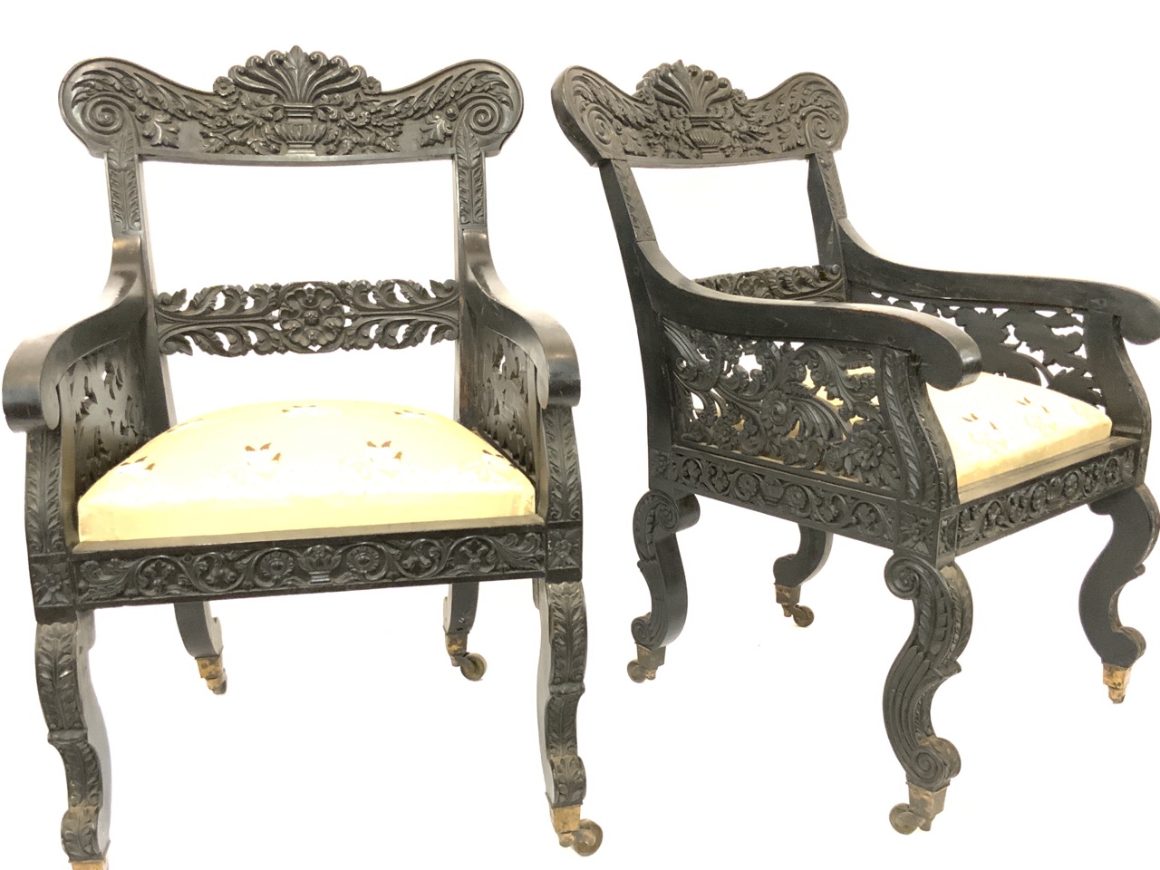 An exceptional pair of 19th century Anglo Indian ebonized carved wood chairs.