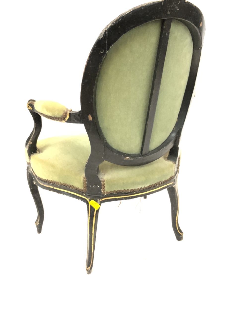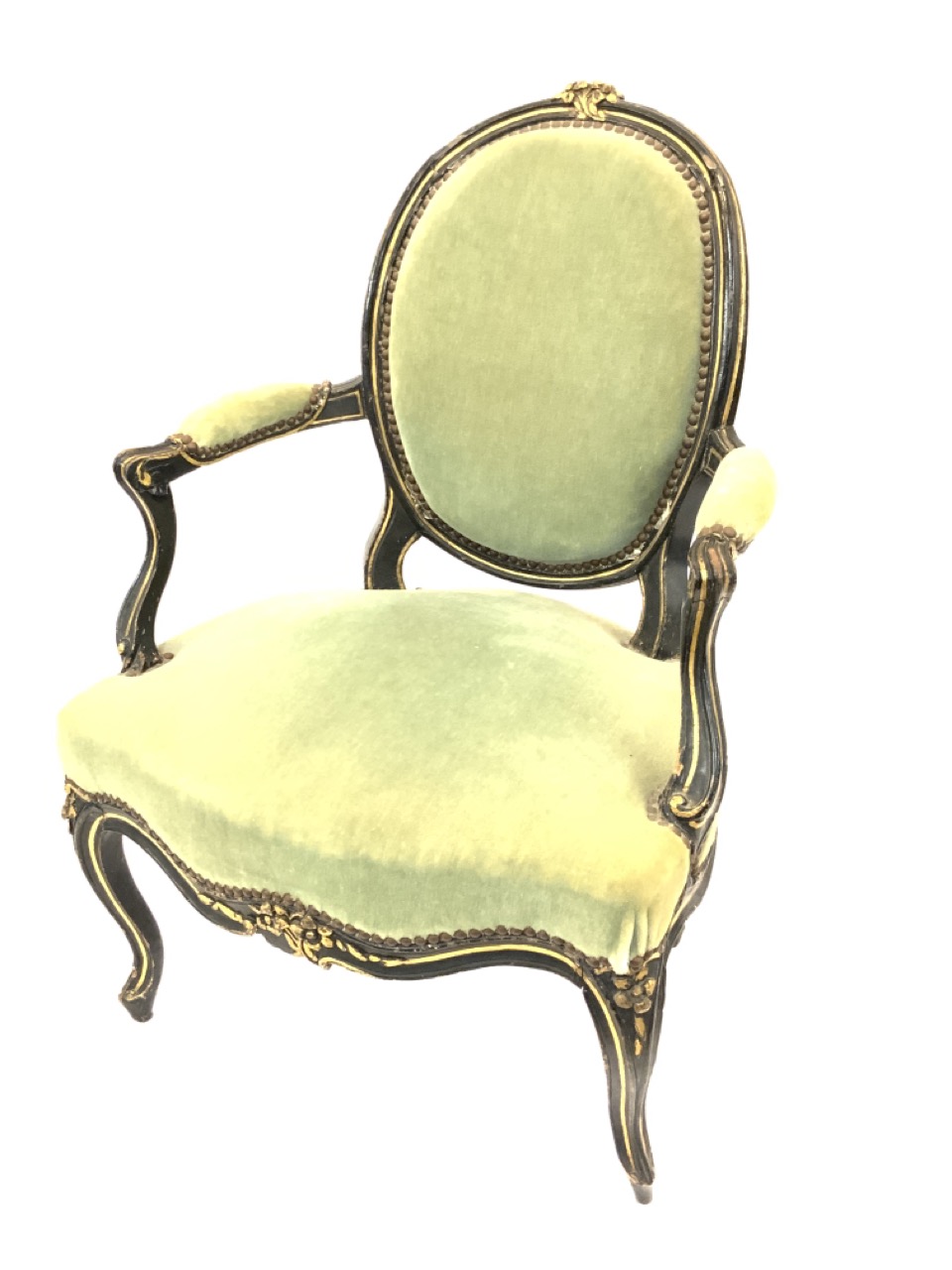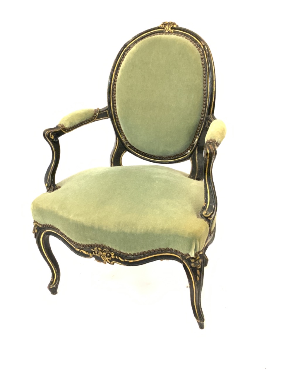 A Louis XV French Bergere style arm chair. Ebonized wood with green upholstery.