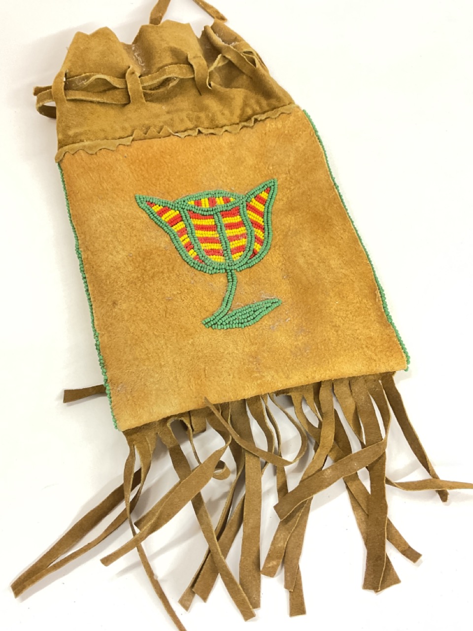 Beaded Indian hide pouch with fringe. Handle strap needs replacement. Early 20th century.