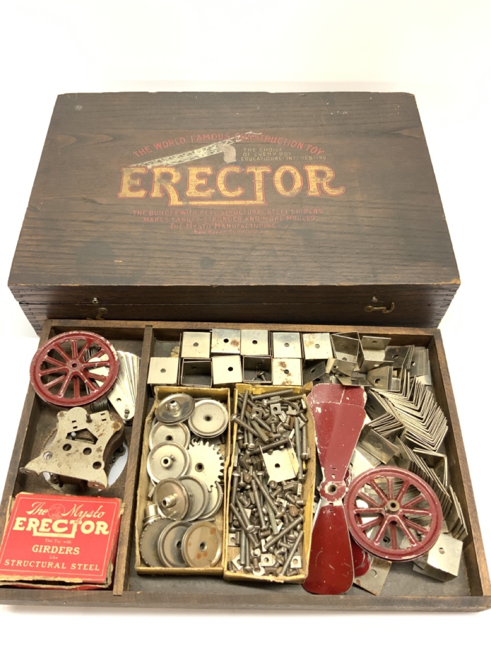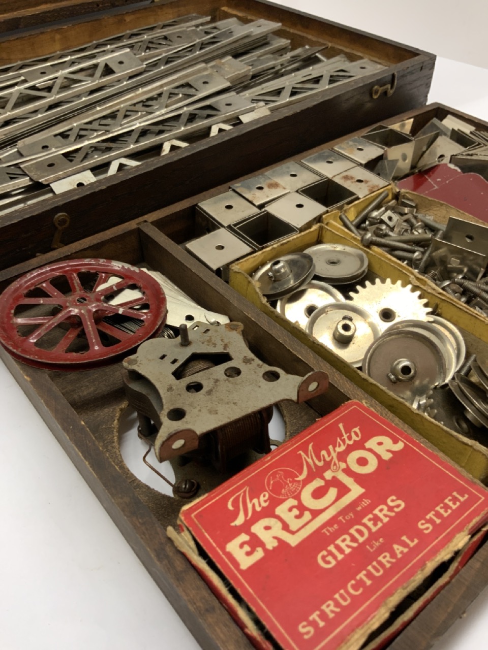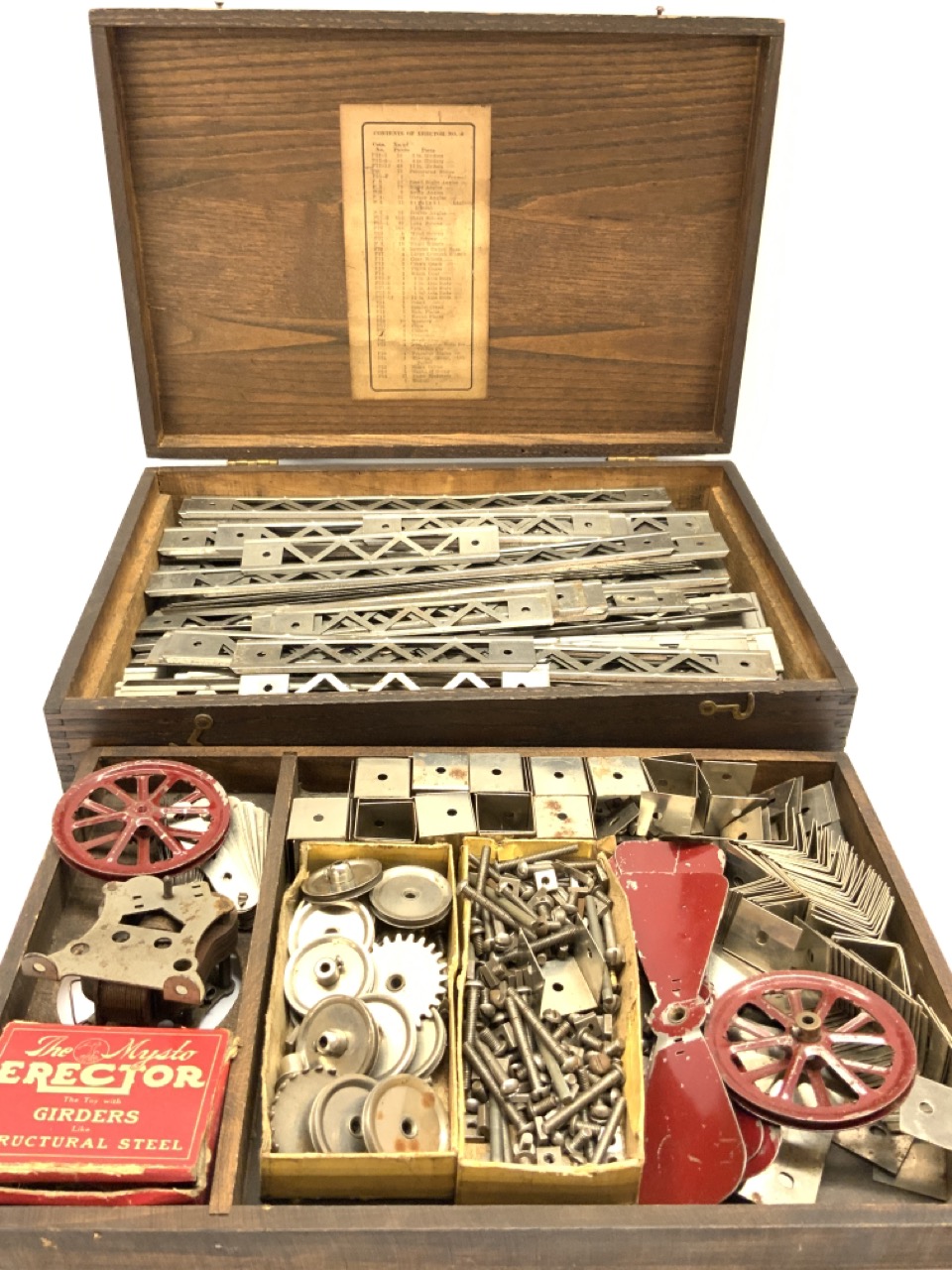 The Mysto Erector Set. Housed in original oak box. Backside of box has one hinge disconnected and crack. Appears complete.