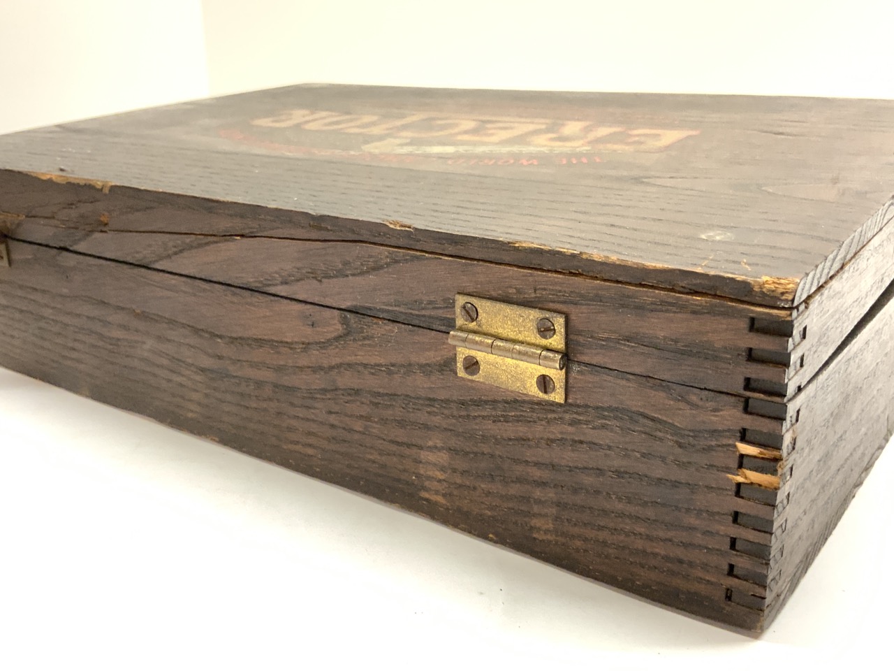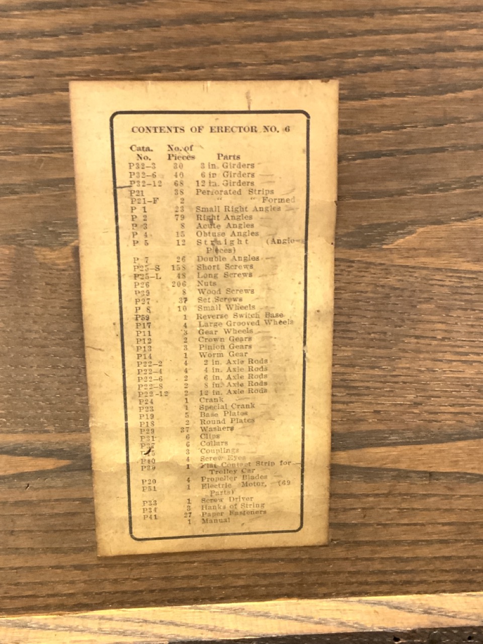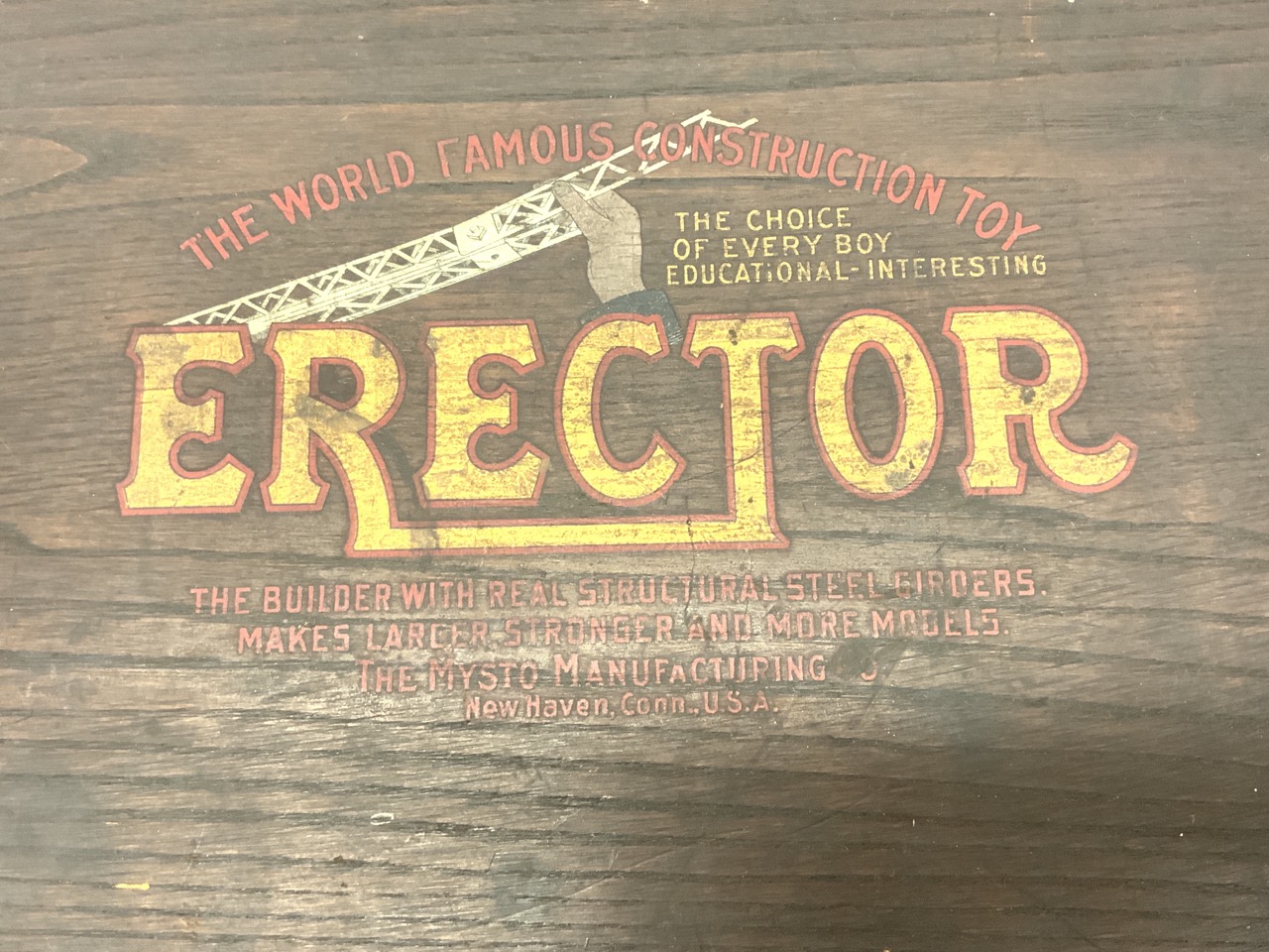 The Mysto Erector Set. Housed in original oak box. Backside of box has one hinge disconnected and crack. Appears complete.