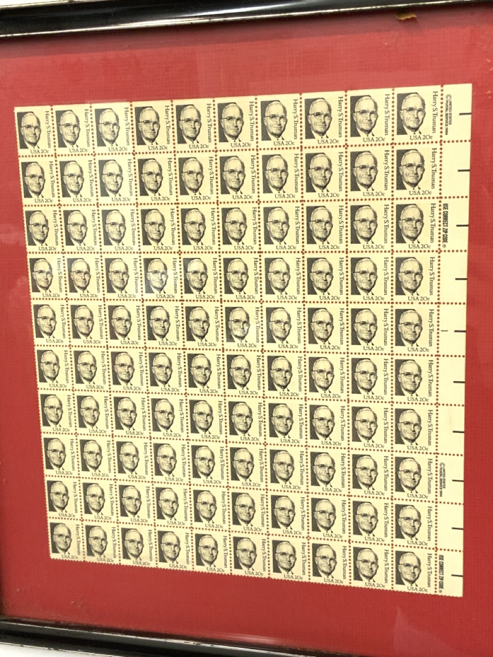 Block Of 100 U.S. Truman Stamps, Framed.