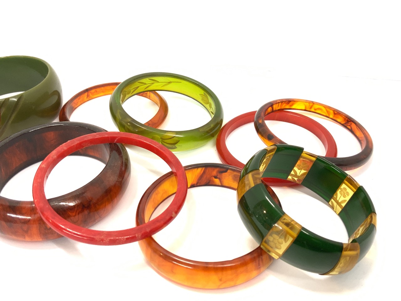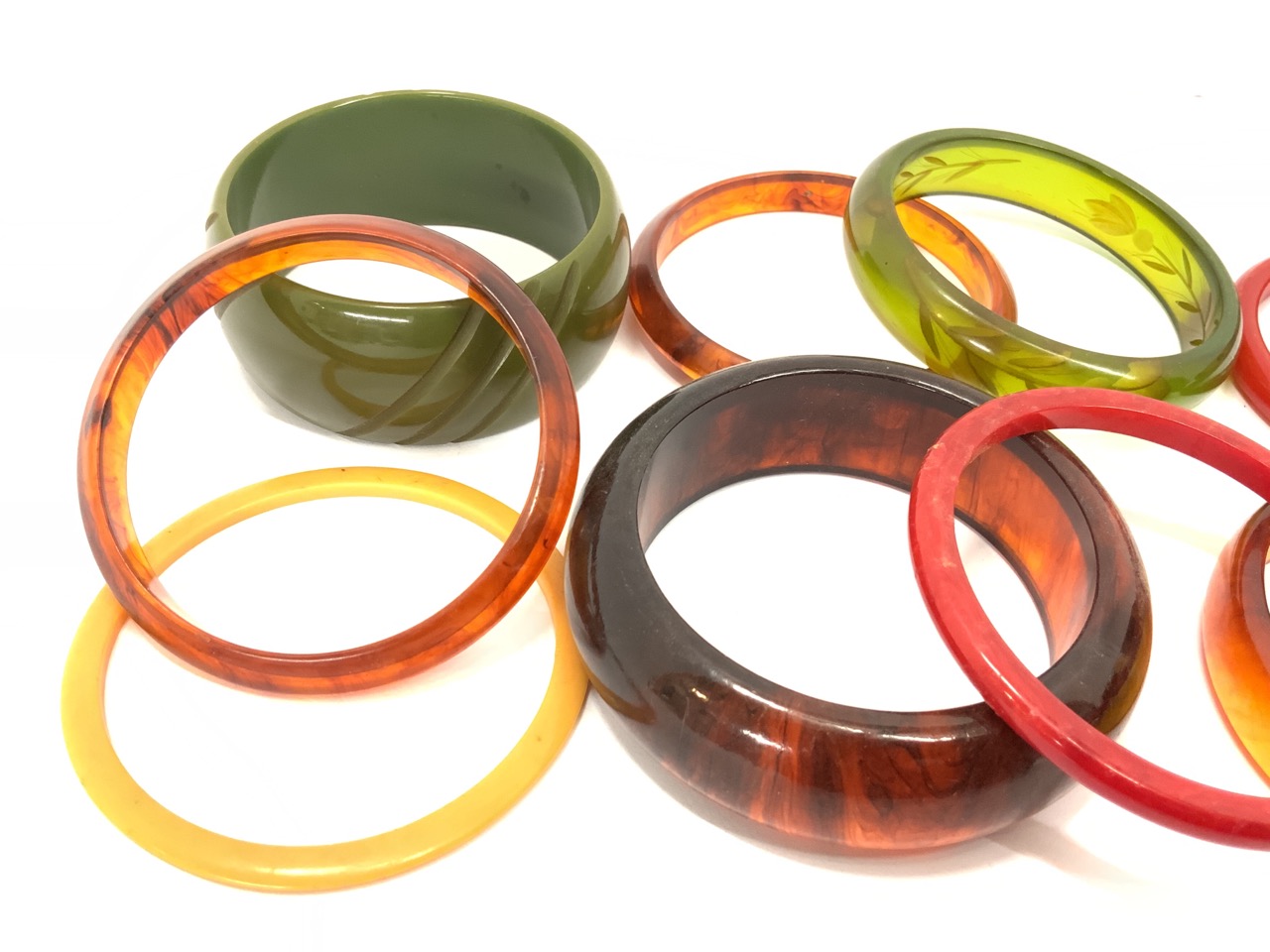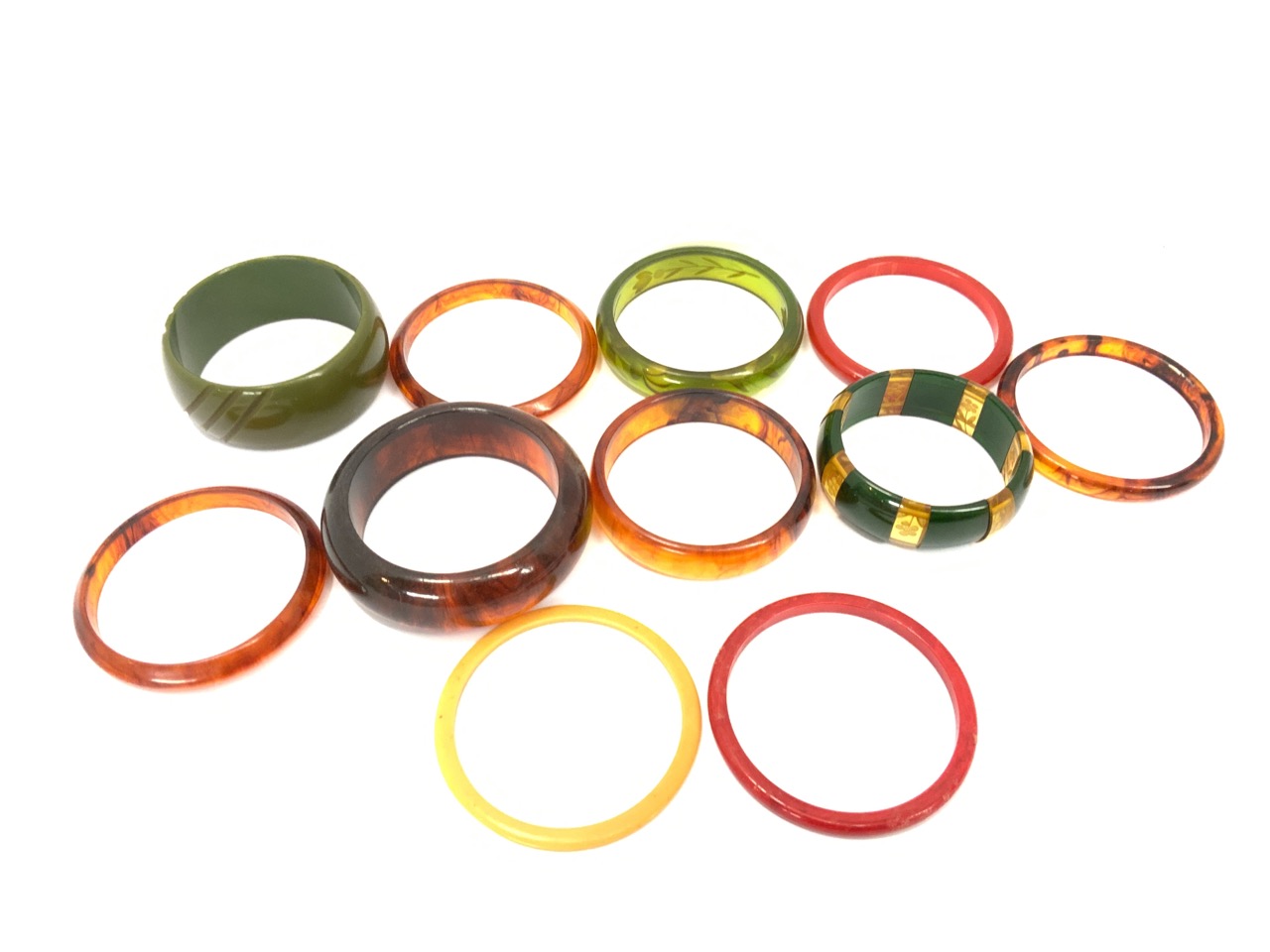 Assorted Vintage Bakelite, Plastic and Lucite Bangle Bracelets. As seen in photograph preview. Eleven (11) Pieces total.