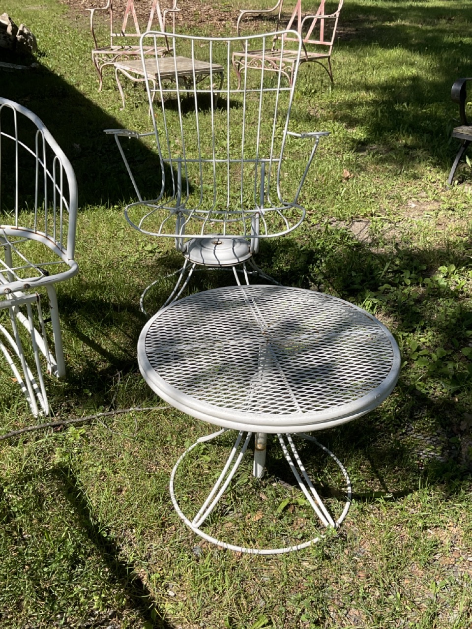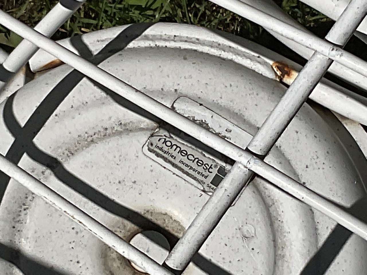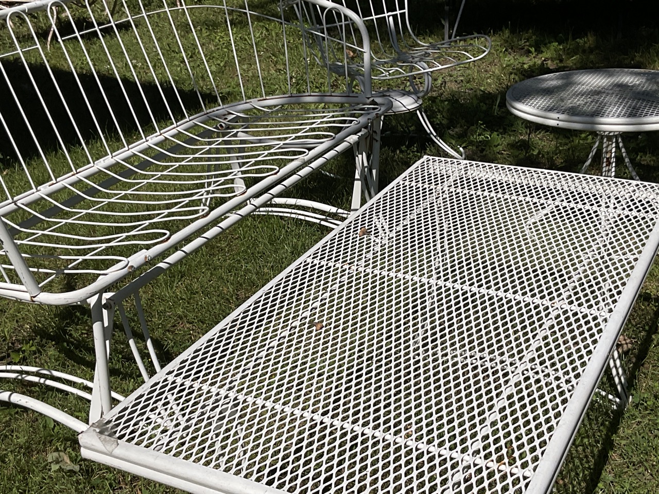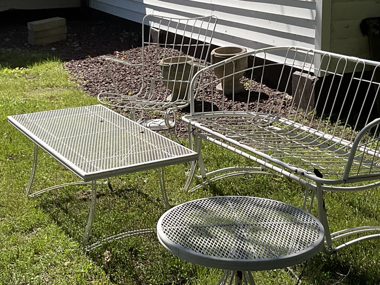 Five piece Homecrest Suite. Two outdoor swivel arms chairs, glider style settee, rectangular coffee table and side table. Signed.