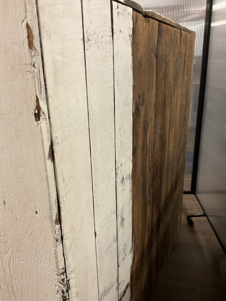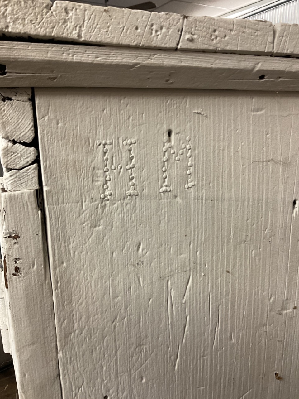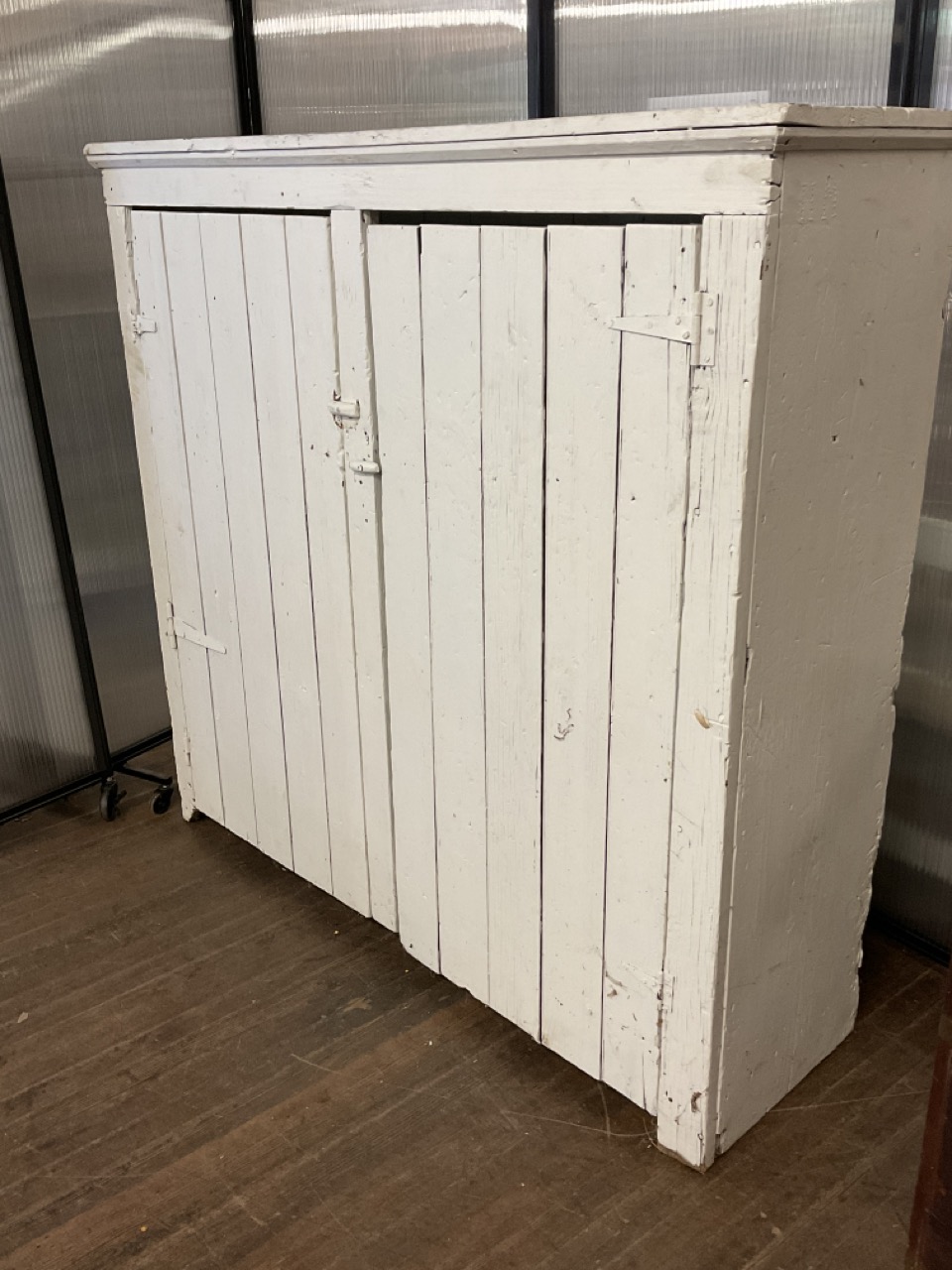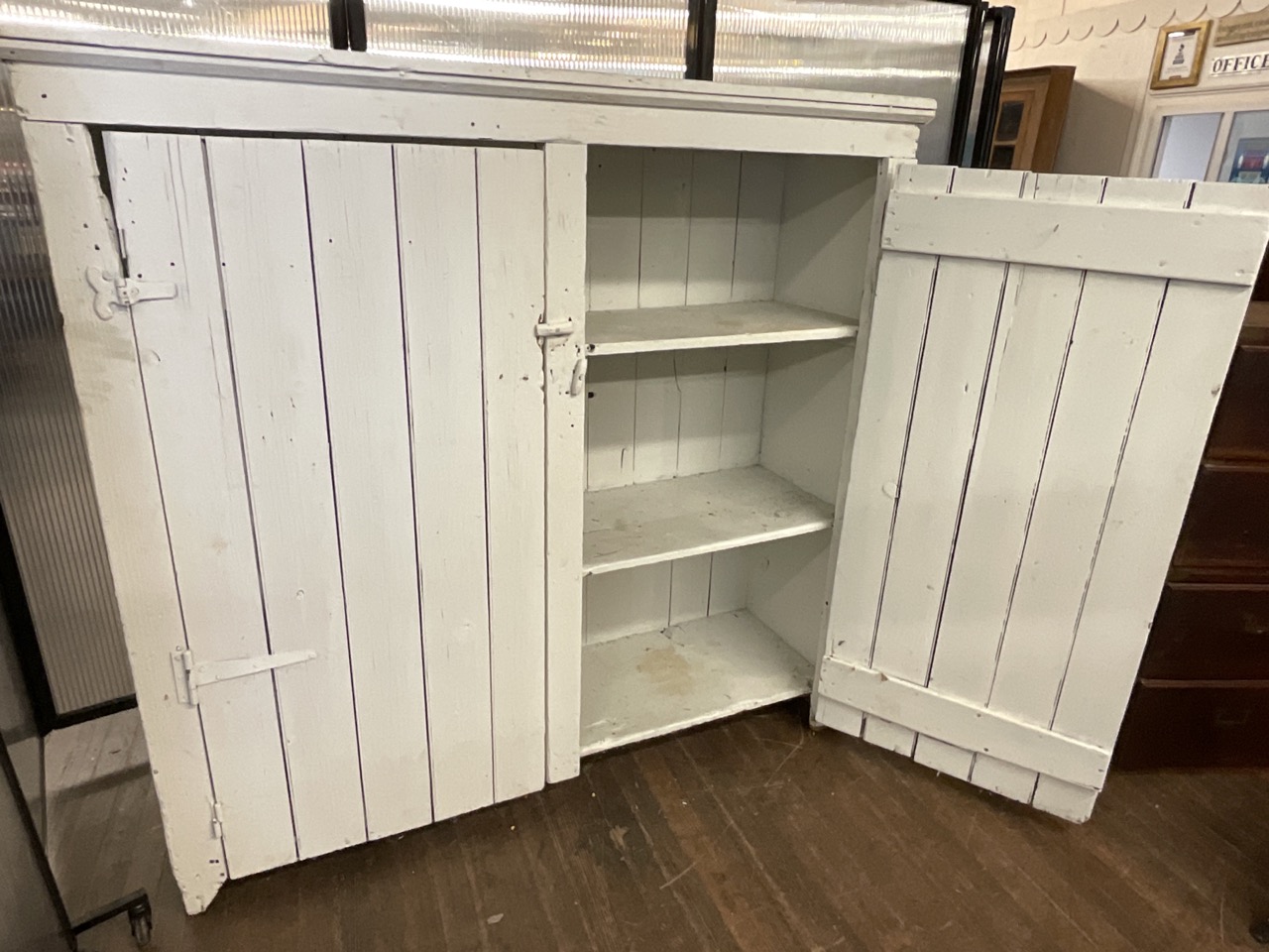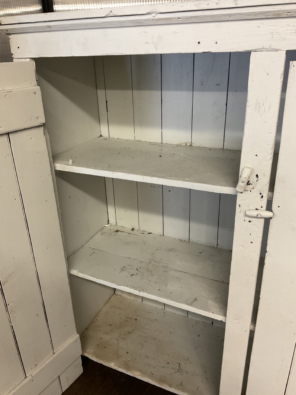 A large wide two door pine cupboard. Painted white.