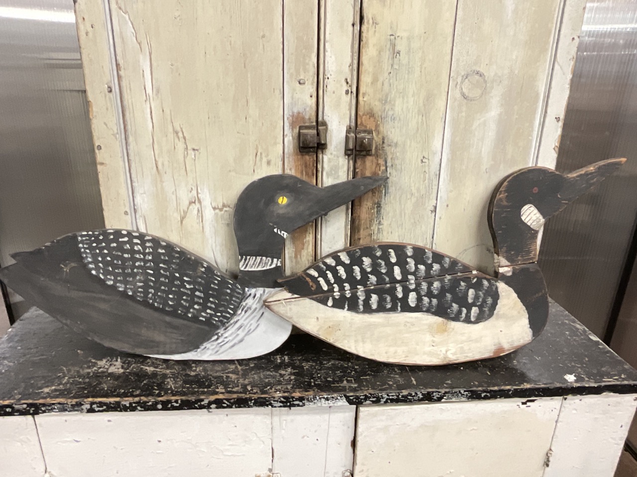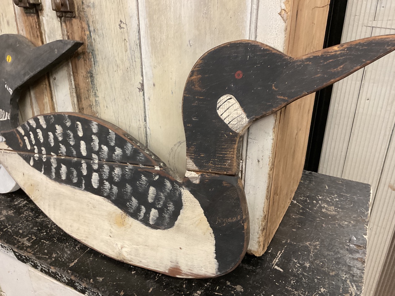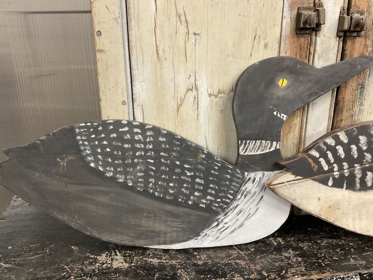 Two loon bird wood cut outs. Hand painted. c. 1980's.