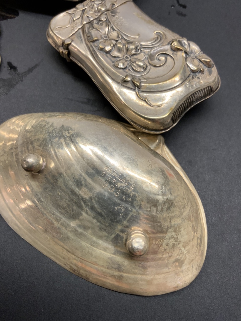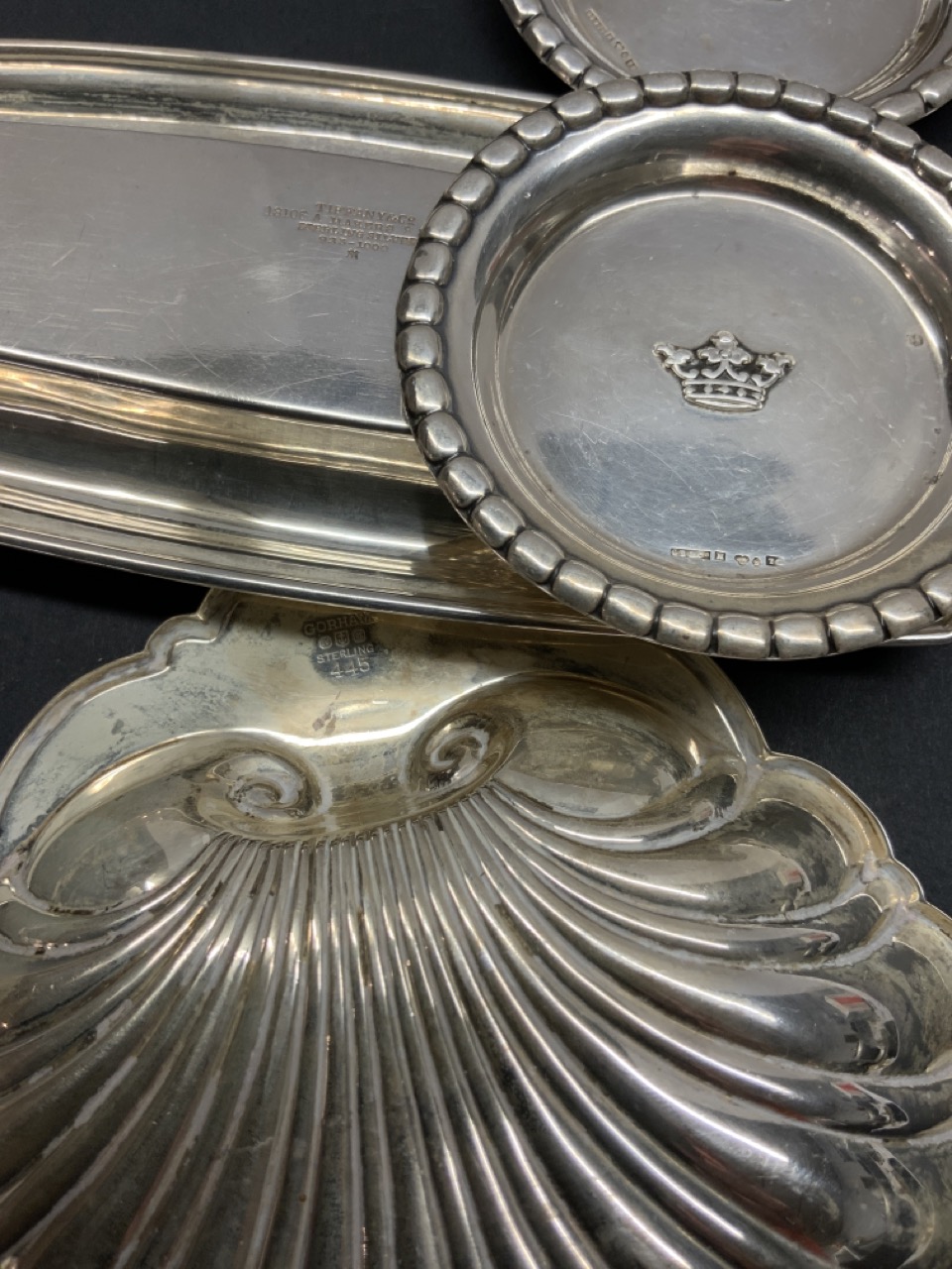 Assorted estate compiled sterling silver table wares including a Wallace shell dish, Tiffany & Co. tray etc. Match safe is German silver, everything else is sterling.