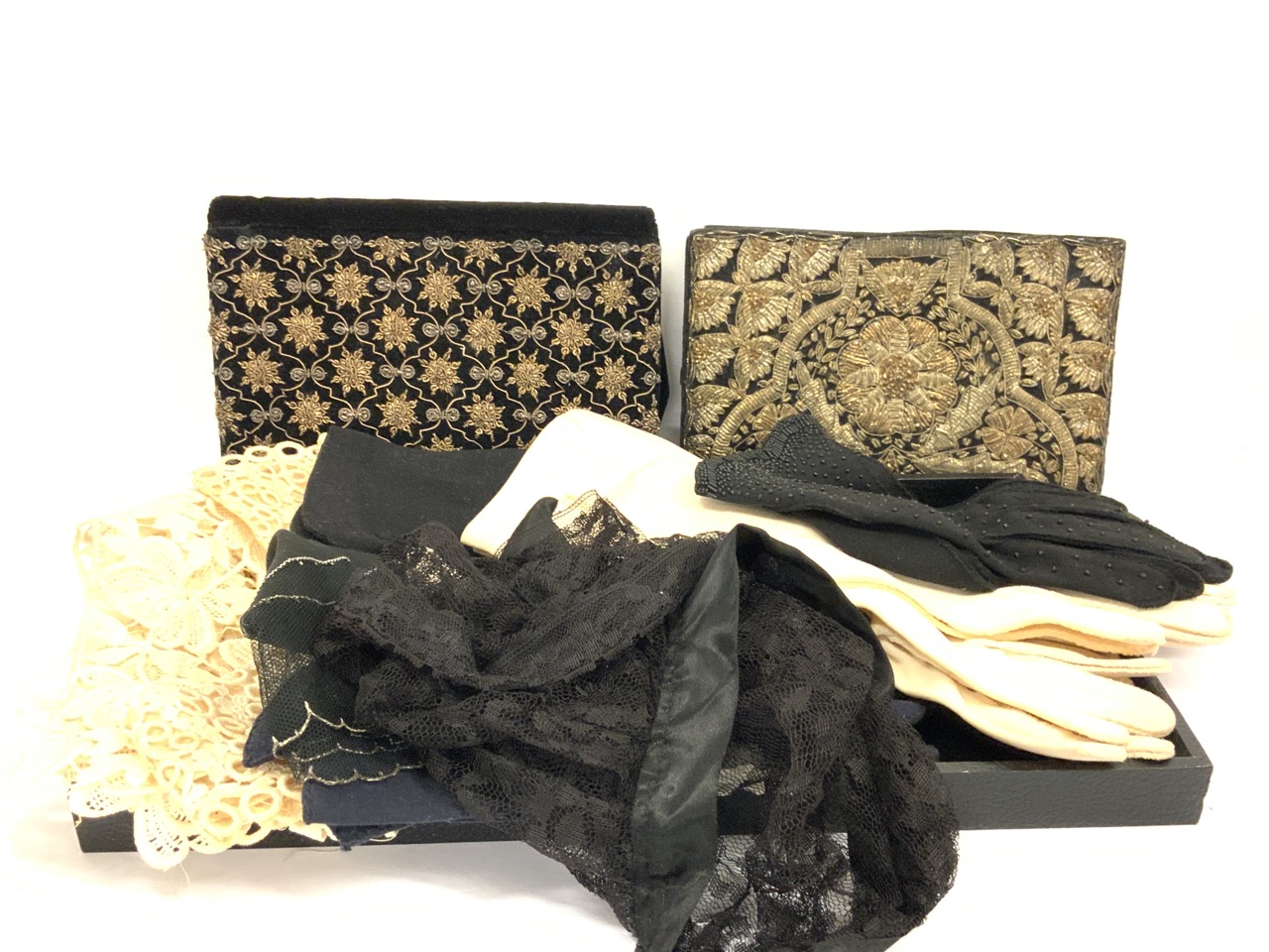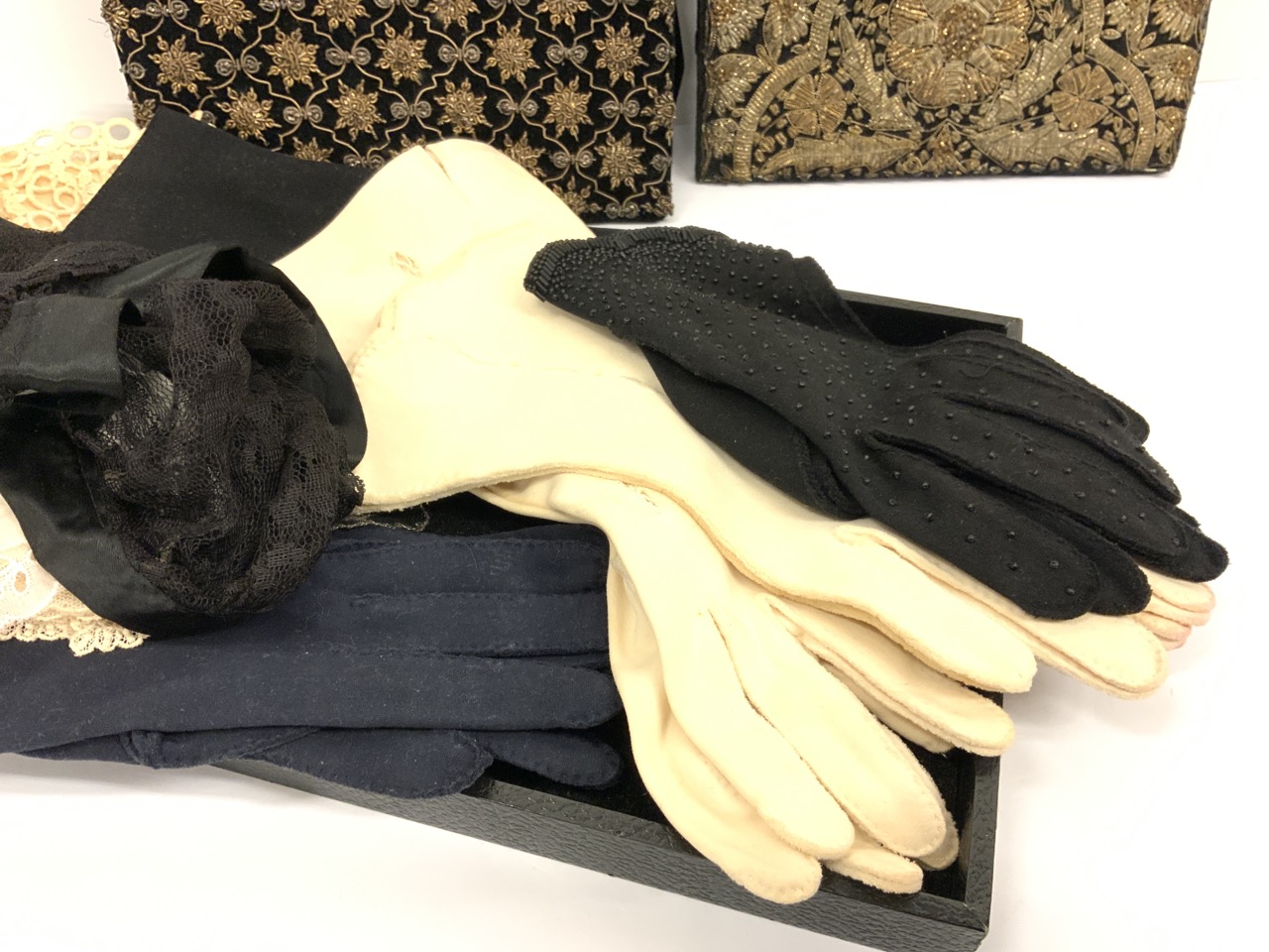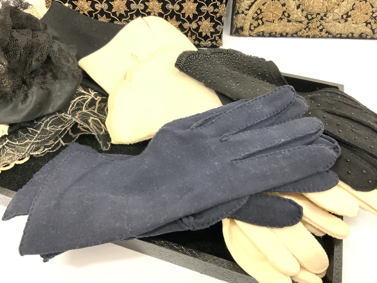 Vintage lady gloves and silk embroidered French purses. As seen in photograph preview.
