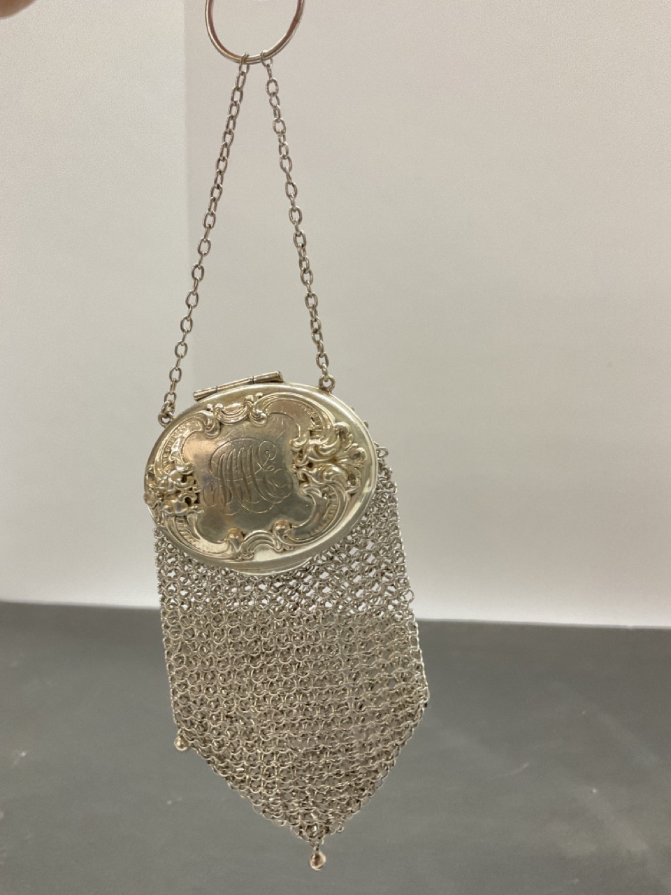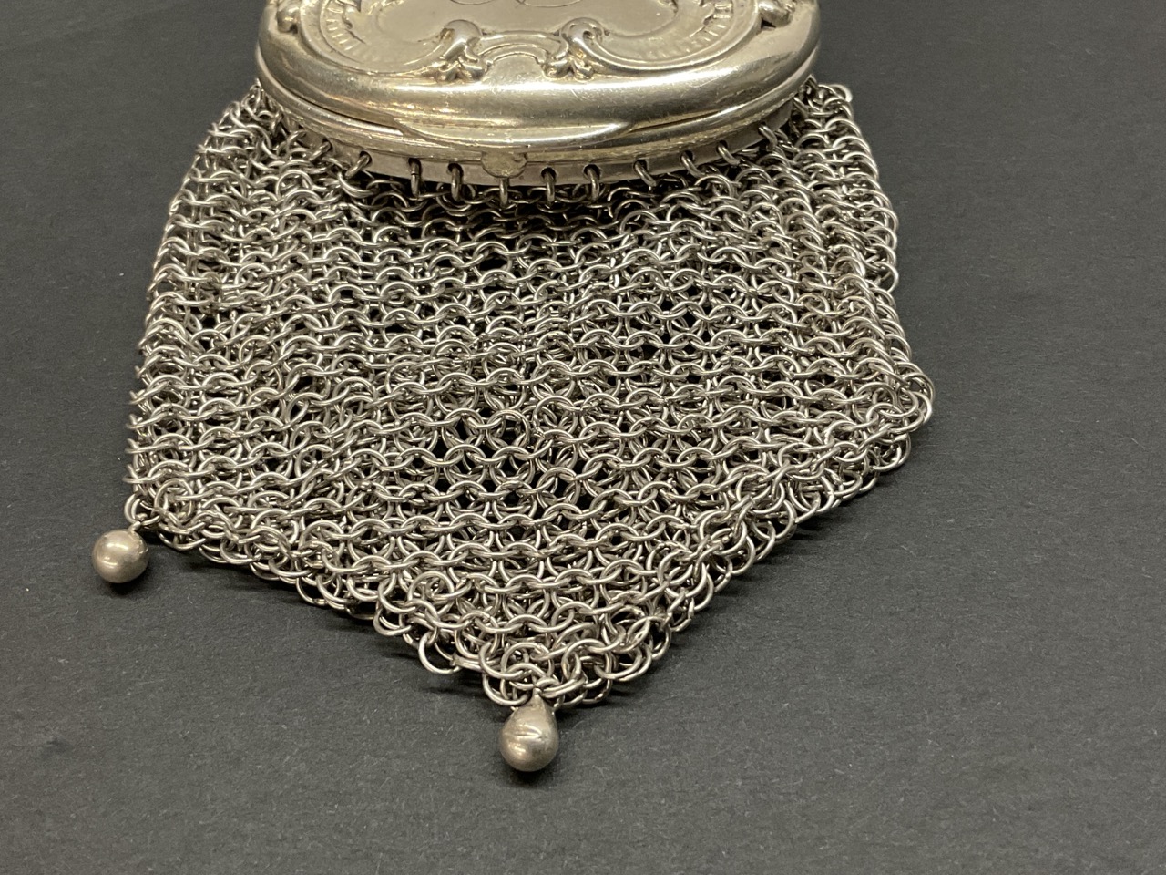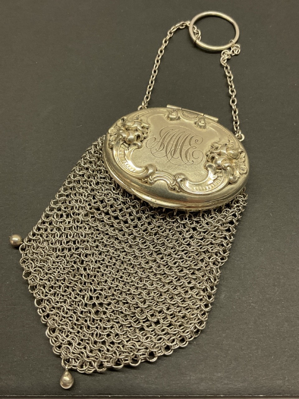 A small antique Gorham sterling silver change purse. Late Victorian era. One ball tassel missing on right bottom side.