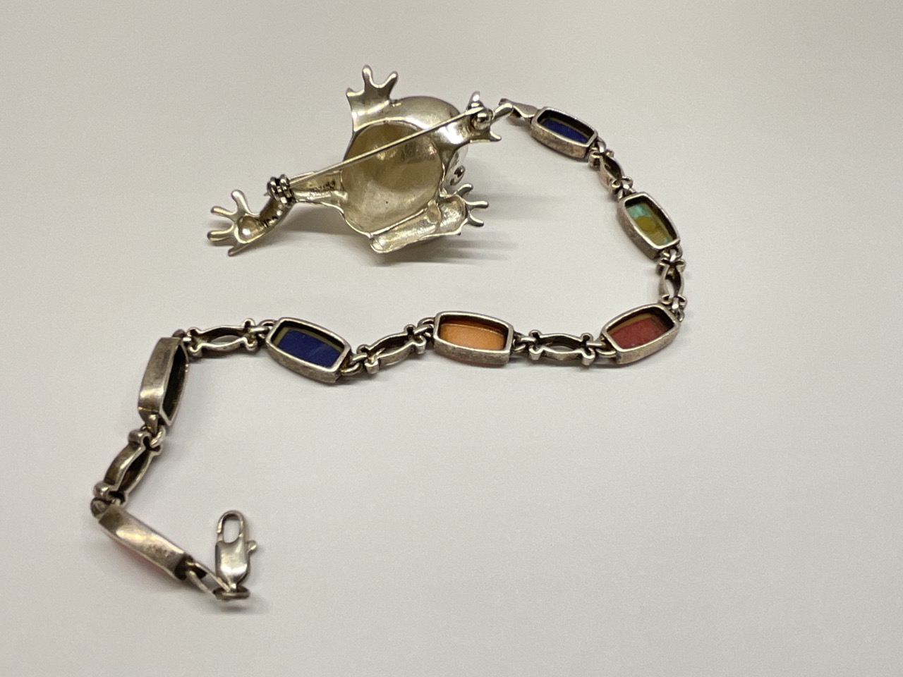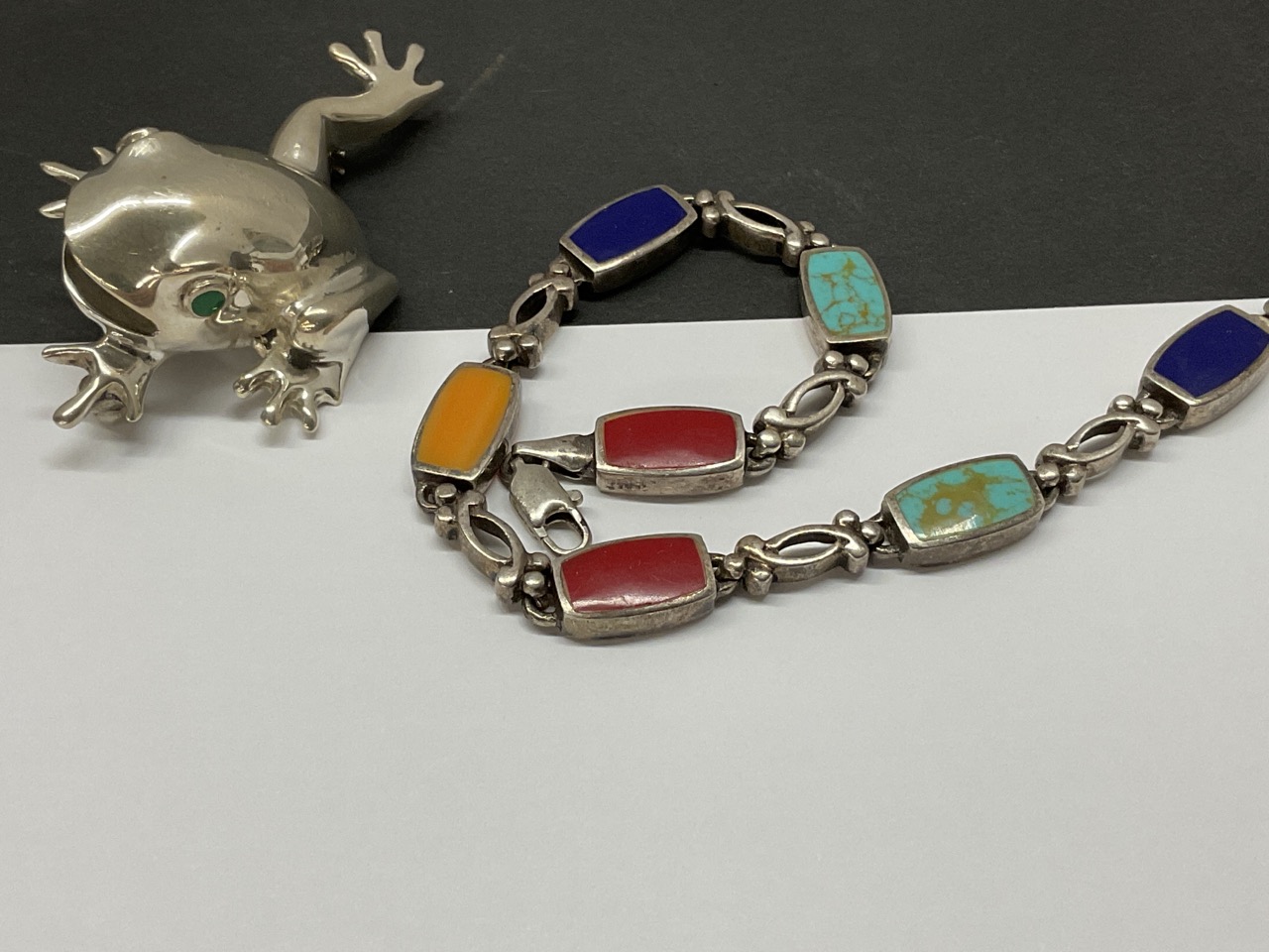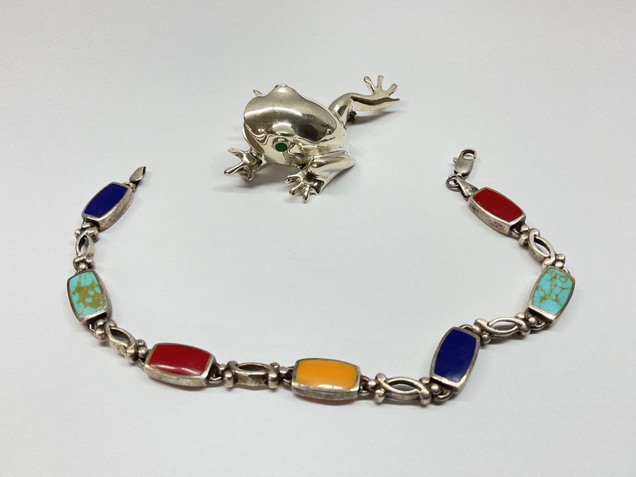 Mexican sterling silver frog pin with malachite green eyes. Sterling silver bracelet 7" with turquoise, coral, lapis etc.