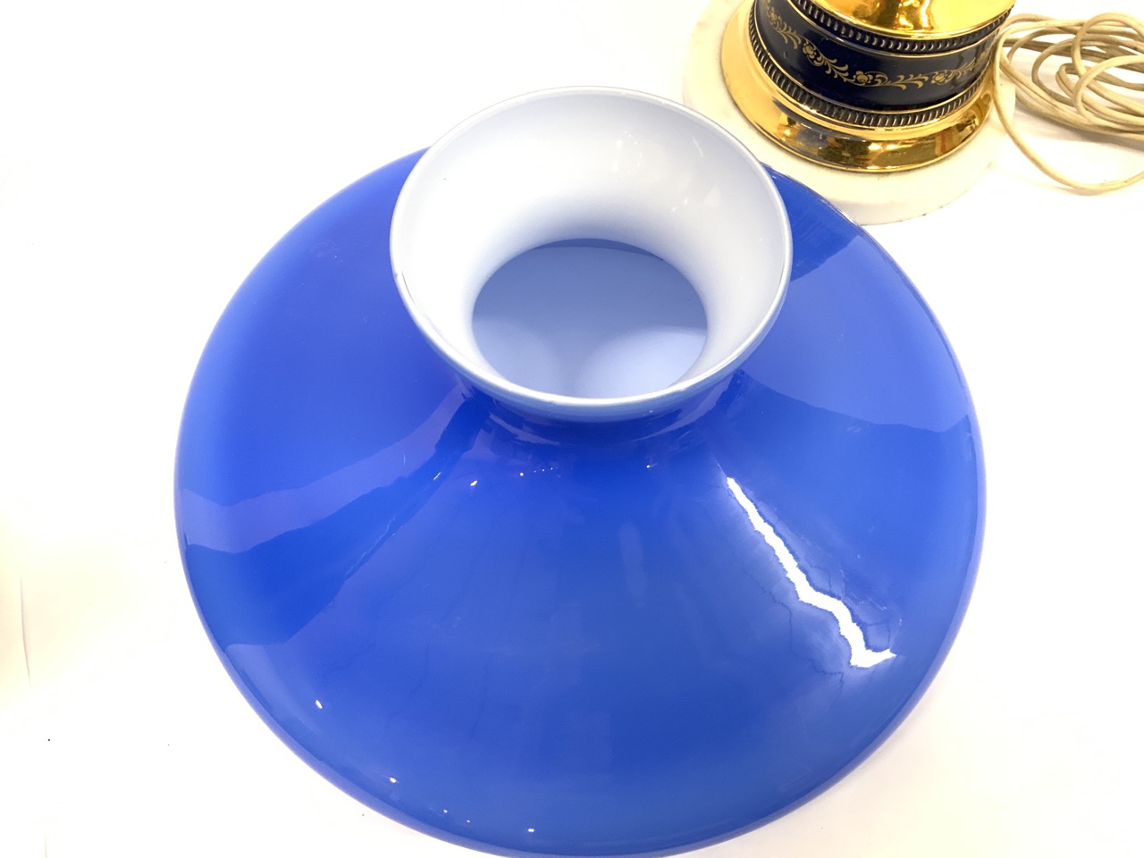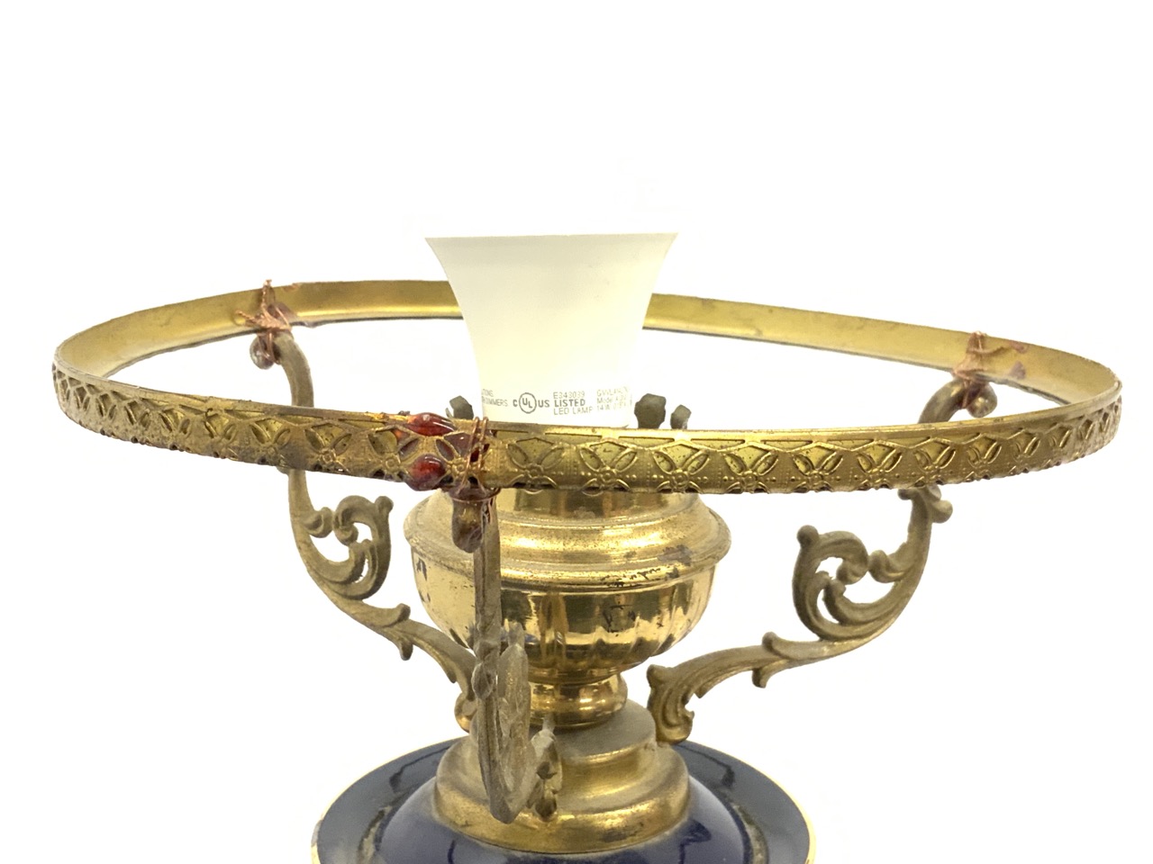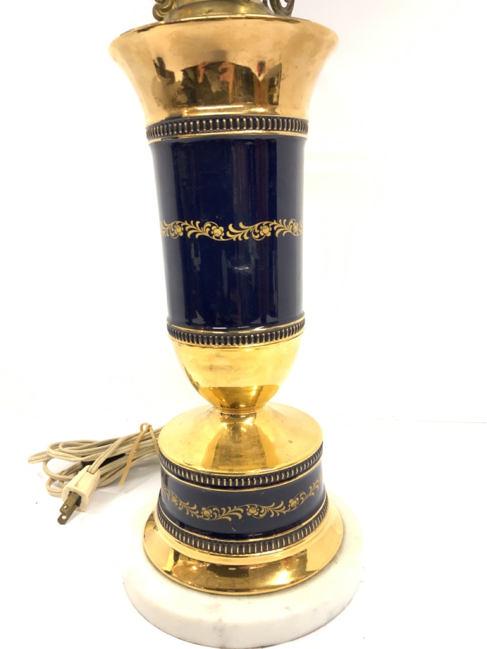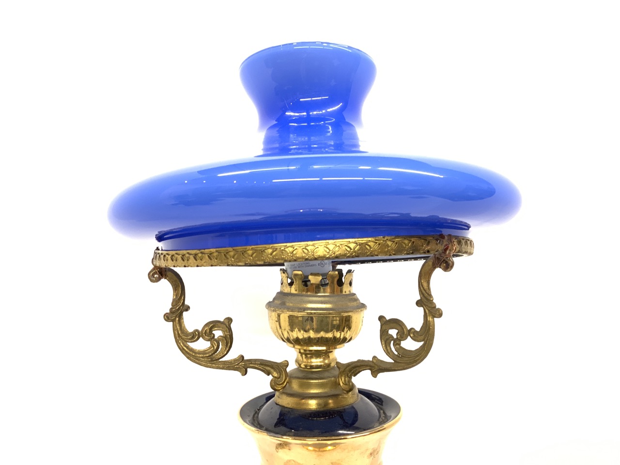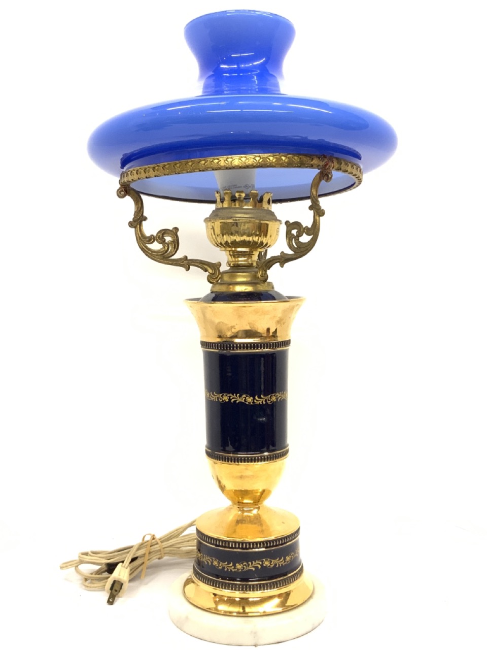 Napoleonic Cobalt Blue And Gold Decorated Table Lamp With Blue Glass Shade.
