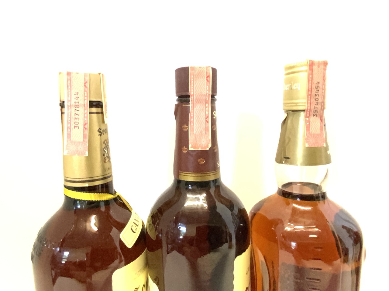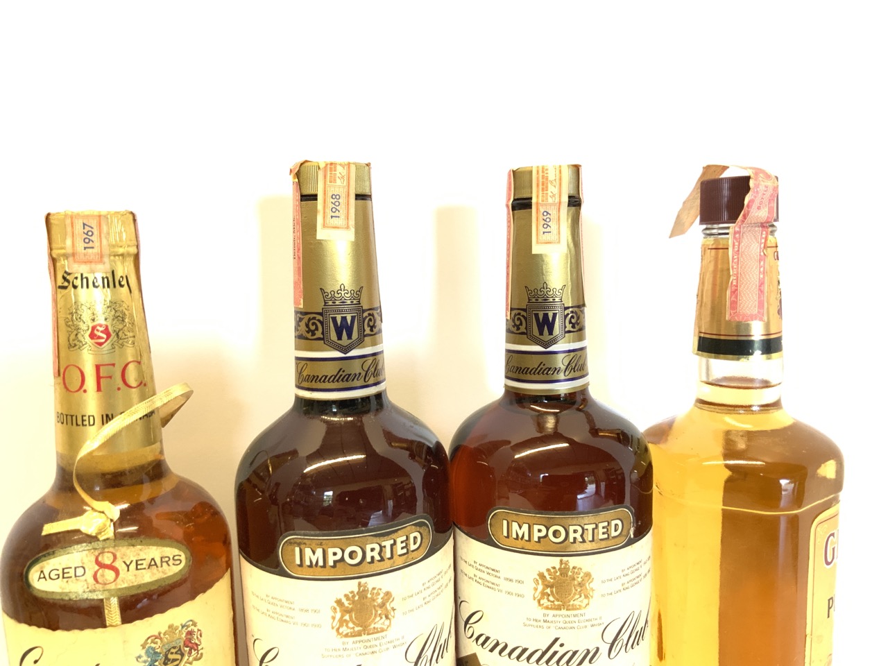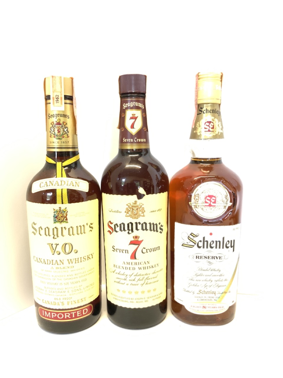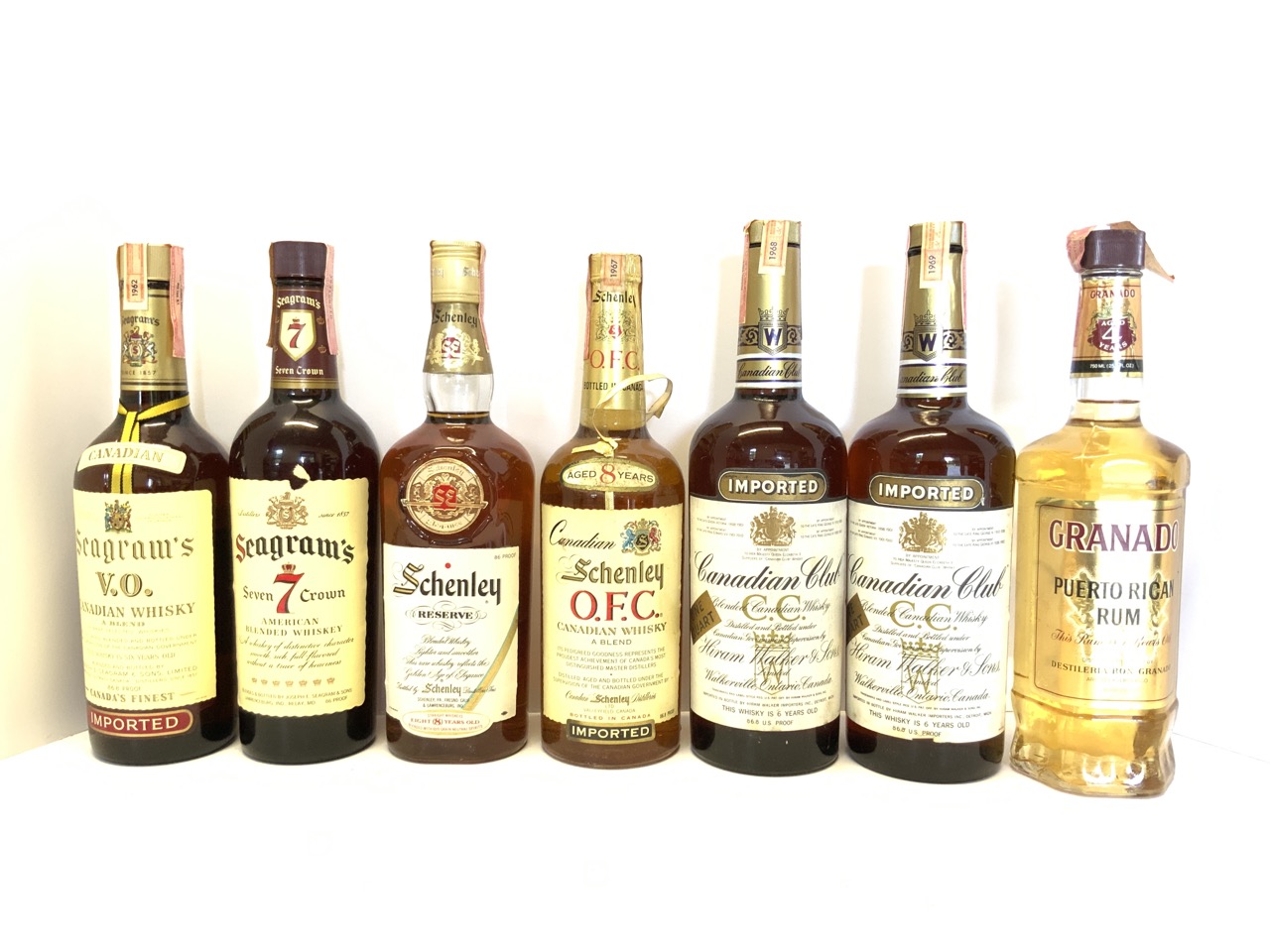 Collector Bottle Seven (7) Qty Seagram’ s V.O. Whiskey, Seven Crown,Scenley Reserve, Schenley O.F.C Whisky,Canadian Club Hiram Walker & Sons (2),Granado Puerto Rican Rum.