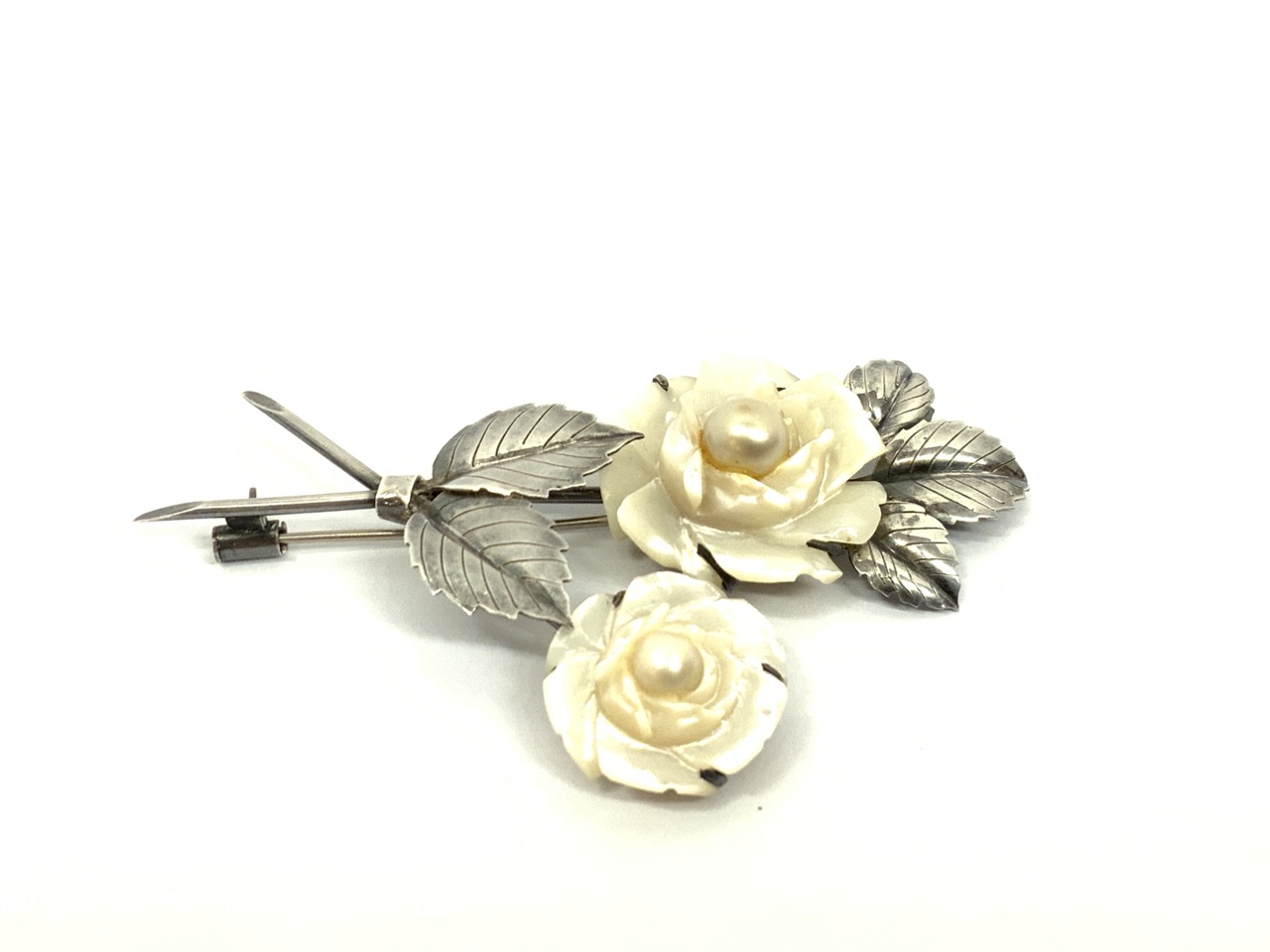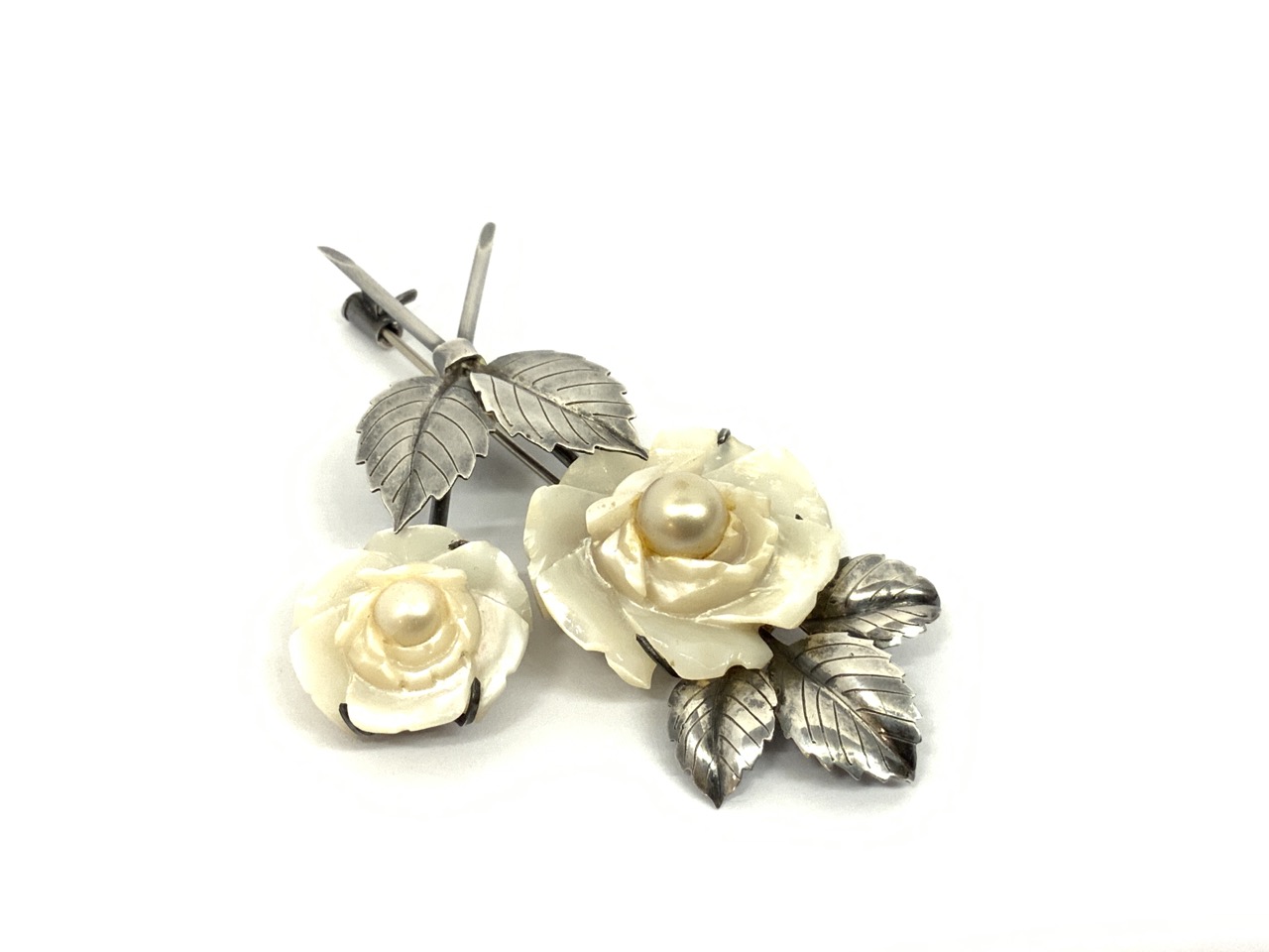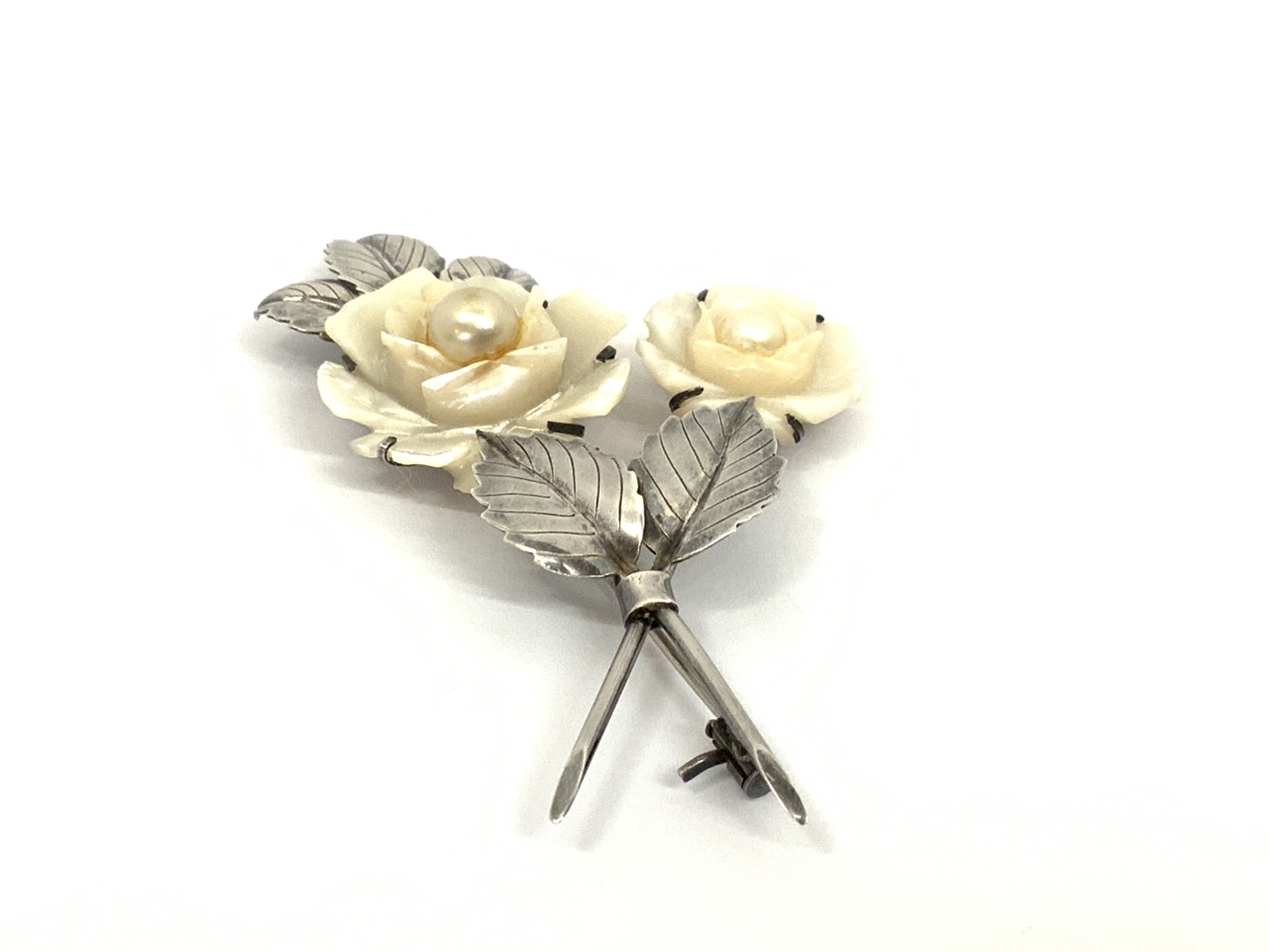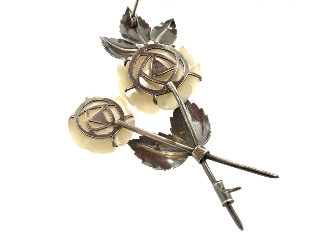 Signed Hosoki 950 sterling silver brooch with mother of pearl flowers.