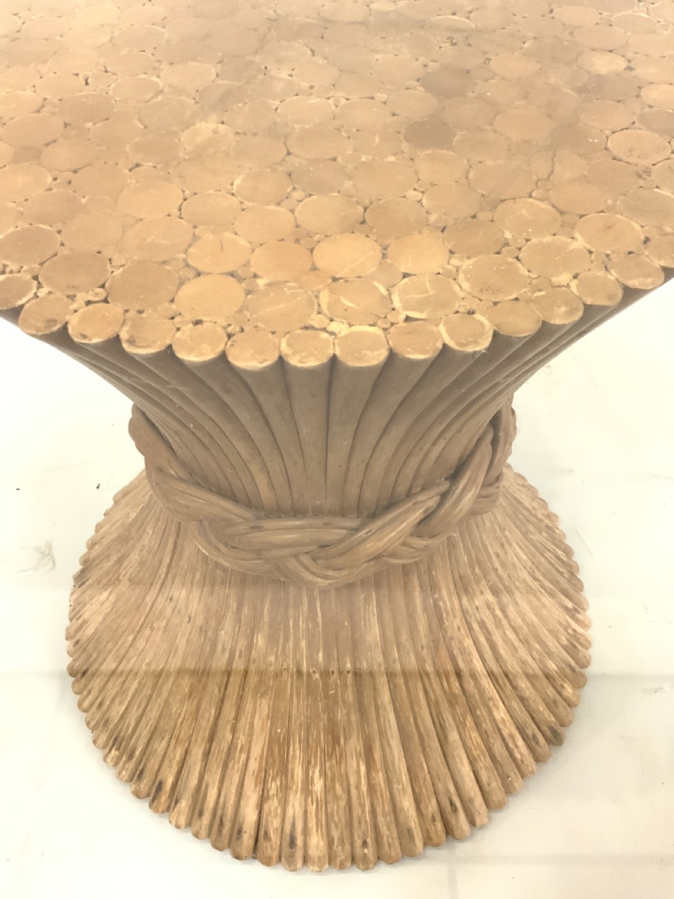 A McGuire "Sheaf Of Wheat" dining room table. Dimensions: 60" diameter glass and 3/4" thickSheaf Of Wheat Is 23 3/4" d and 28"height.