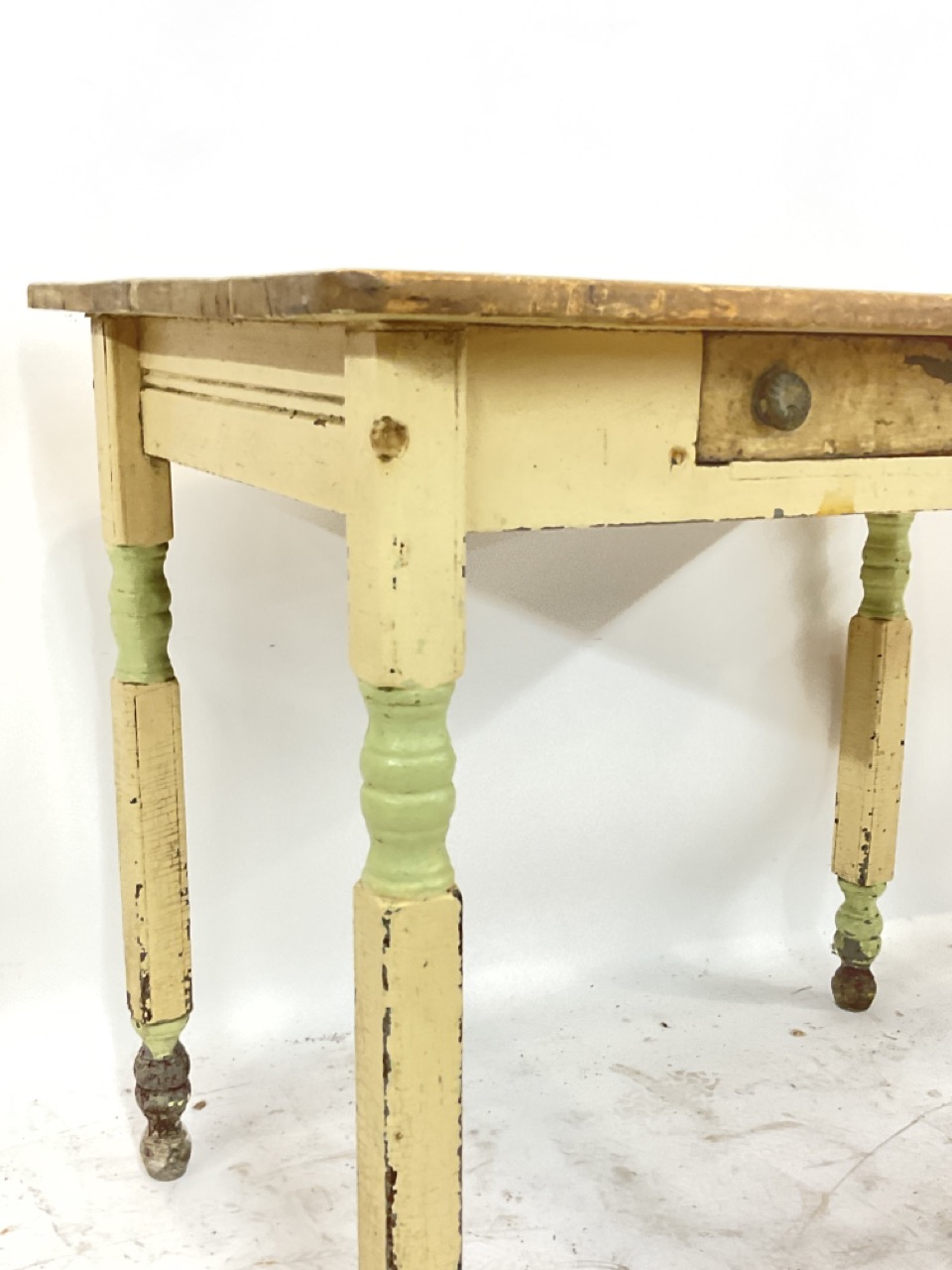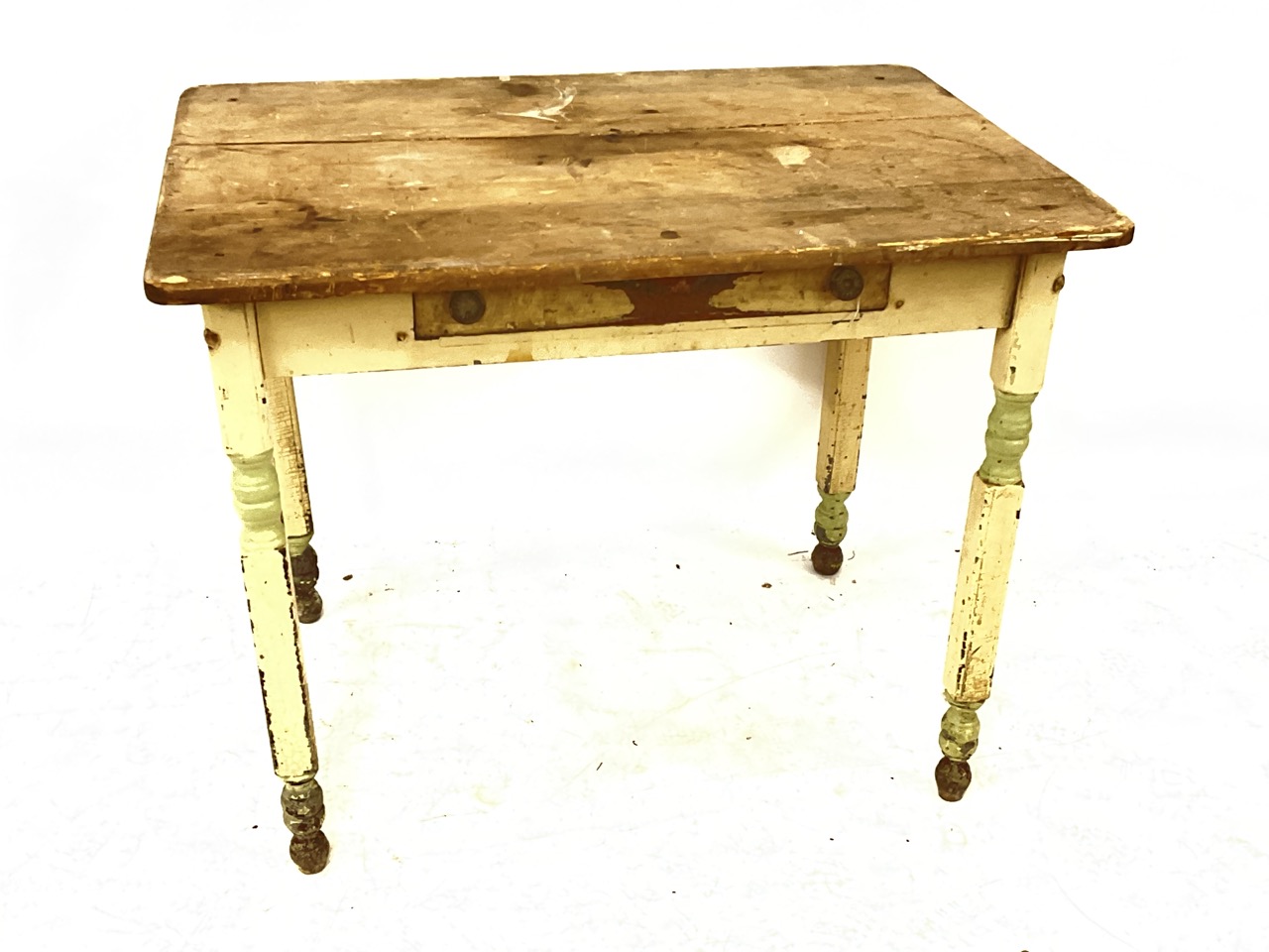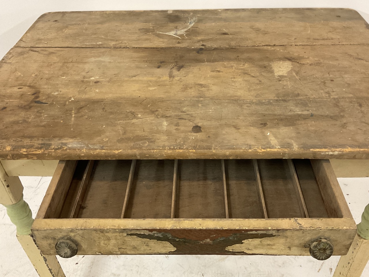 Early 1900's pine kitchen table with cutlery drawer.