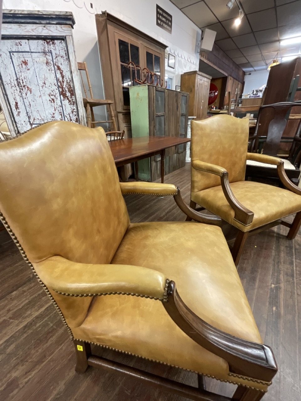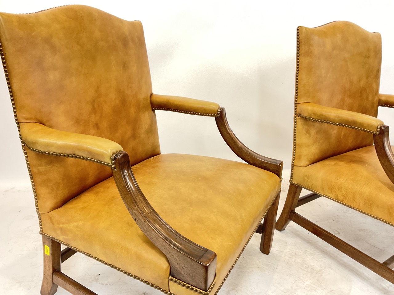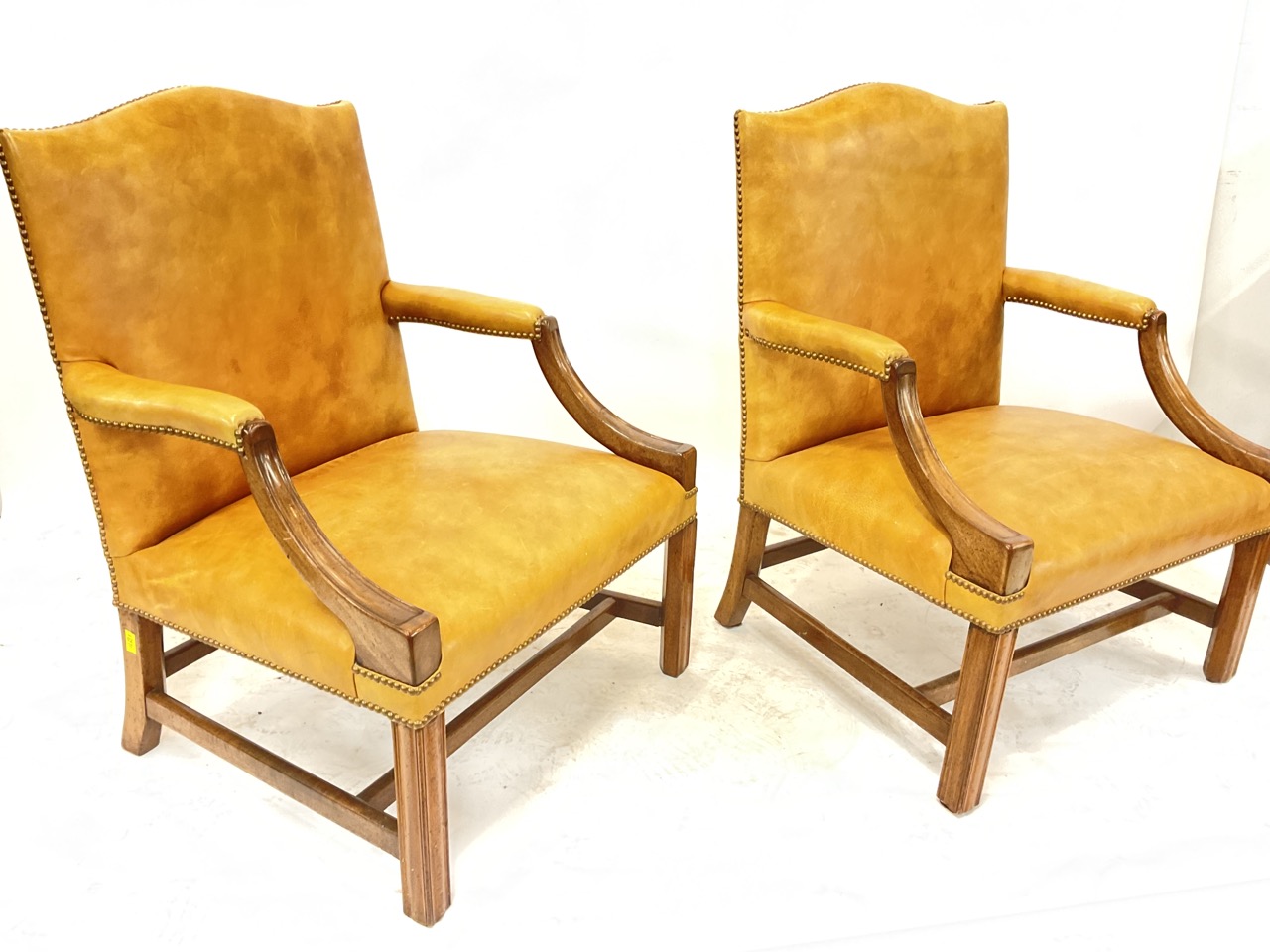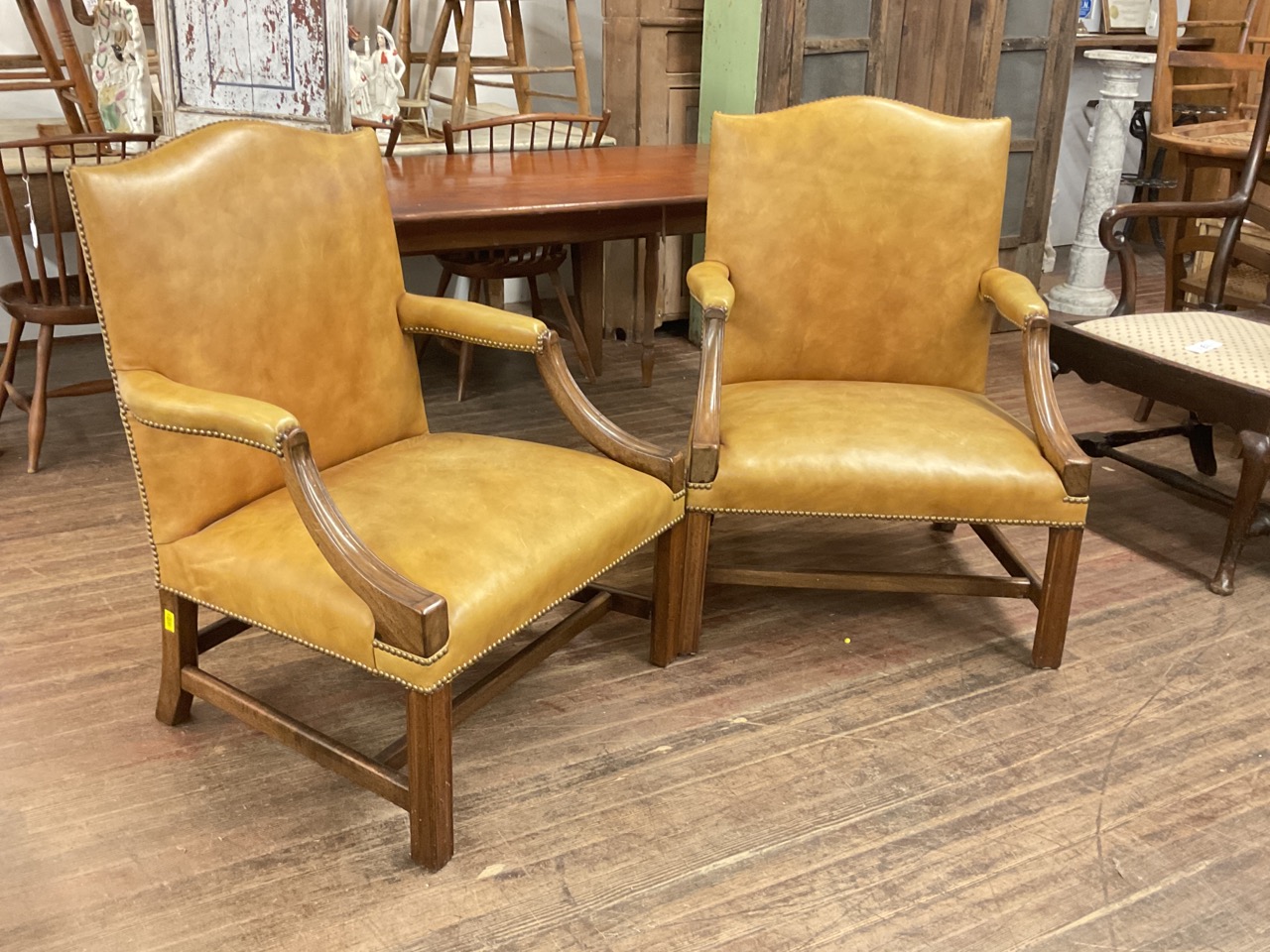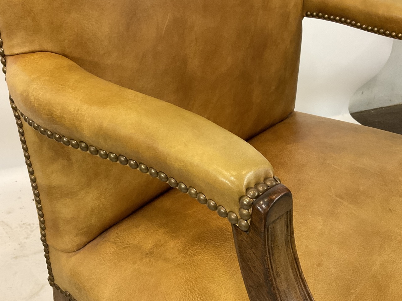 Exceptional pair of oversized Edwardian style studded leather arm chairs.