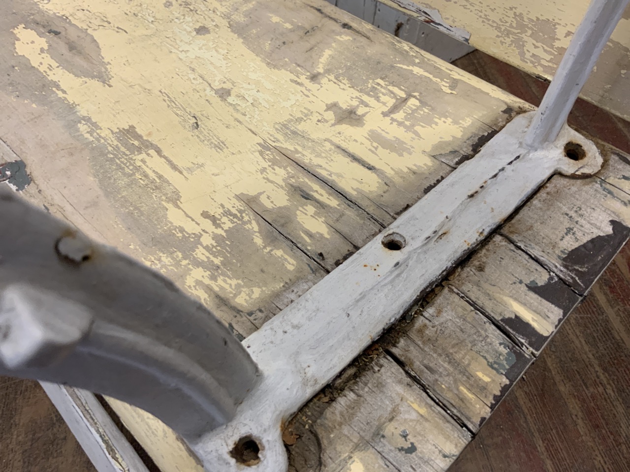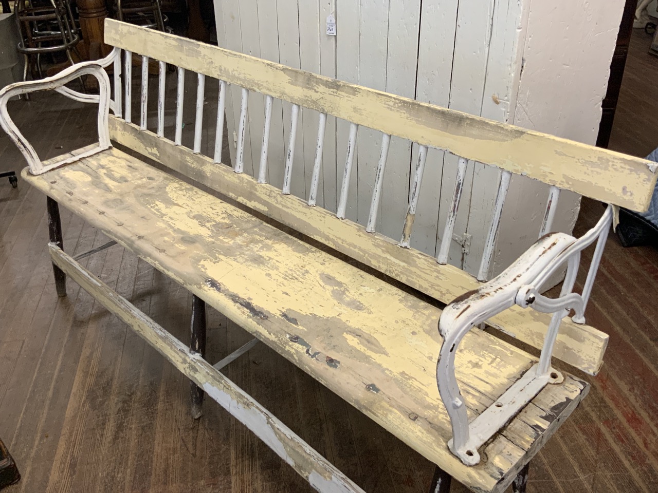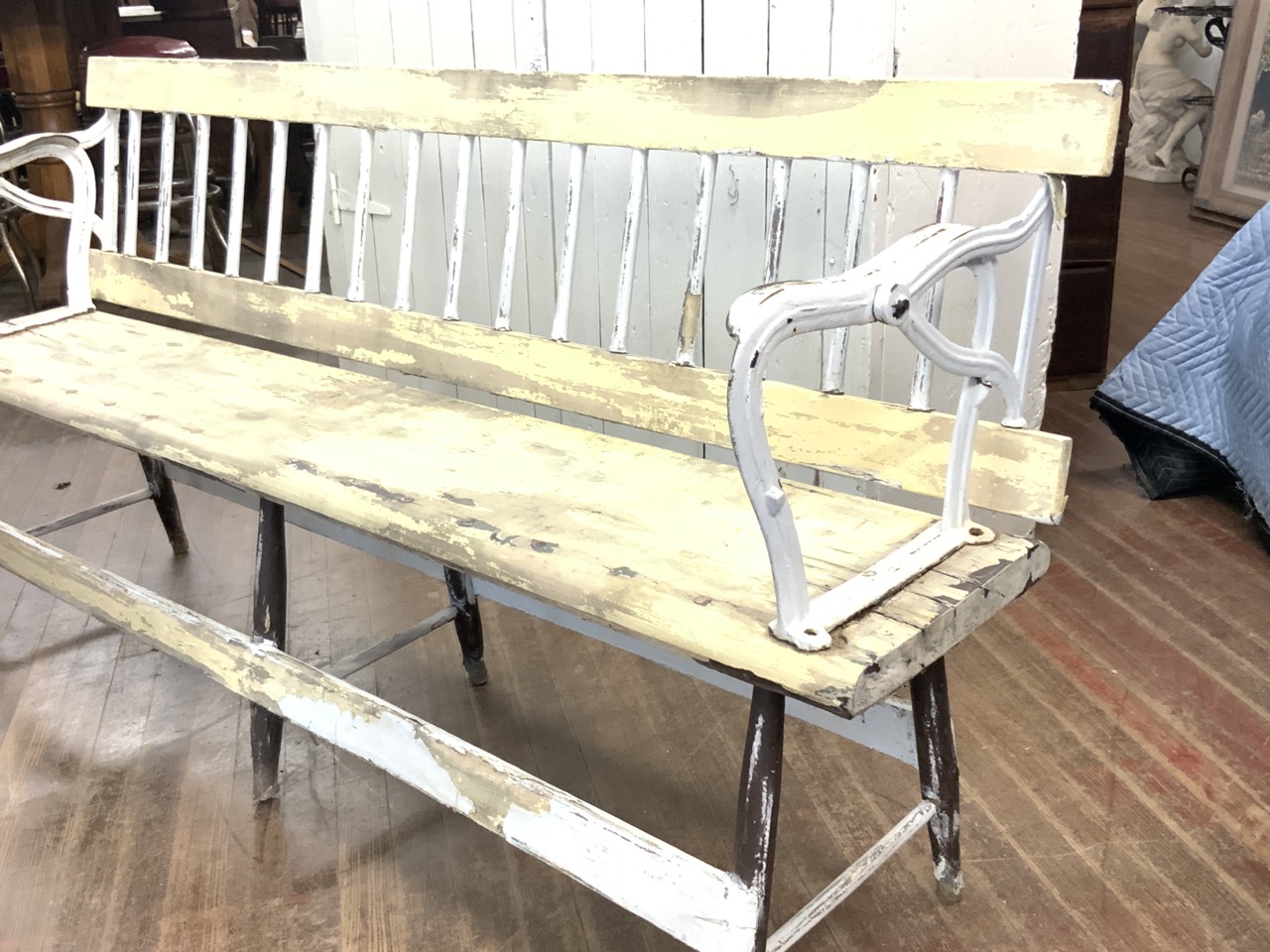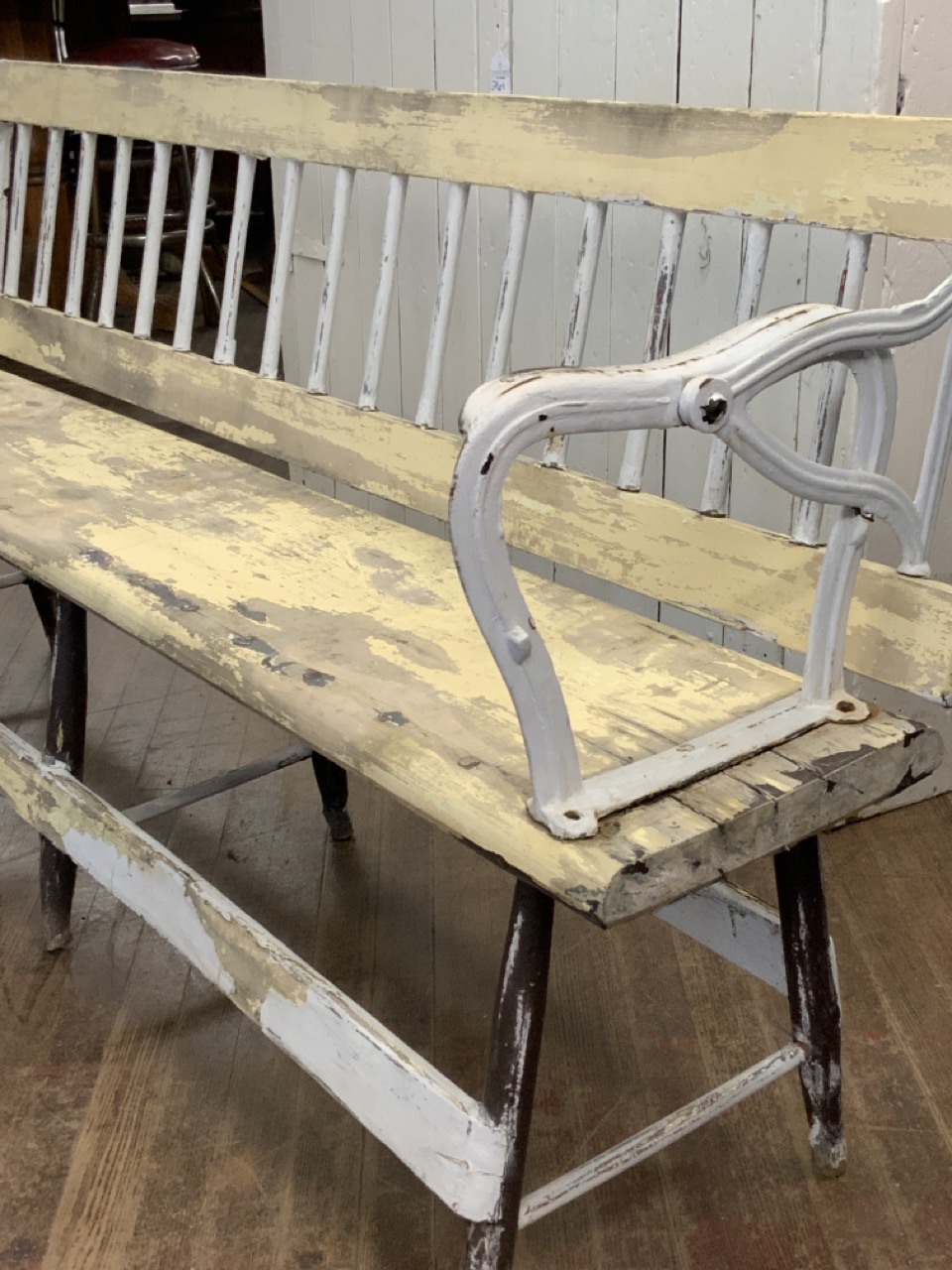 A train station bench seat. Cast iron arm rest sides. One side needs hardware.