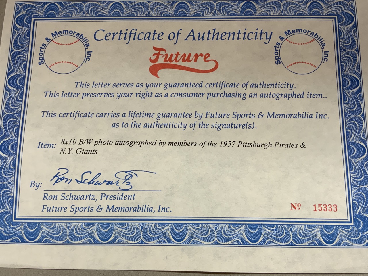 1957 Pittsburgh Pirates and New York Giants autographed photo with certificate of authenticity from Future Sports and Memorabilia Ron Schwartz president Certificate # 15333