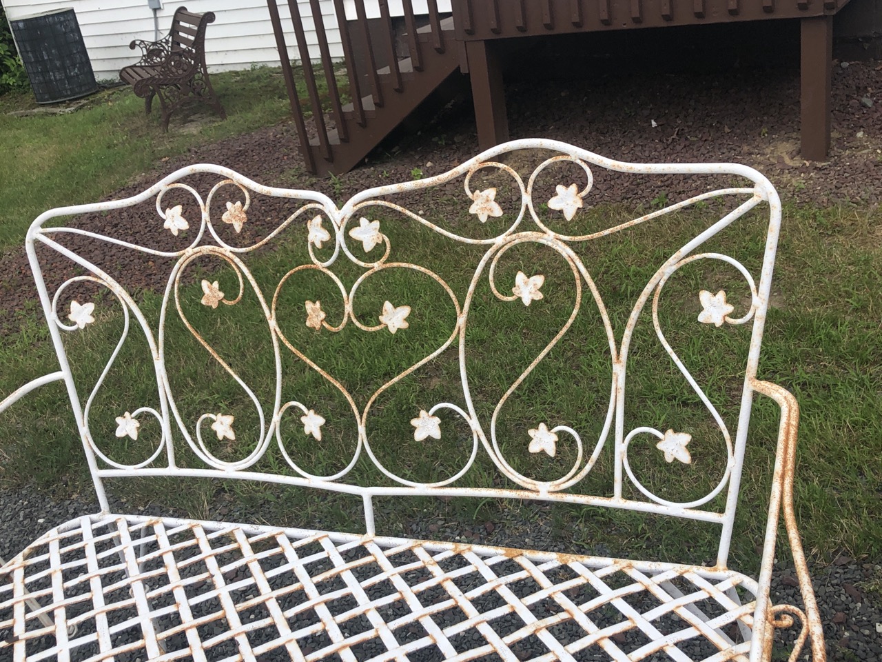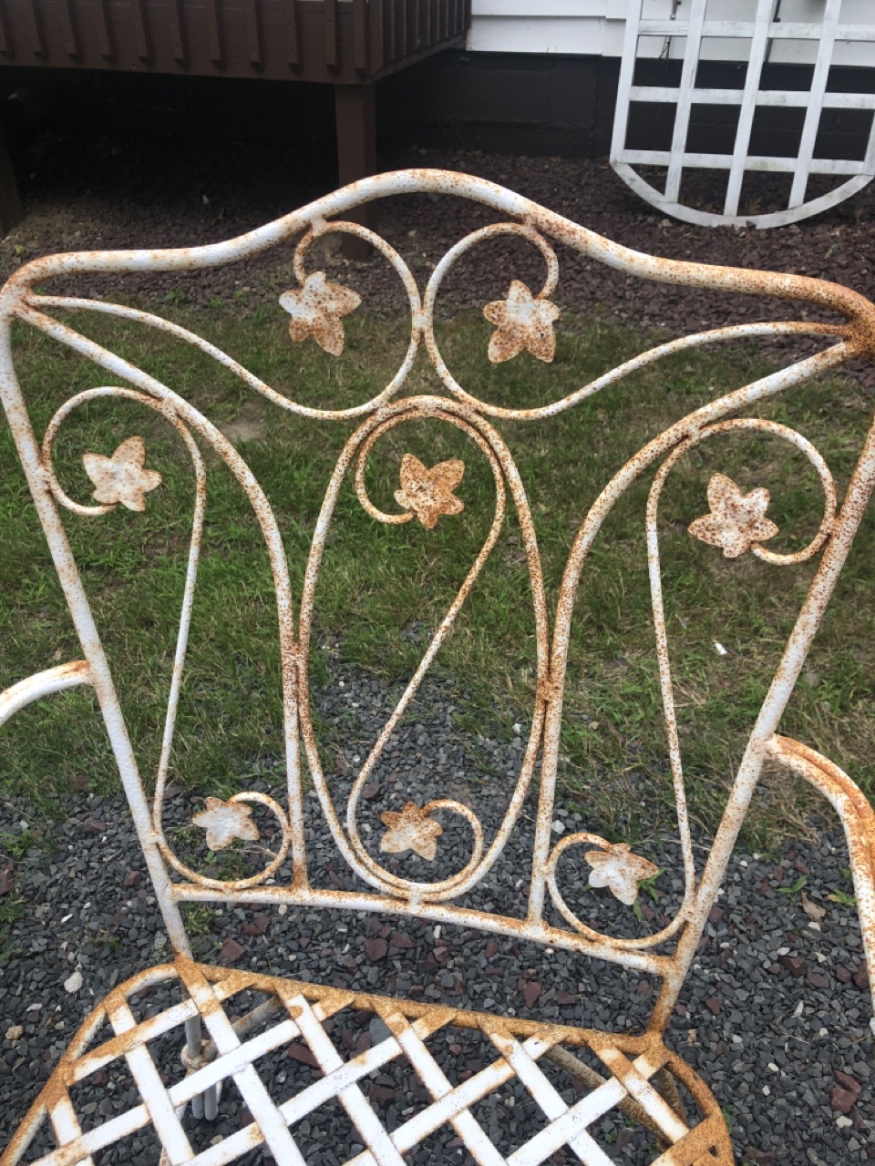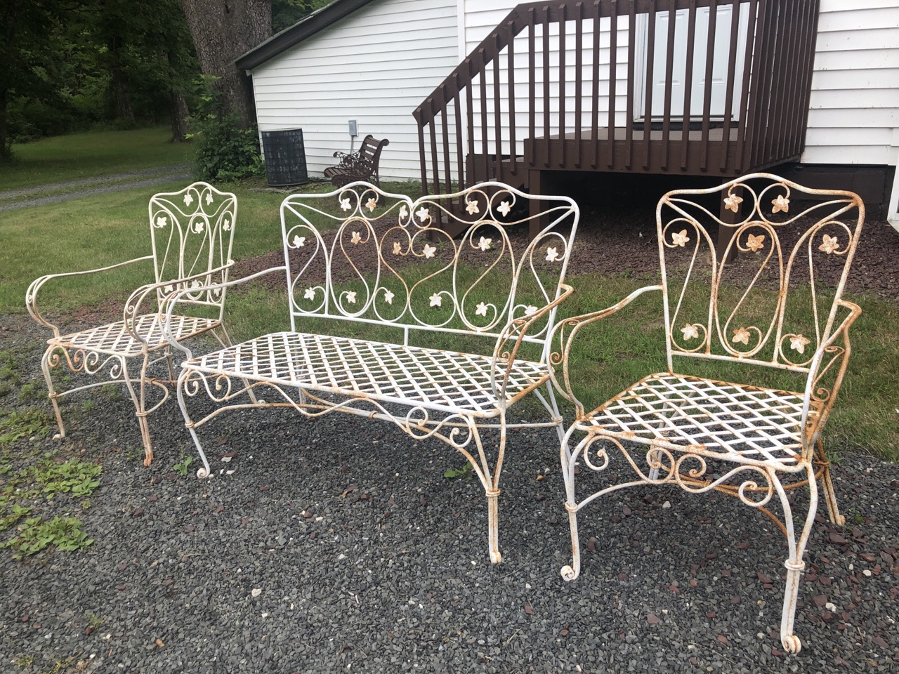 A set of three pieces. Sofa and two arm chairs. White painted iron. Repaint needed.