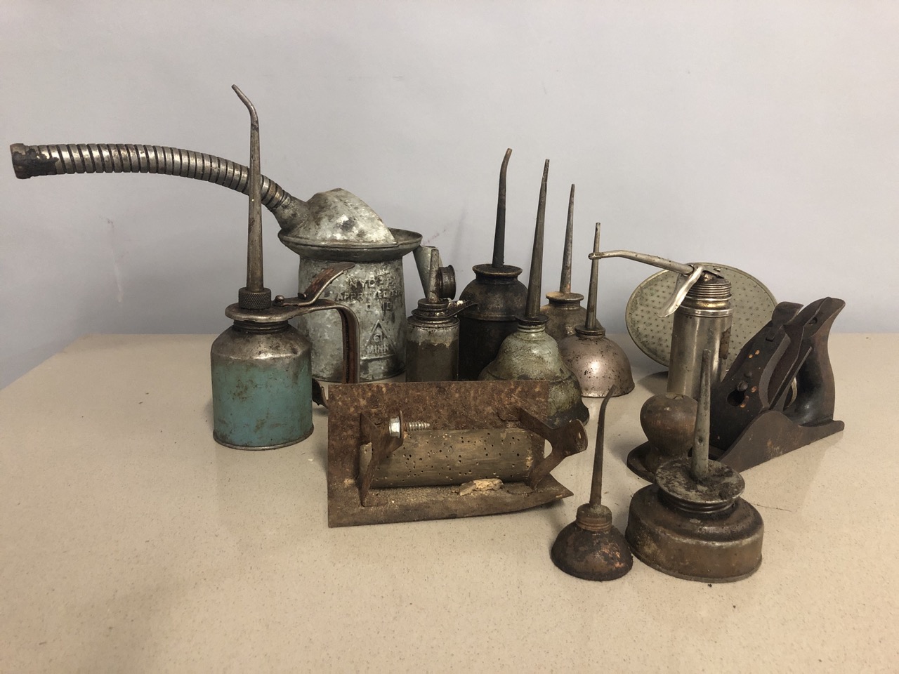 Assorted antique oil cans.