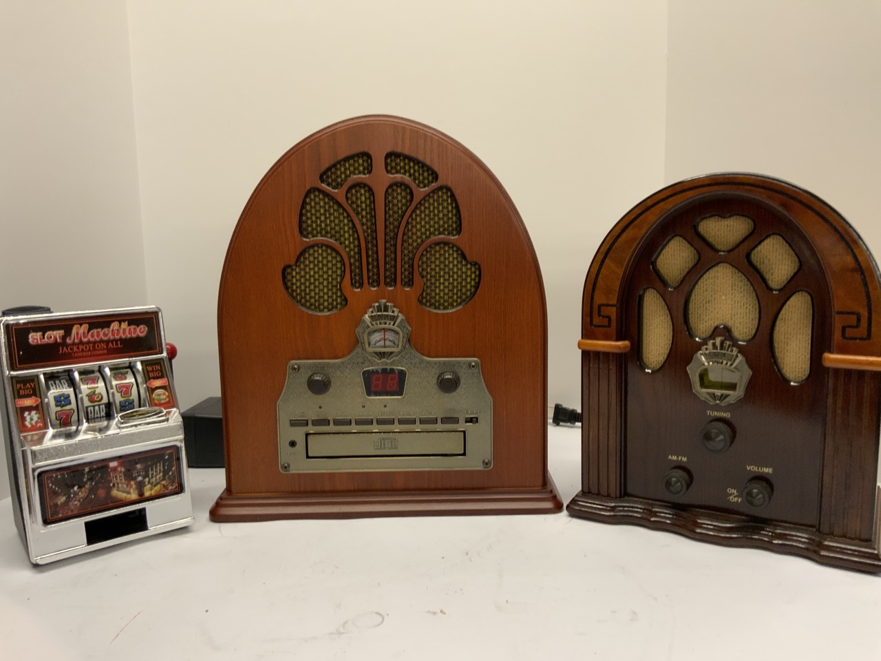 Miscellaneous decorative items including Crowley vintage look radio, Crowley vintage look CD player and toy slot machine