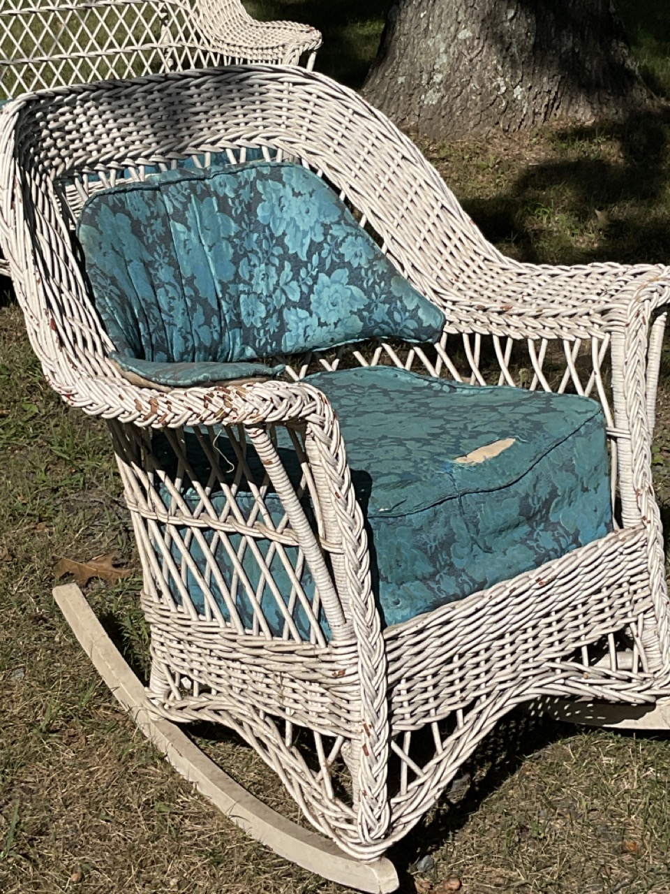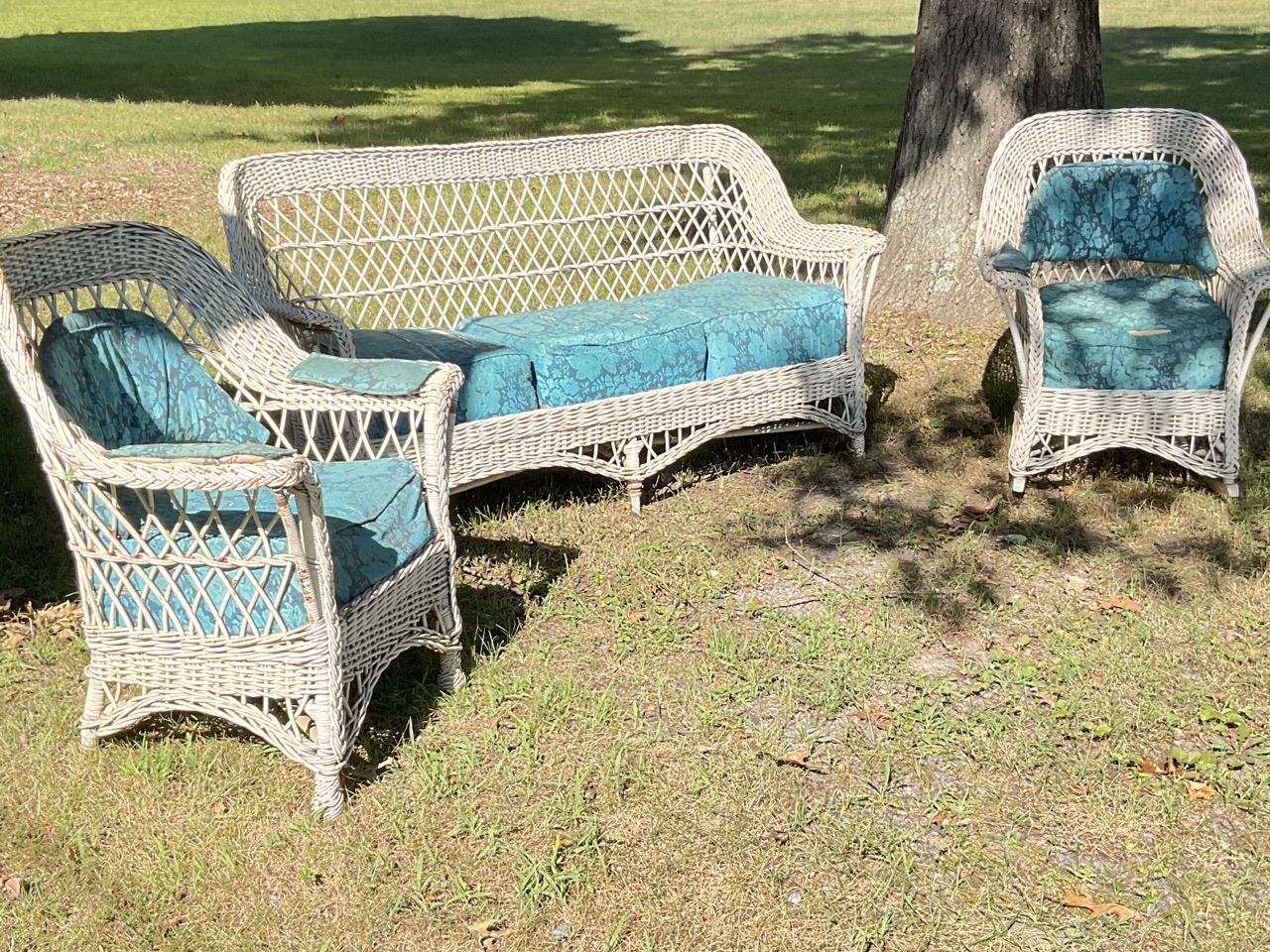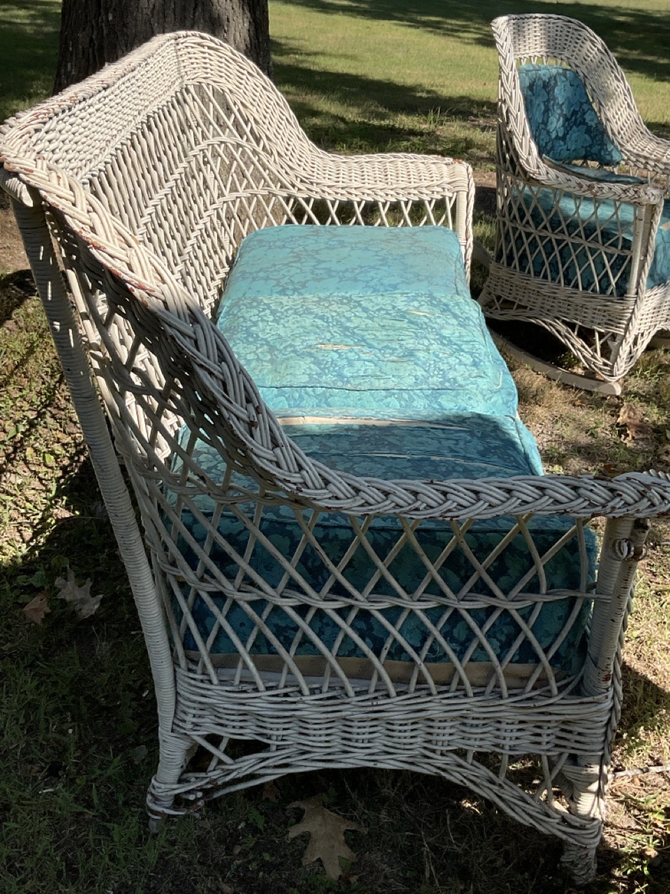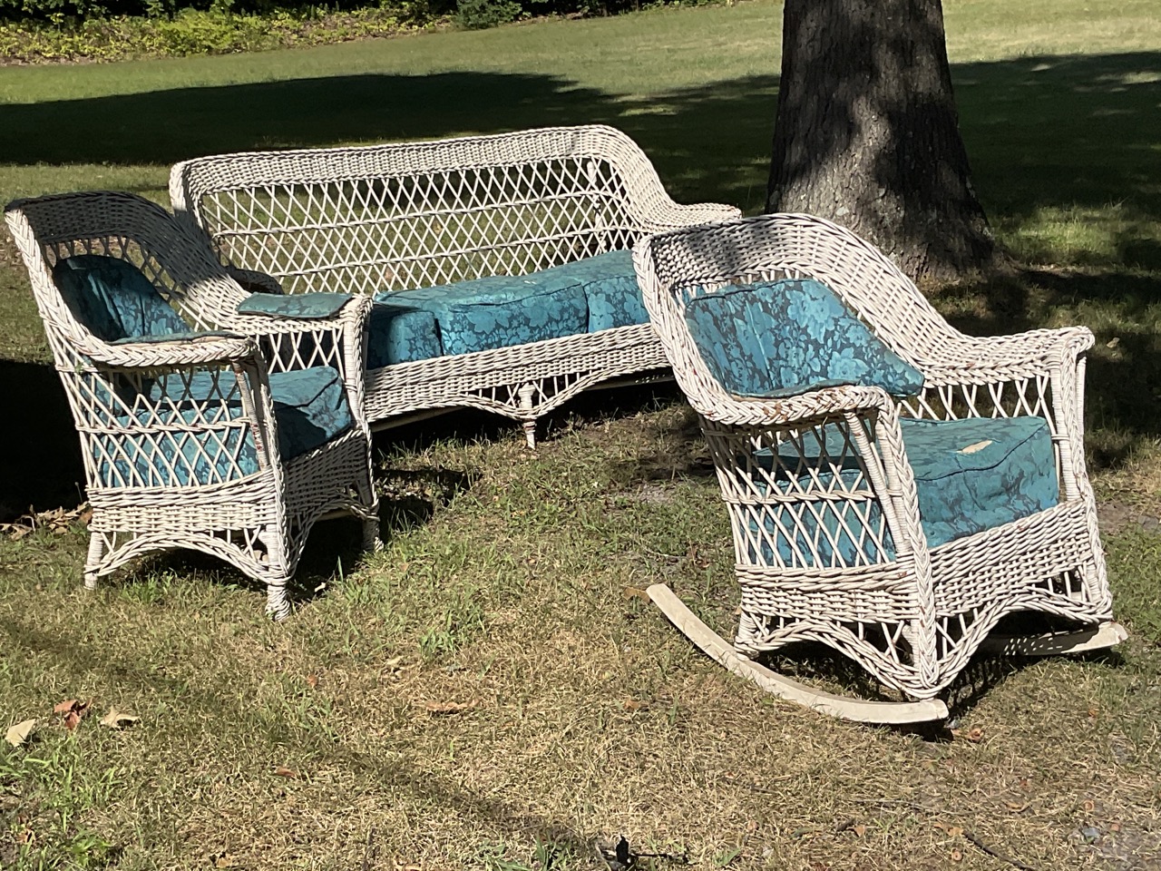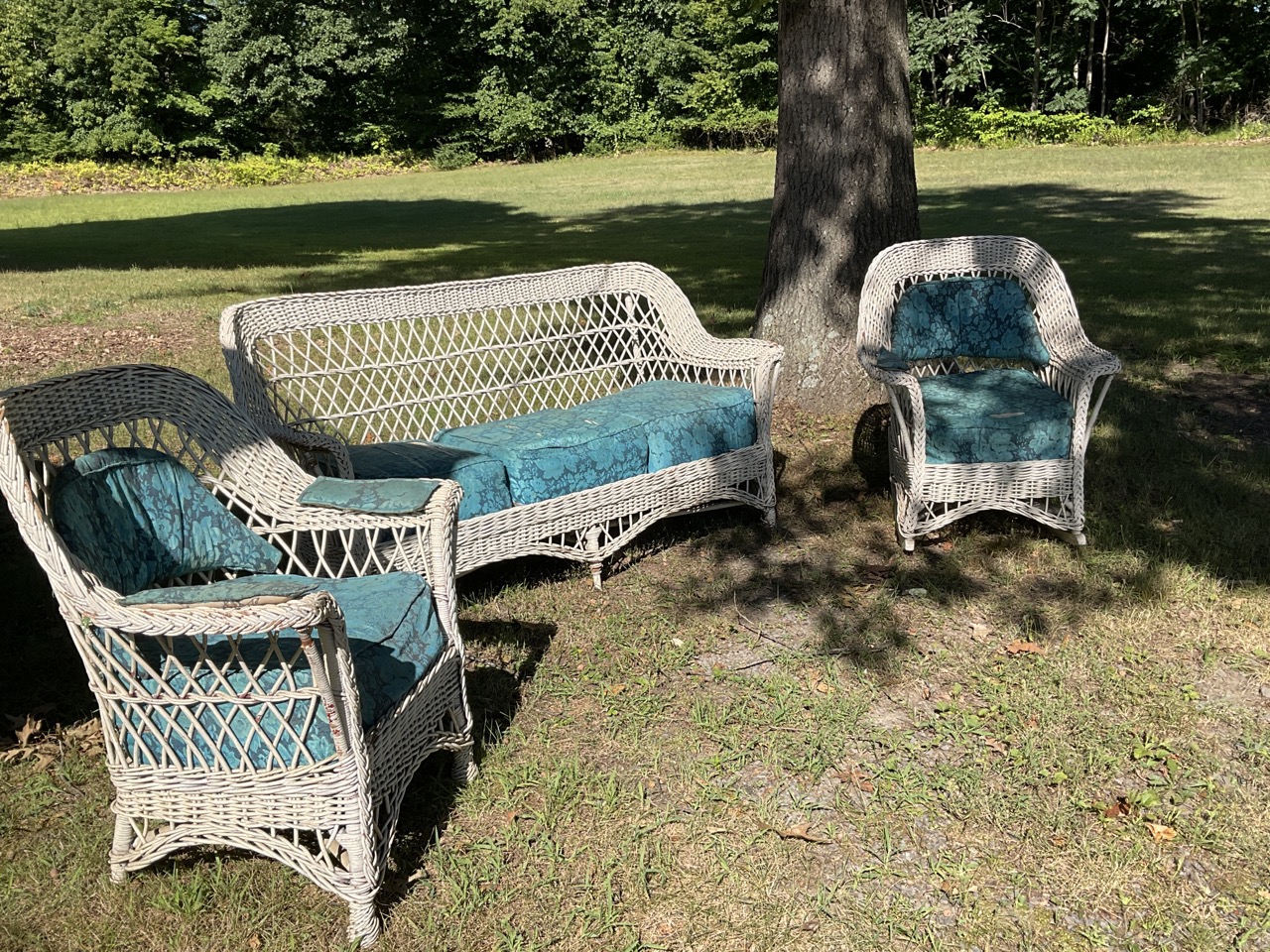 Three (3) piece antique wicker sofa, rocker and lounge chair. Early 20th century. Overall very good.
