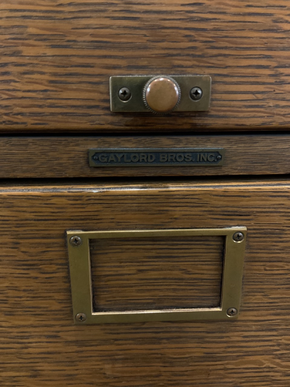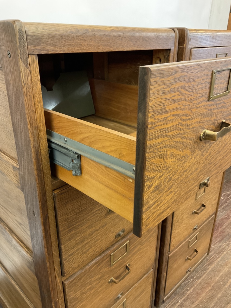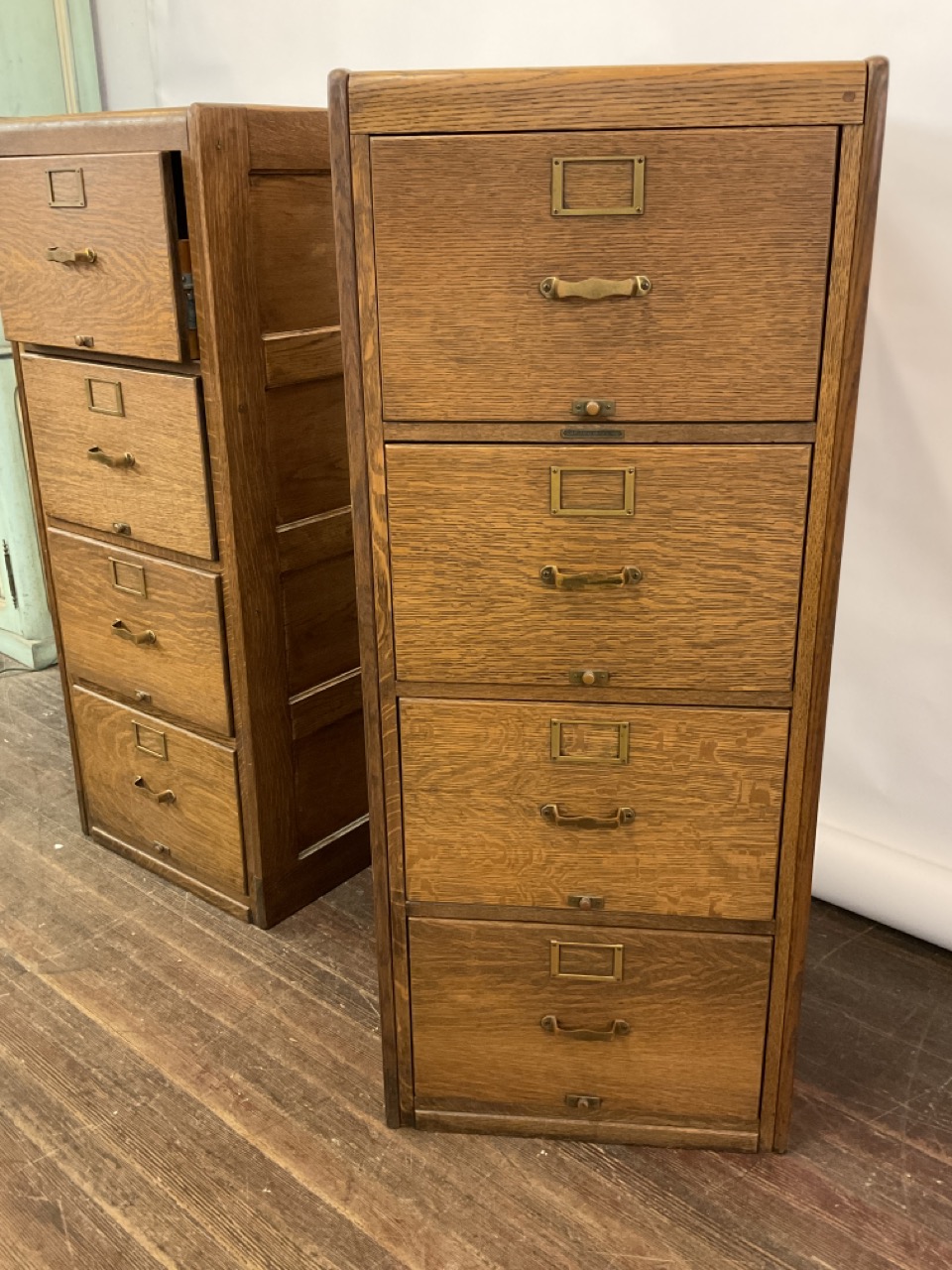A pair of oak four drawer filing cabinets. Made by Gaylord Bros.