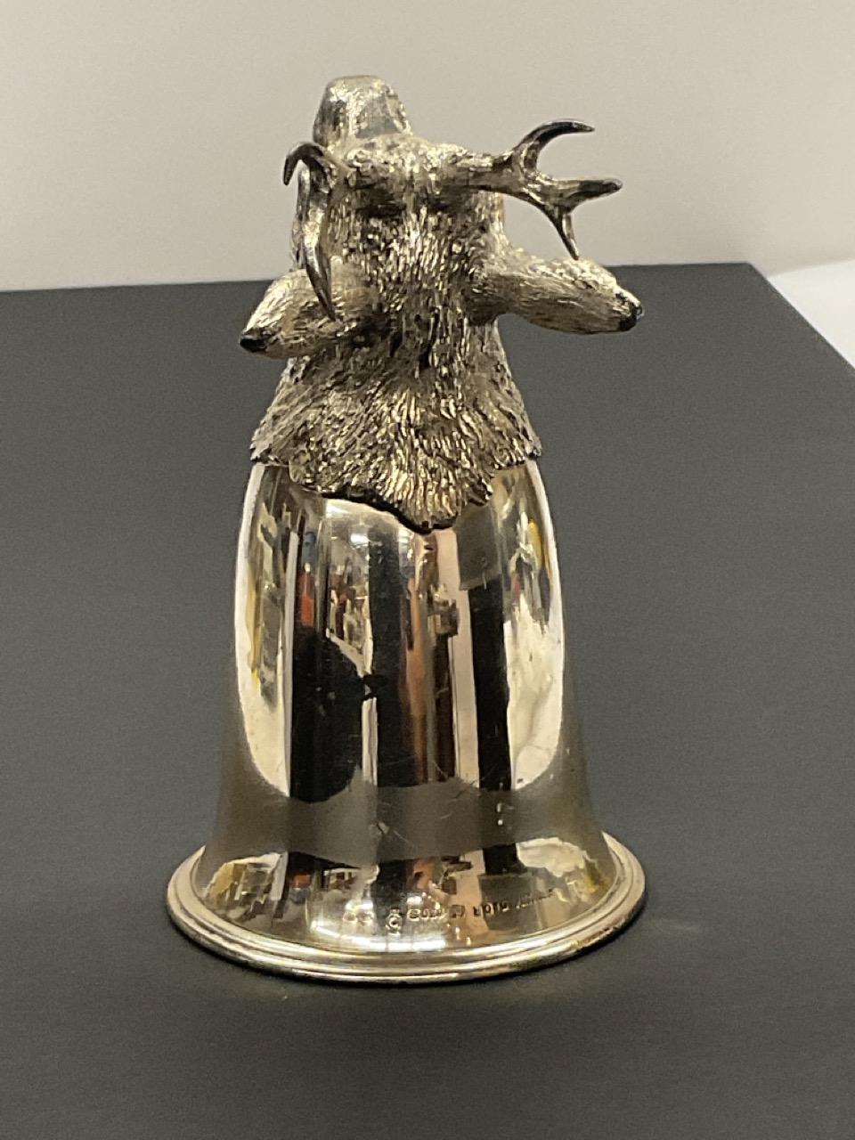 A rare 830S silver stirrup cup with figural stag head. Made in Germany