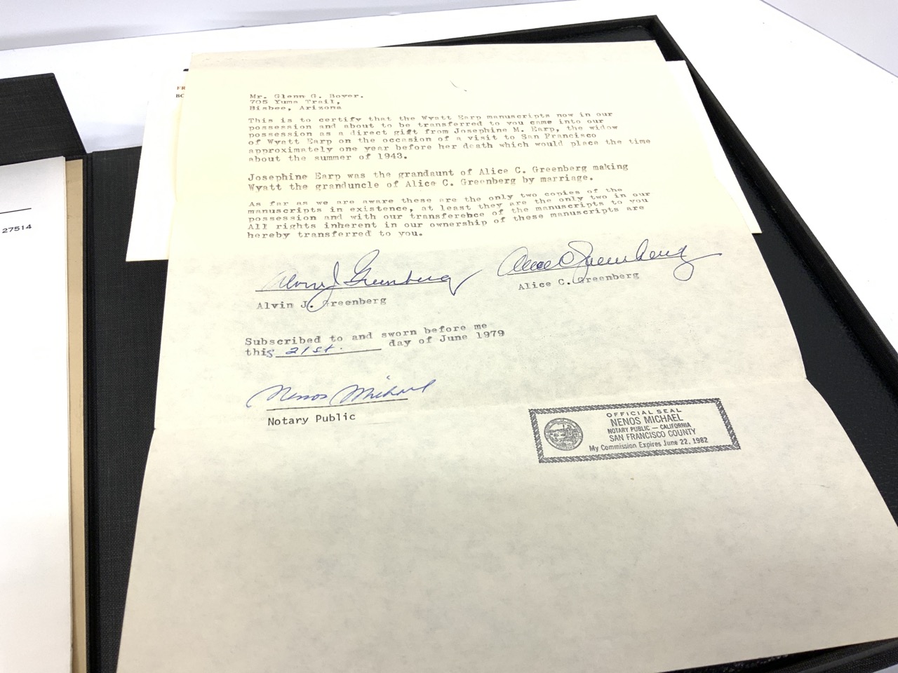 Wyatt Earp Original Typescript with hand drawn maps and diagrams. This is the personal property belonging to Wyatt Earp and given as a direct gift from his wife Josephine M. Earp one year before her death in the summer of 1943. A sworn letter written to Mr. Glenn G. Boyer on the 21st day of June 1979 and notorized. Signed by Alvin J. Greenberg and Alice C. Greenburg (Grandniece of Wyatt and Josephine Earp) proving authenticity.