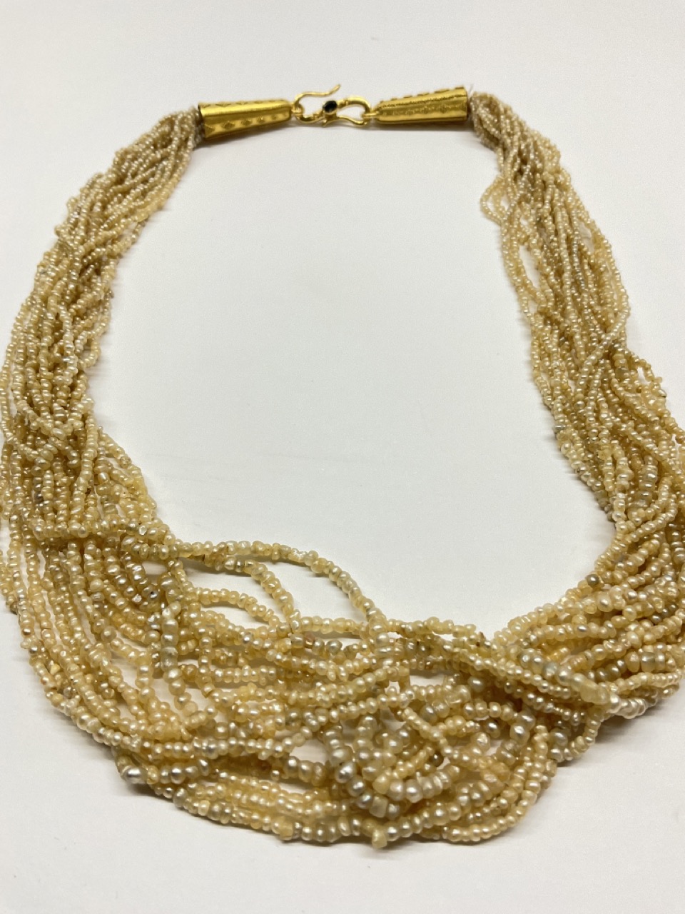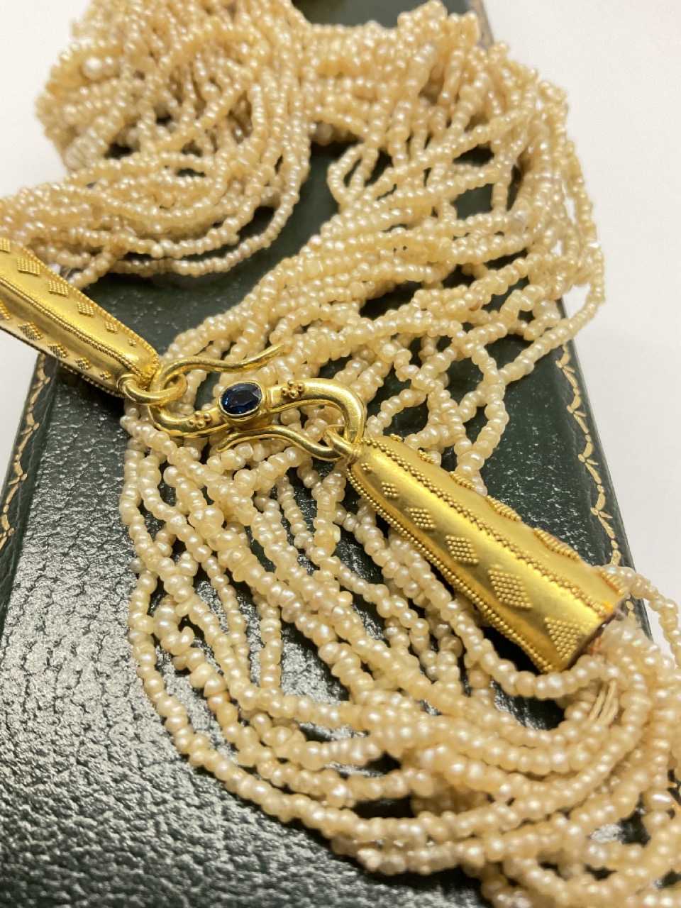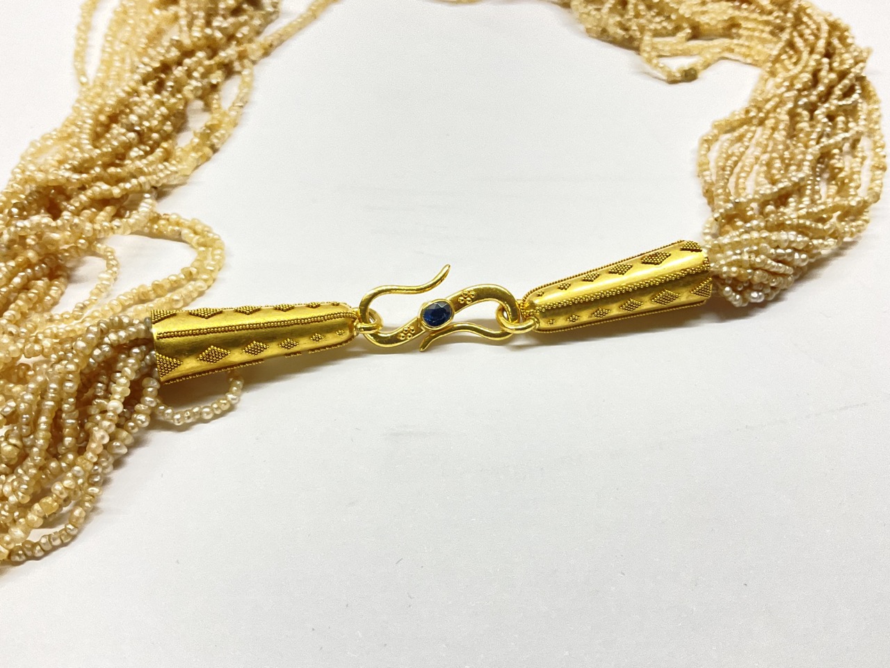 Multi-strand pearl necklace with 22k clasp with pearl and blue sapphire stone.