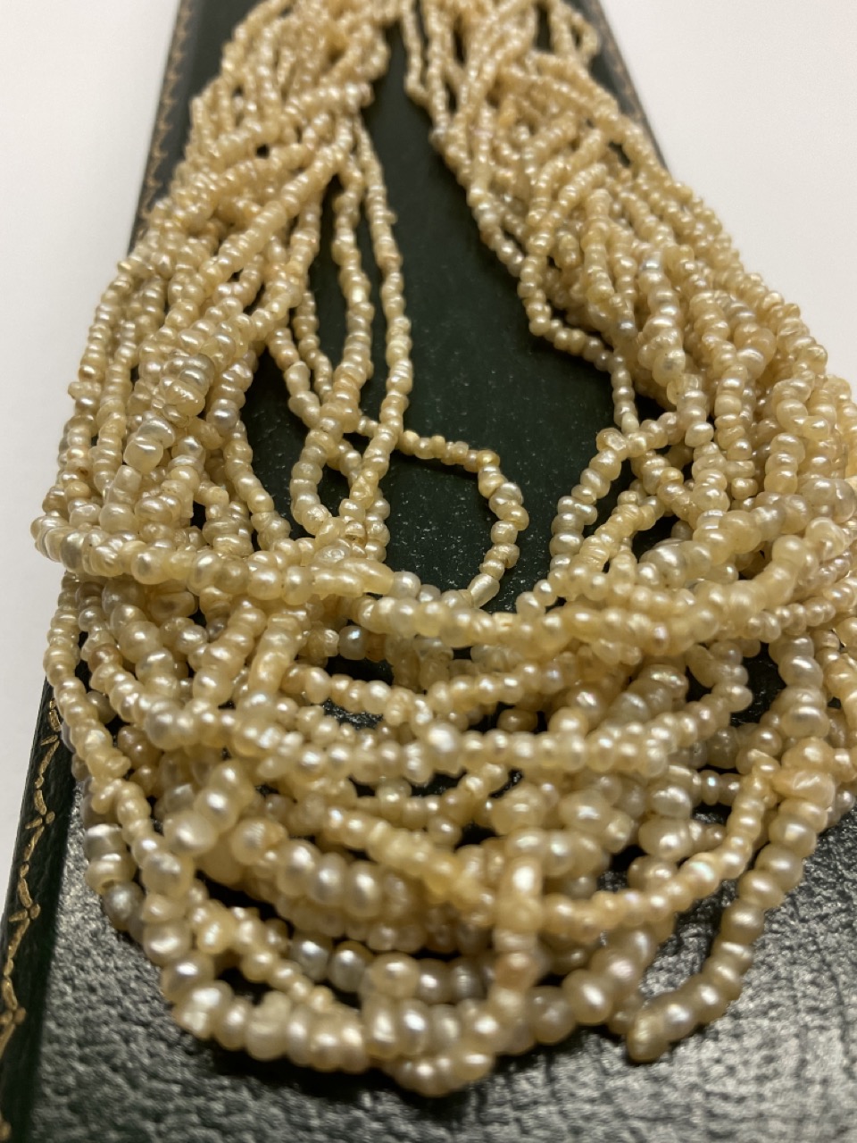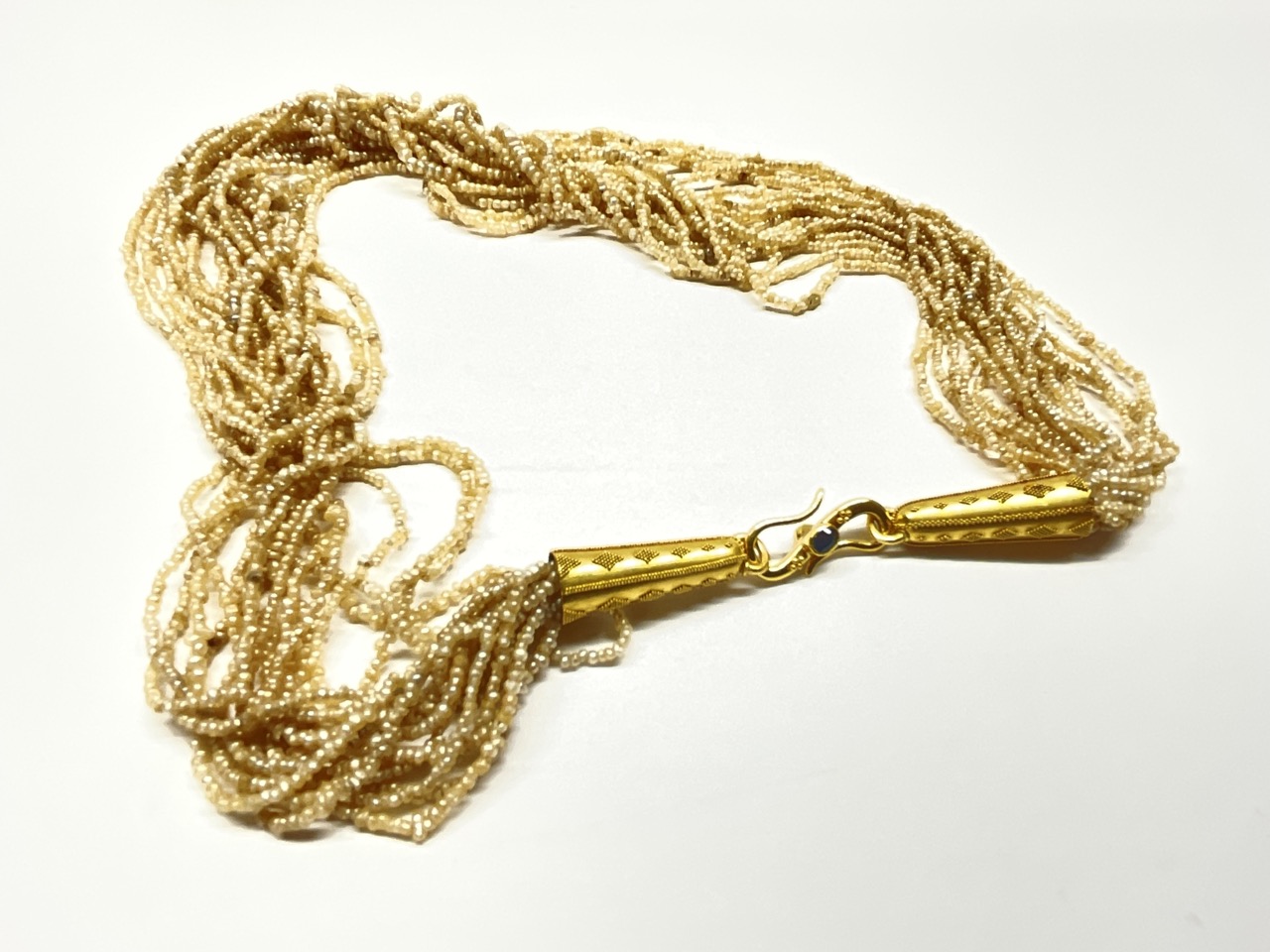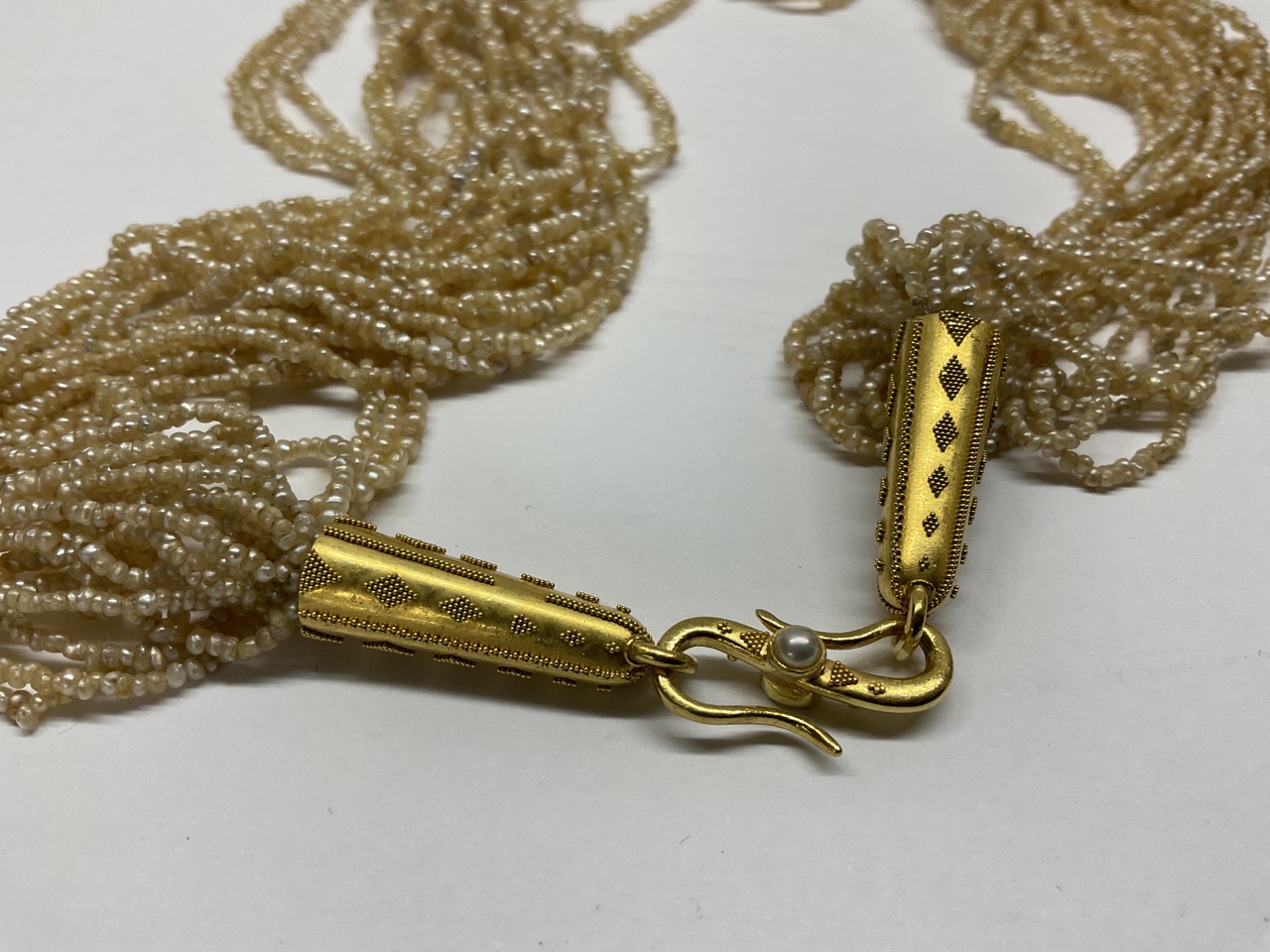 Multi-strand pearl necklace with 22k clasp with pearl and blue sapphire stone.