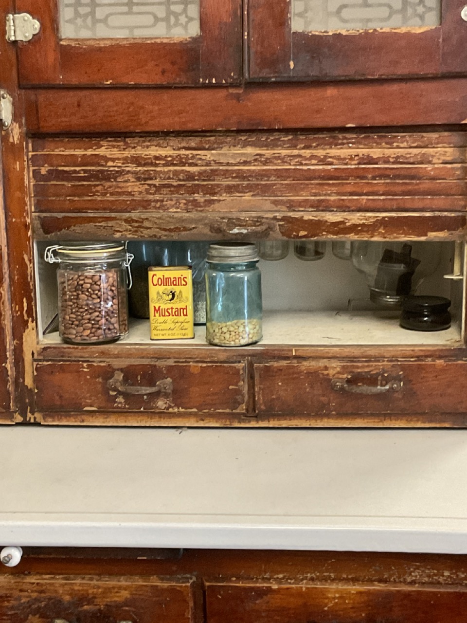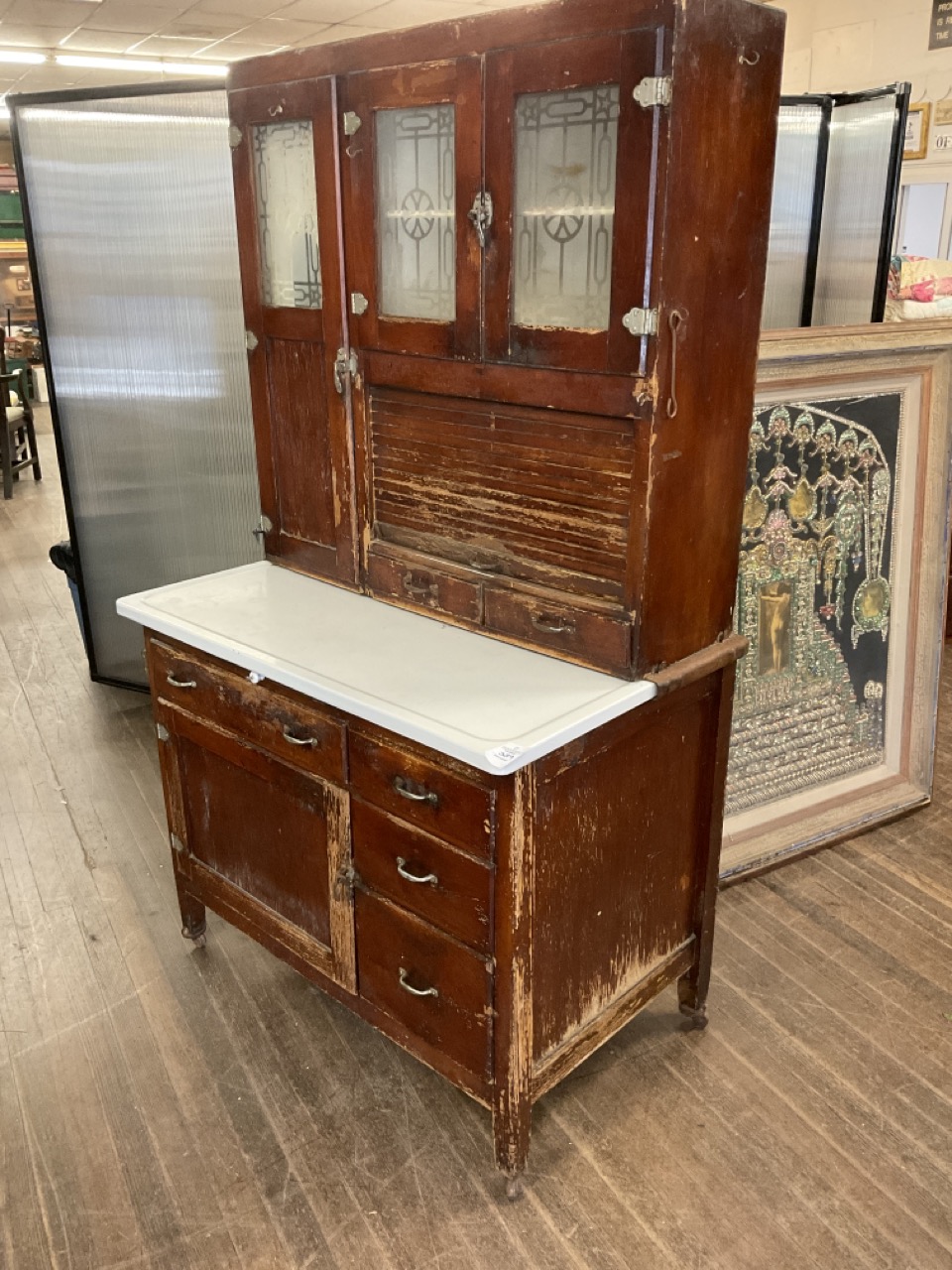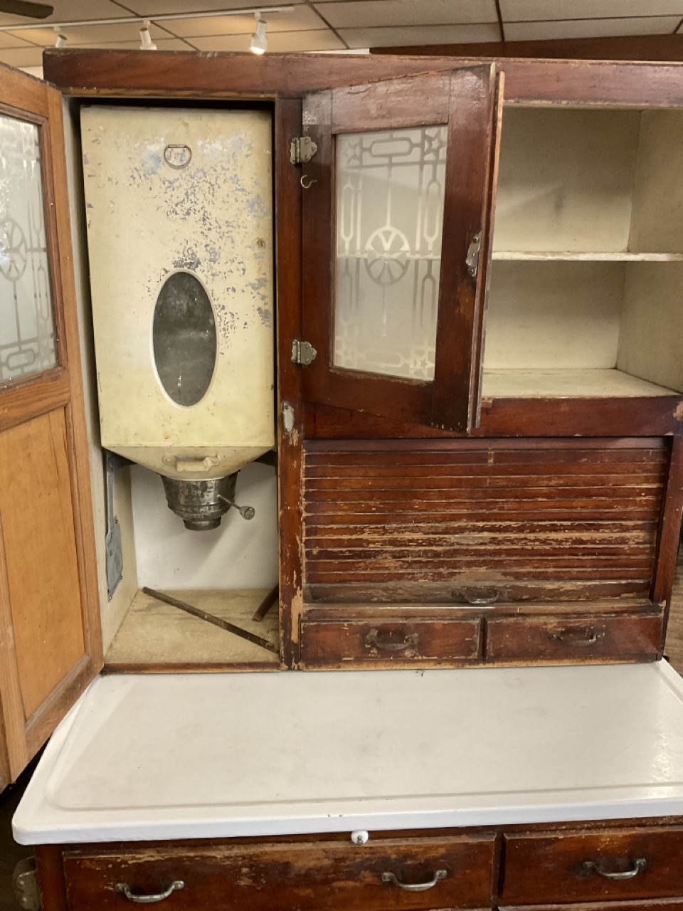Antique Hoosier cabinet with frosted glass doors. Dimensions: 70" X 39" X 25"