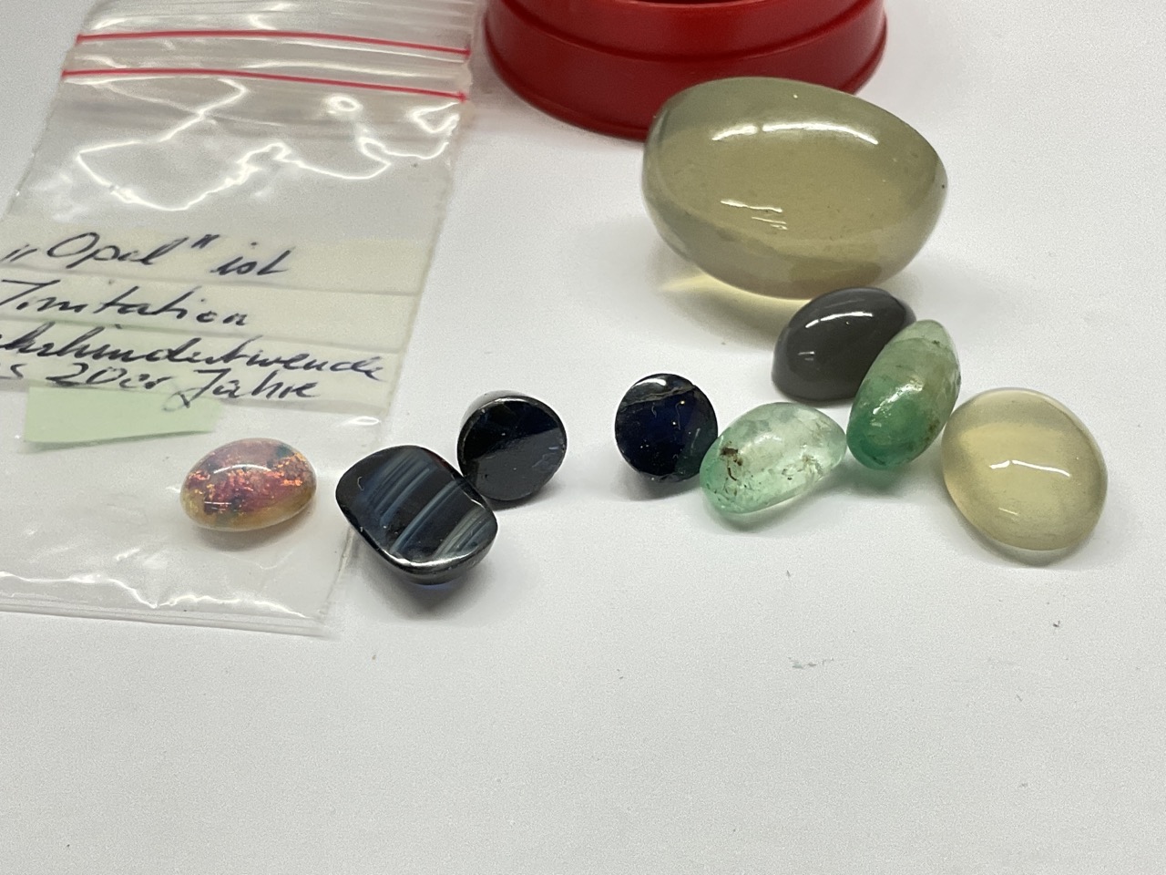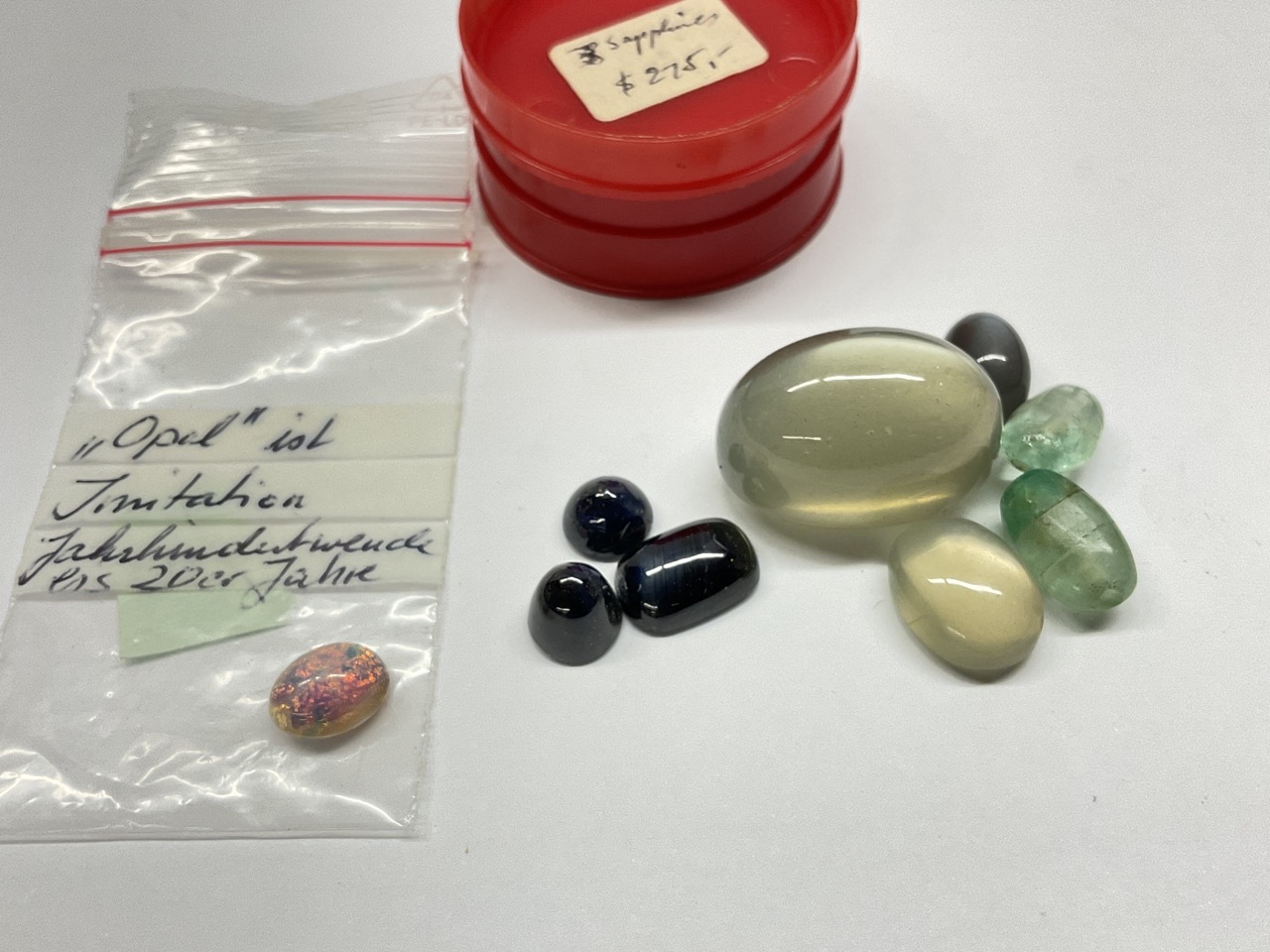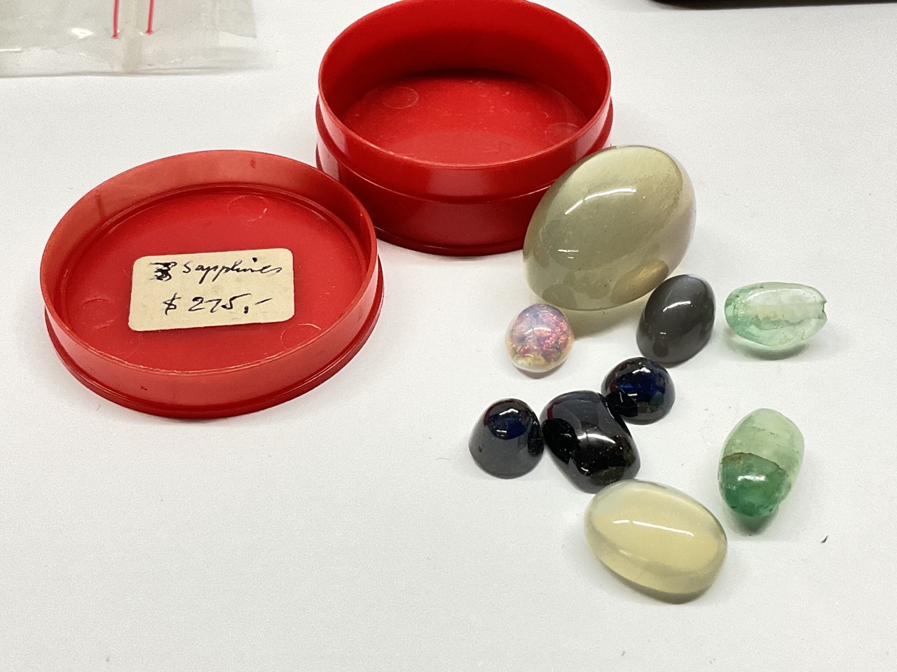 A compiled grouping of estate found gemstones. As seen in photograph preview. Including three (3) blue sapphires, opals etc.