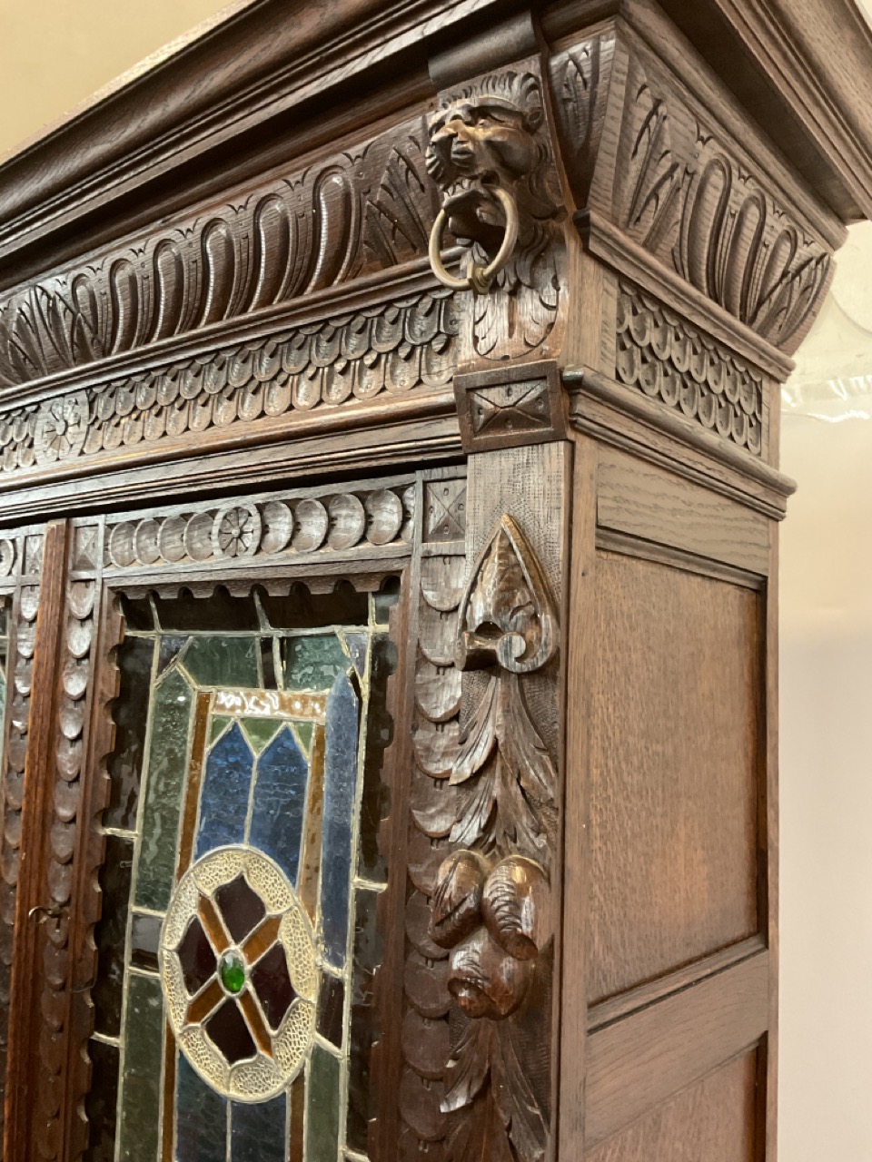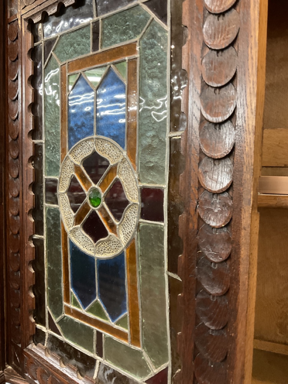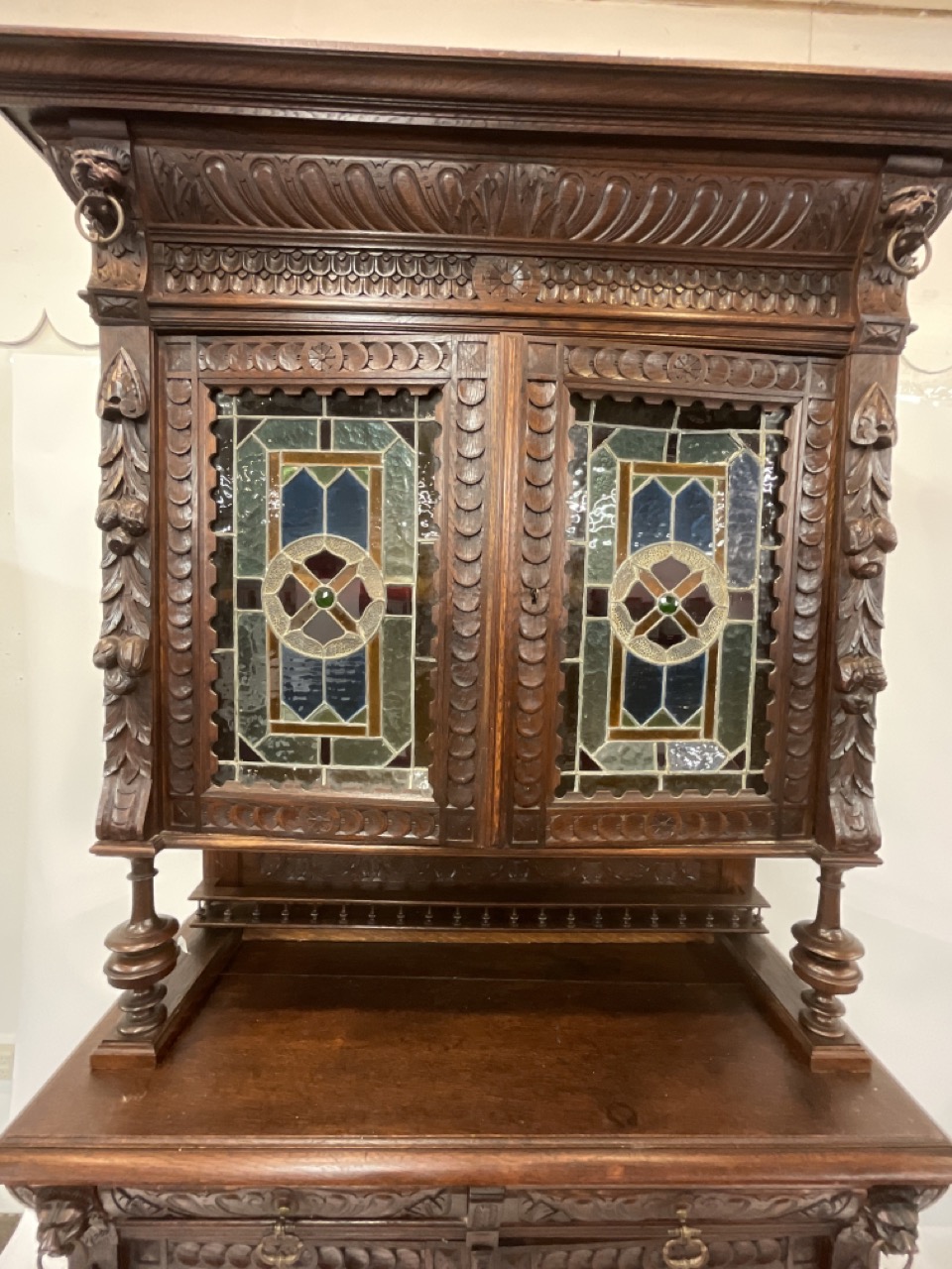 Heavily Carved European Dark Oak Hutch Cabinet with Jeweled Stain Glass Two Door Glass Panels.