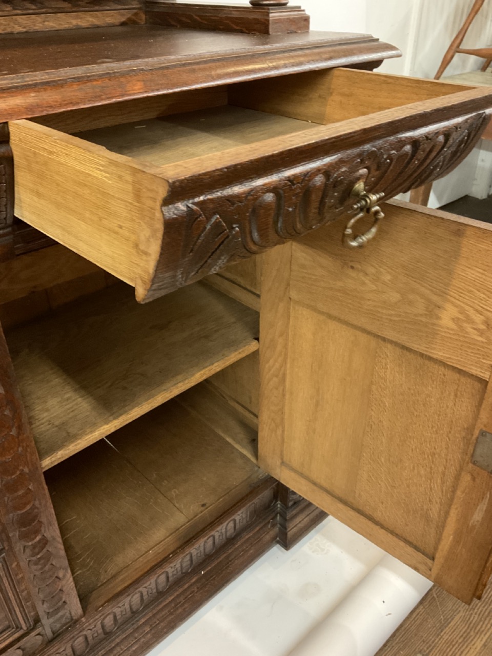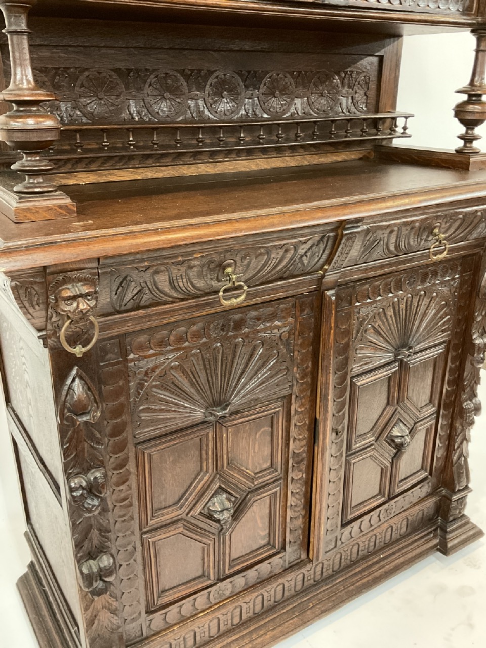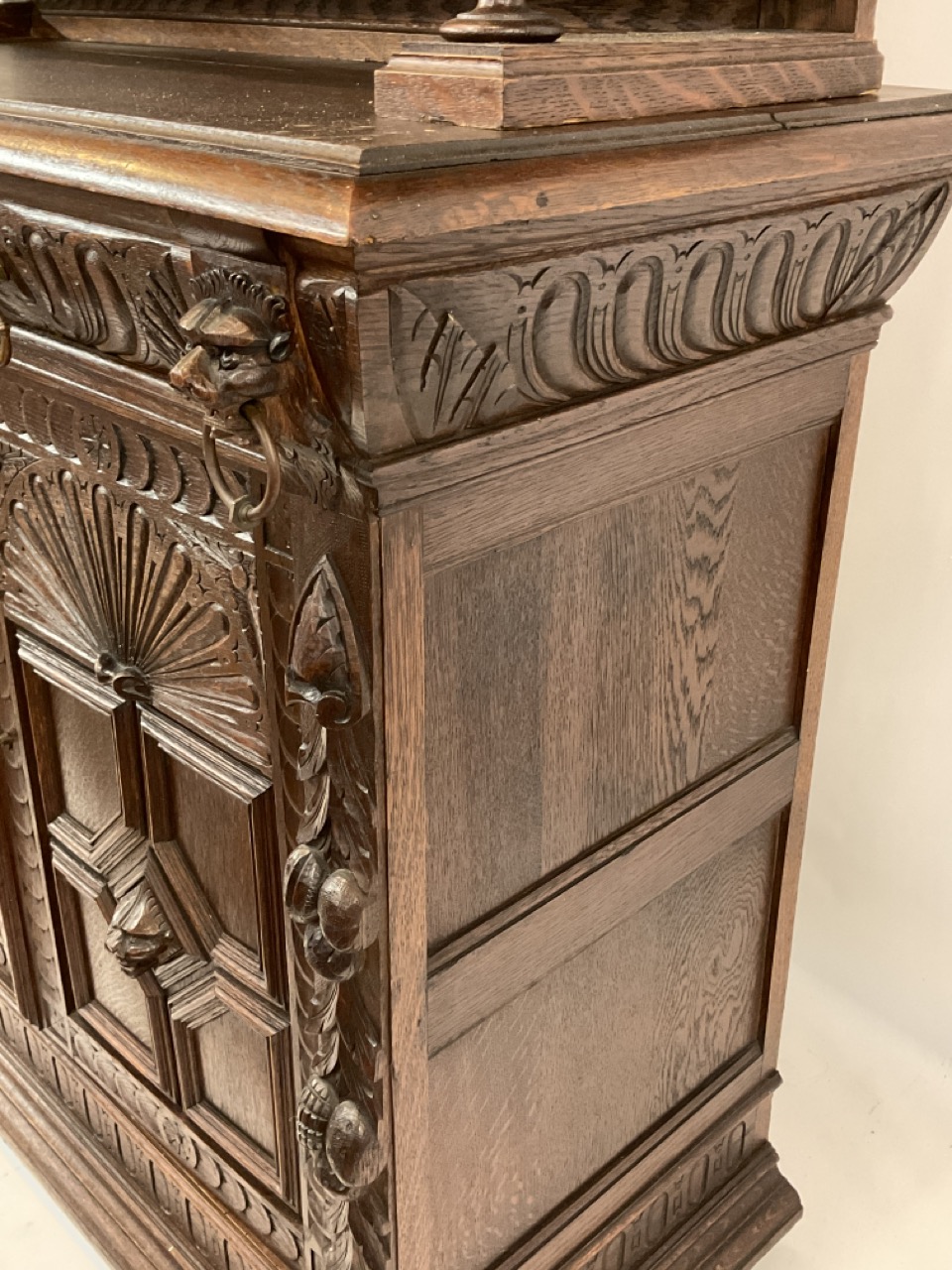 Heavily Carved European Dark Oak Hutch Cabinet with Jeweled Stain Glass Two Door Glass Panels.