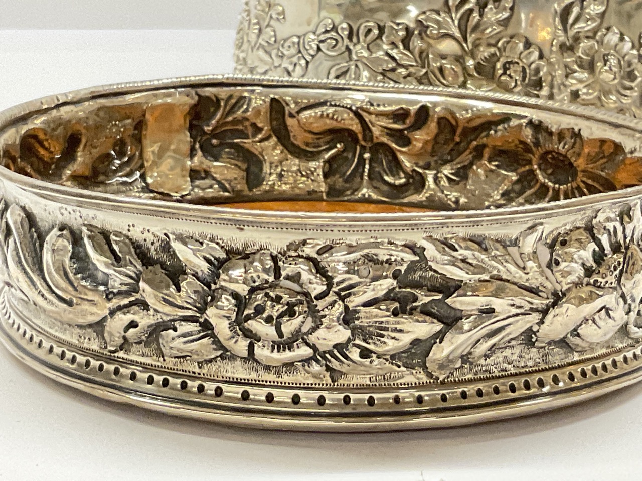 Two (2) Antique sterling silver wine coasters with wood coaster bottoms.
