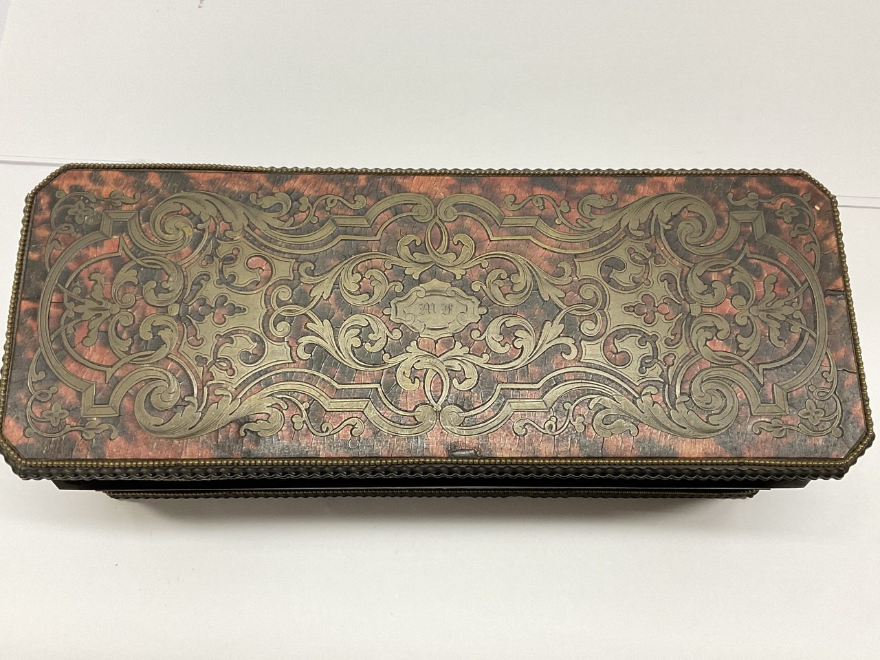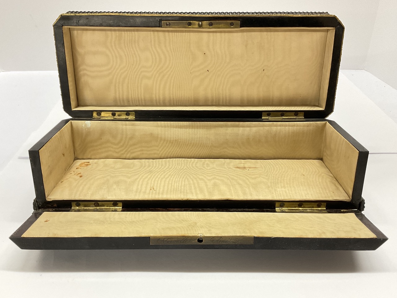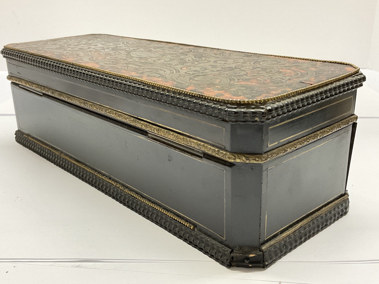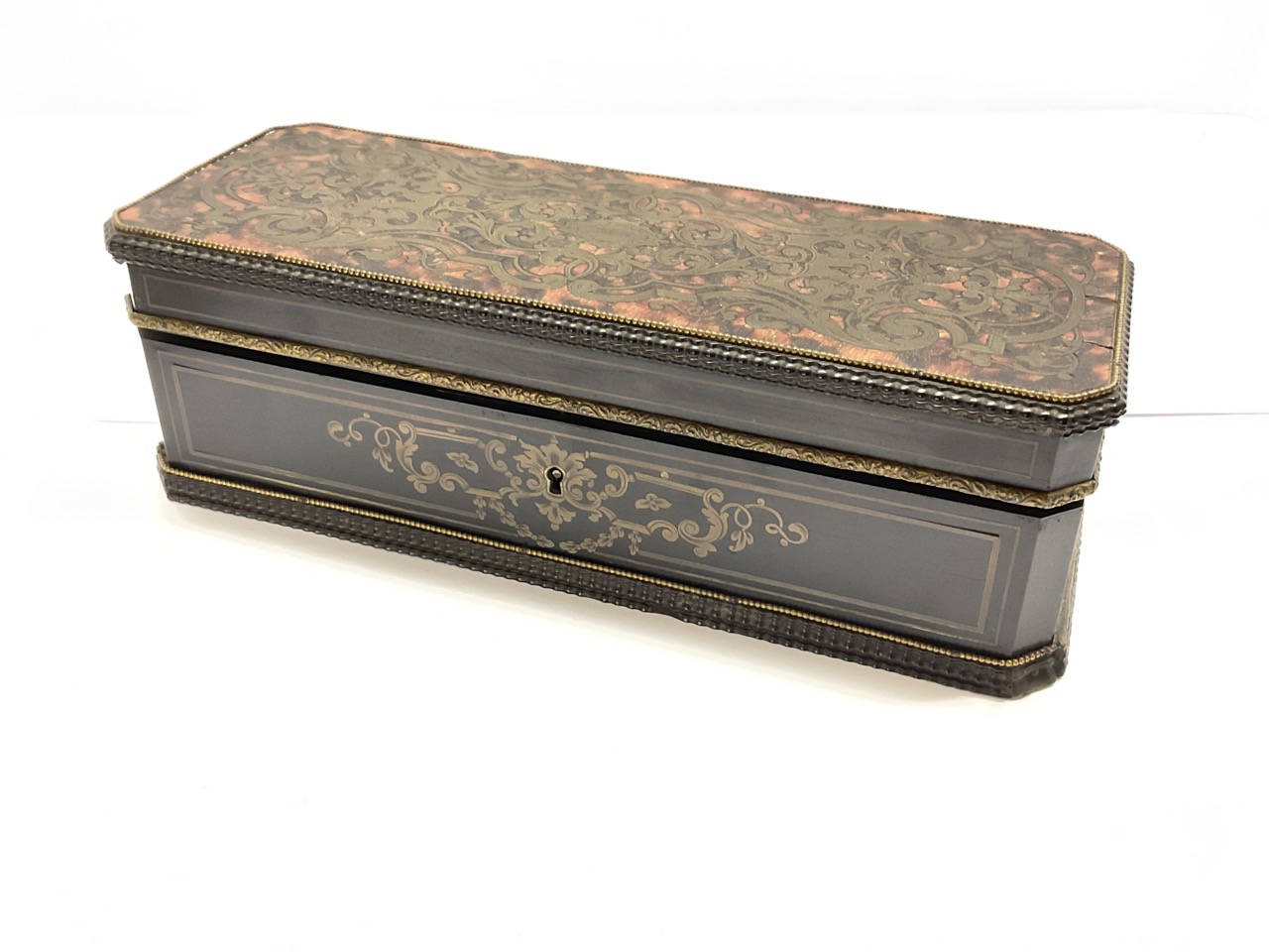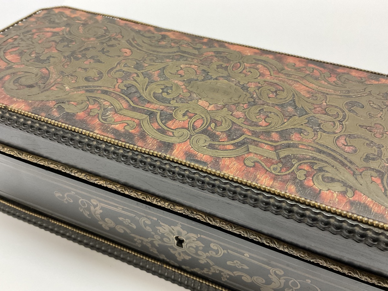 19th c. ebonized wood Boulle style with brass inlay. No key present. Signed at top of lock mechanism.