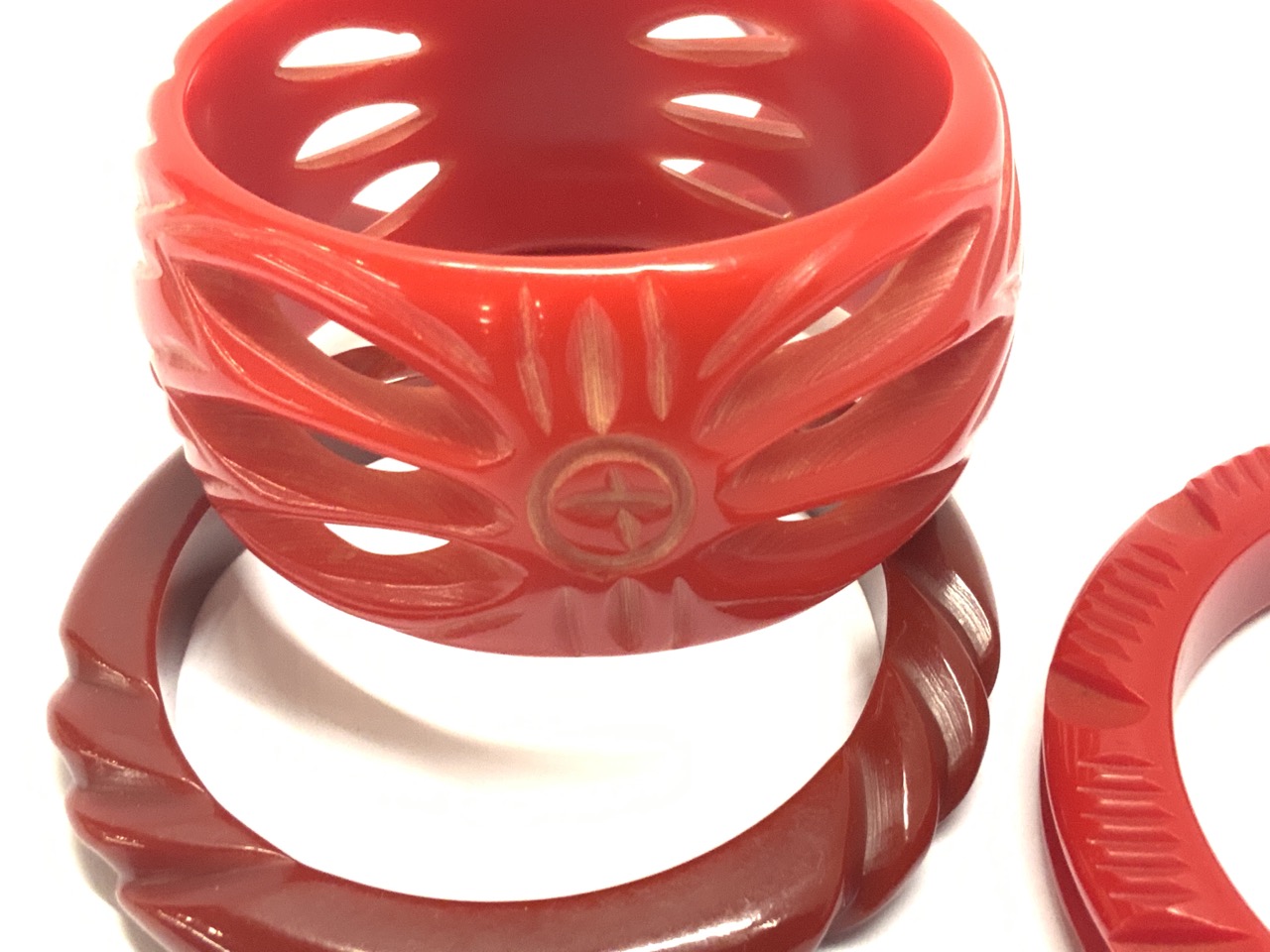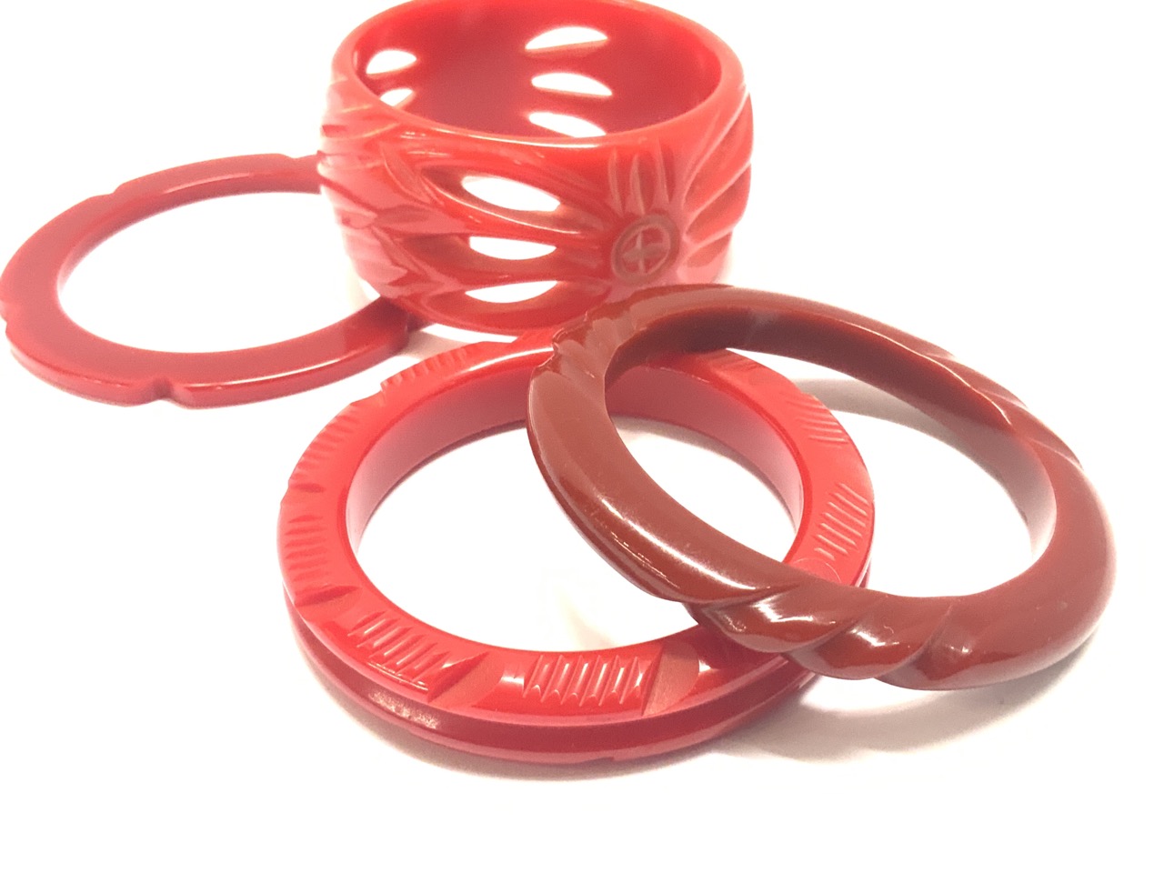 Four (4) Carved Red Bakelite Bangle Bracelets