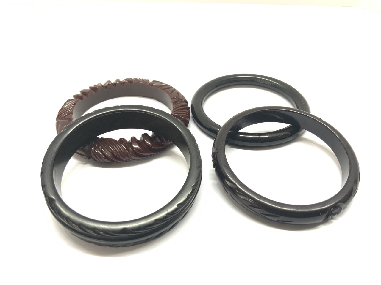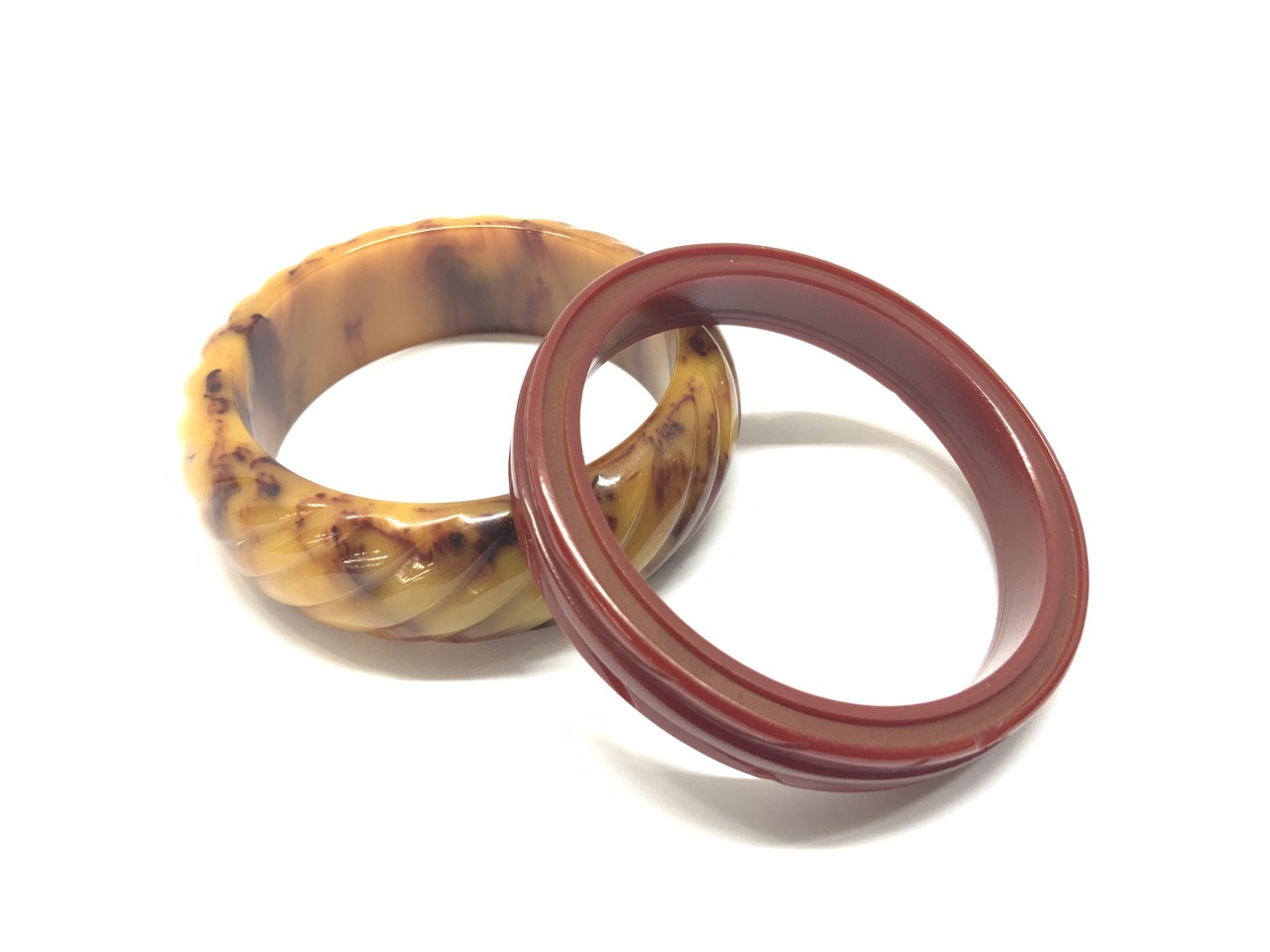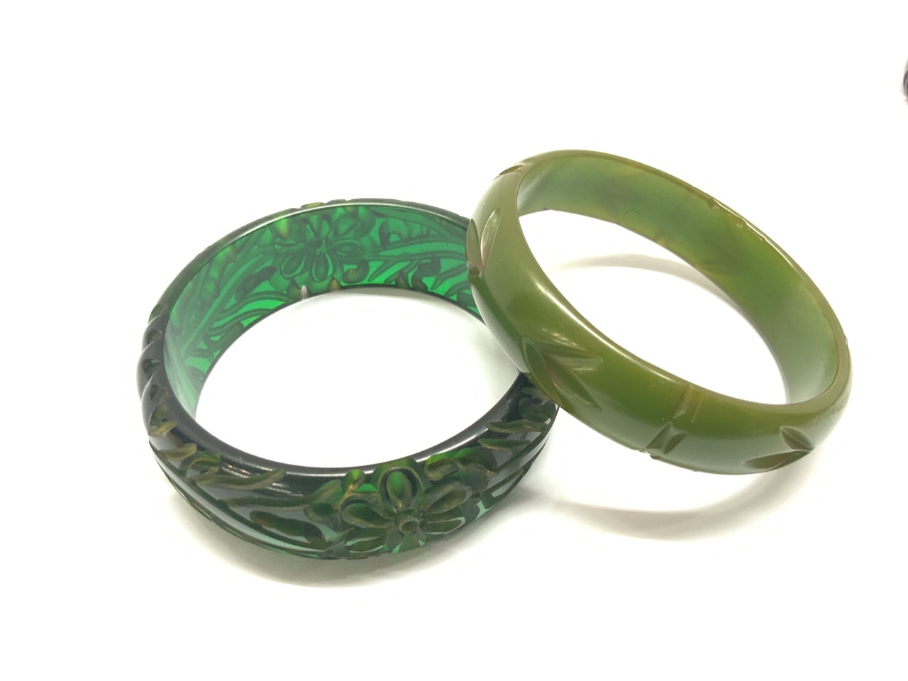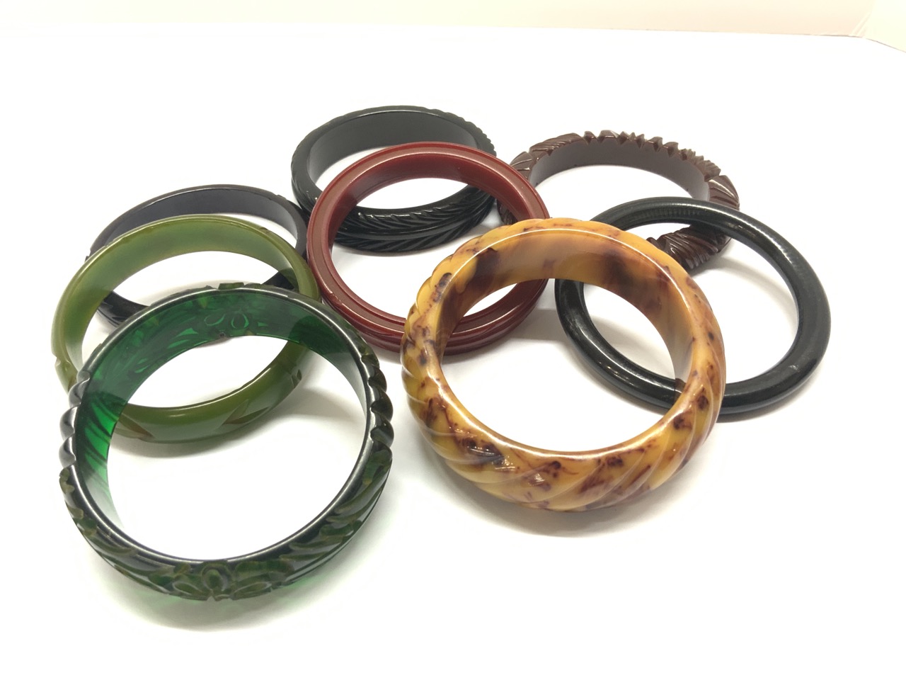 Eight (8) Carved Bakelite Bangle Bracelets including green, marblelized caramel, brown, brick red etc.