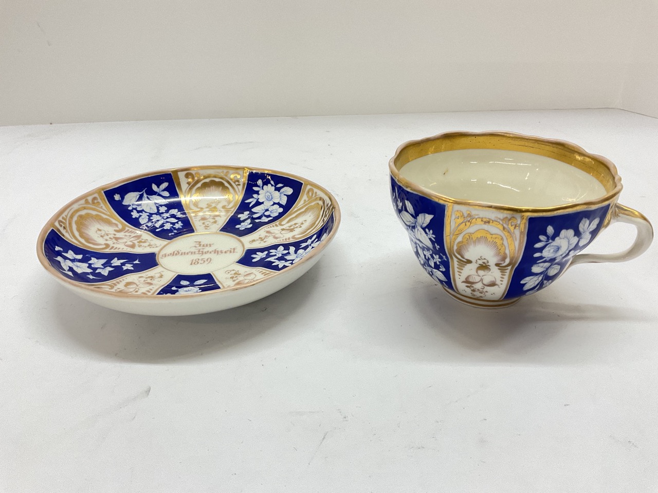 19th c. KPM porcelain commemorative teacup and saucer. Dated 1859.
